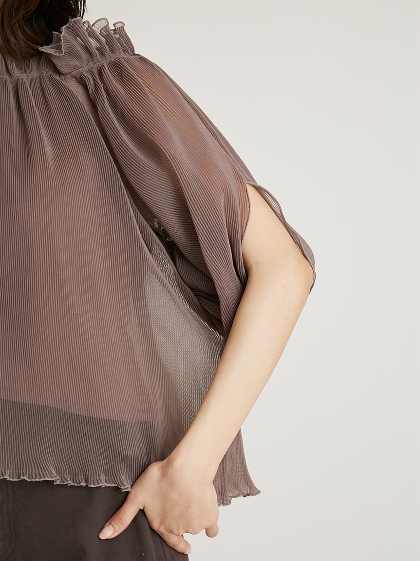 網目の少し粗いメッシュ生地に幅の狭いクリスタルプリーツをかけて繊細に仕上げました。ピュアな印象のホワイト、大人っぽい雰囲気を与えるモカ、目を引く鮮やかな色合いのピンクの3色展開です。