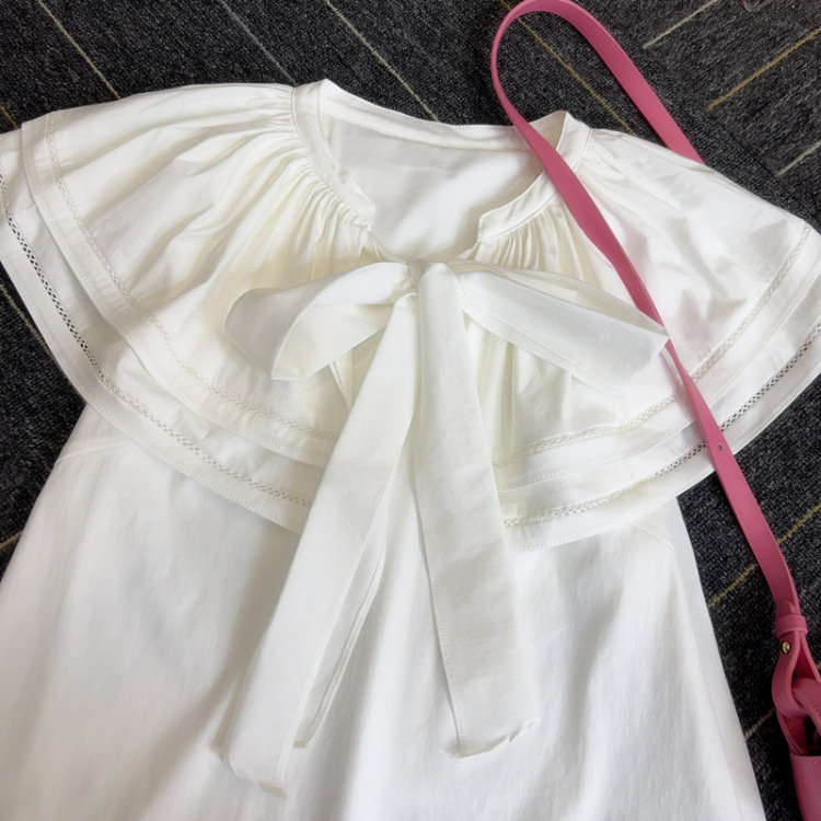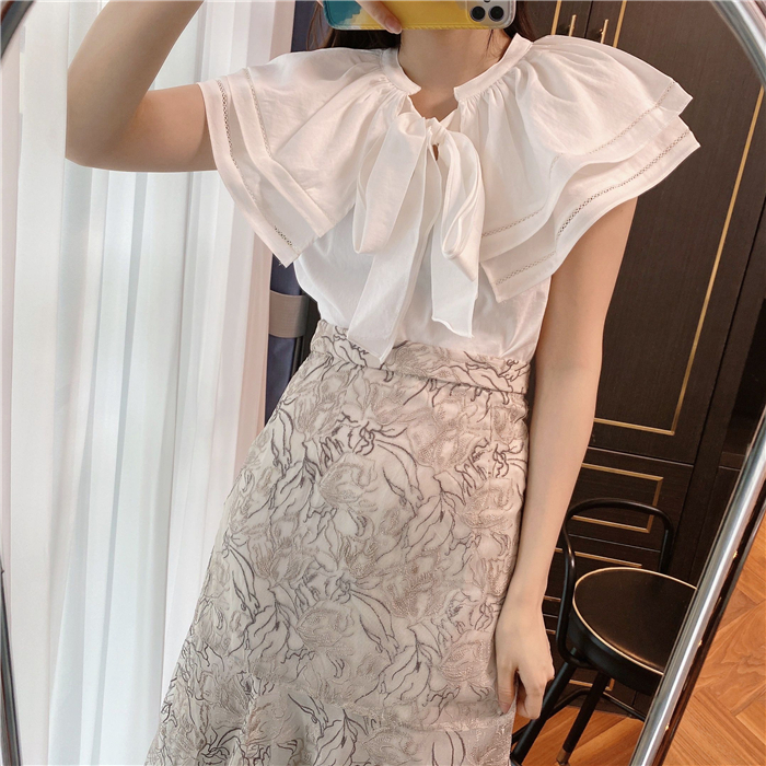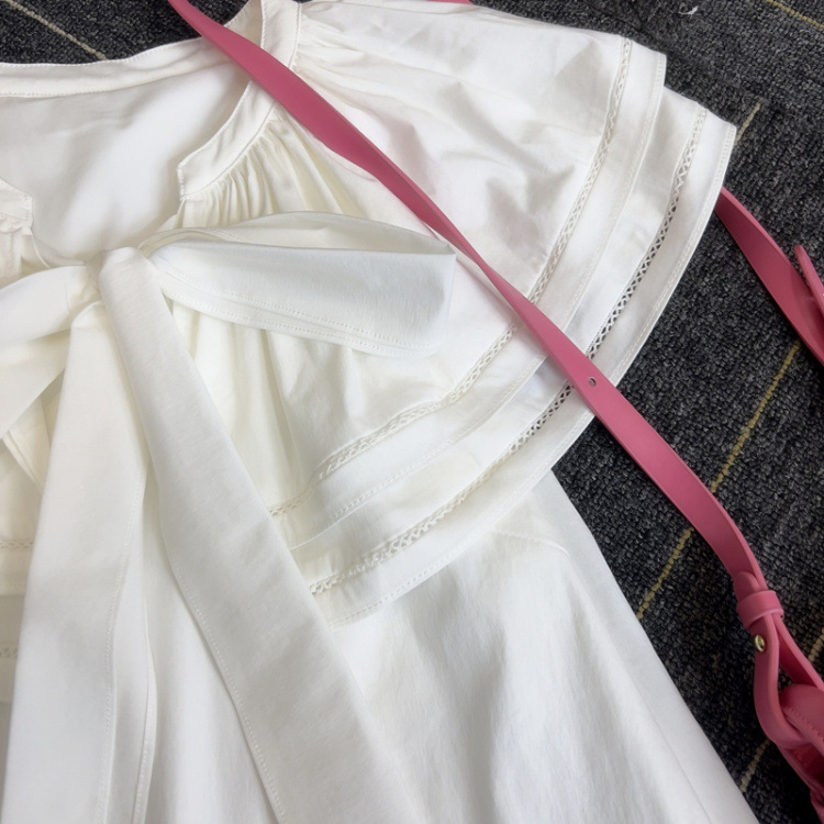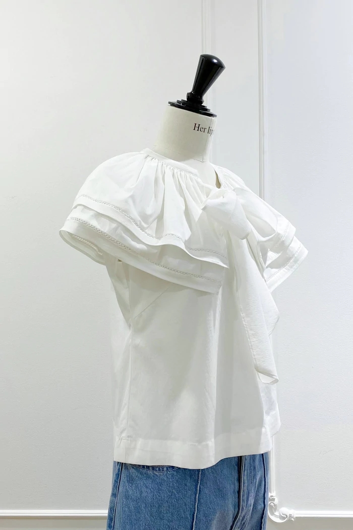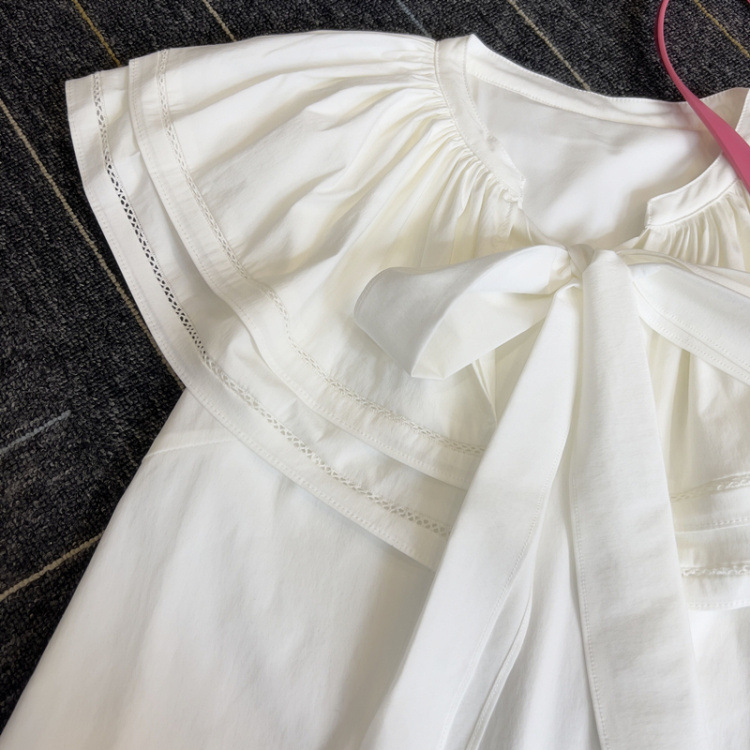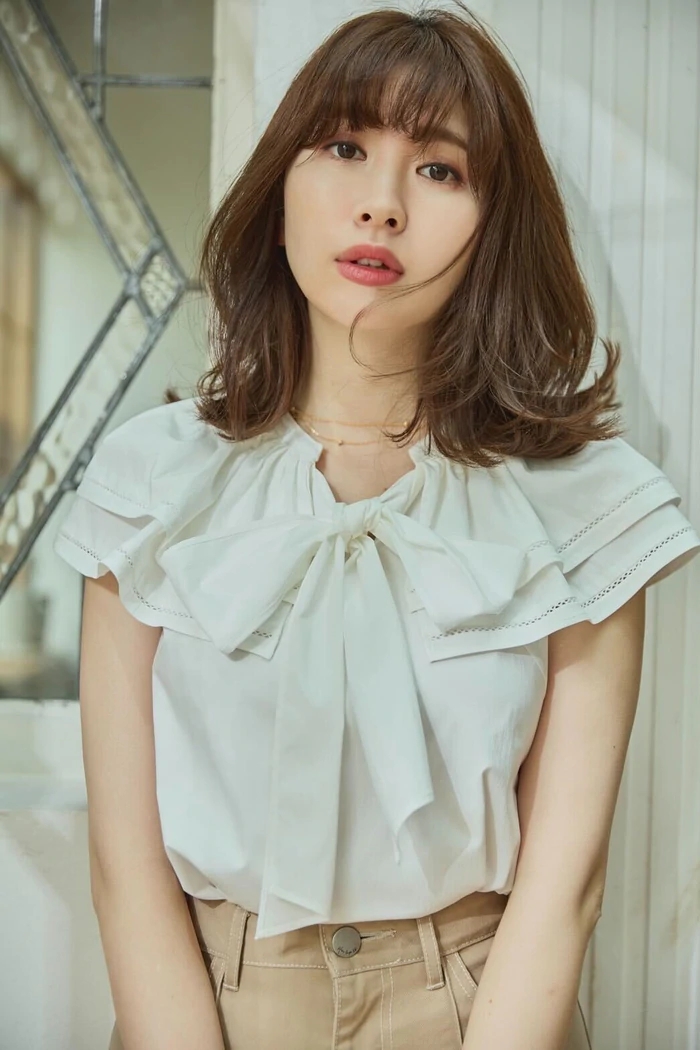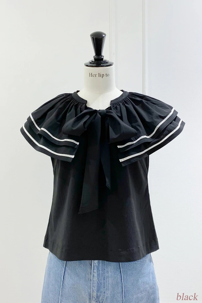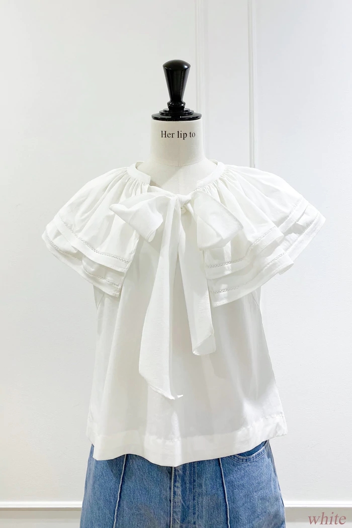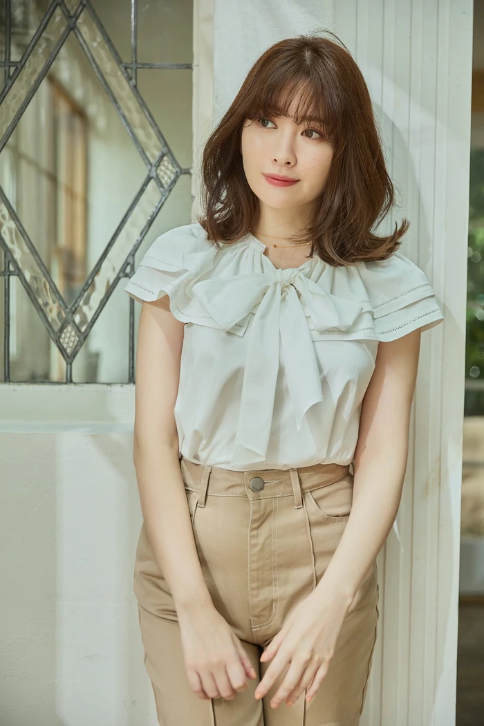 立体的なはしごレース付きWカラーがポイントのボウタイブラウス。