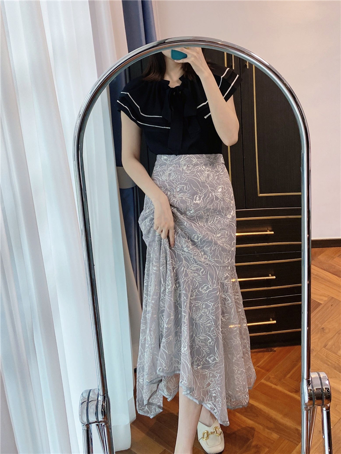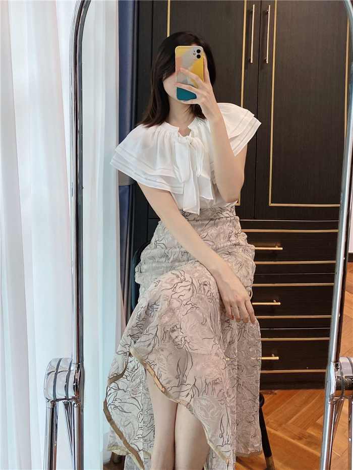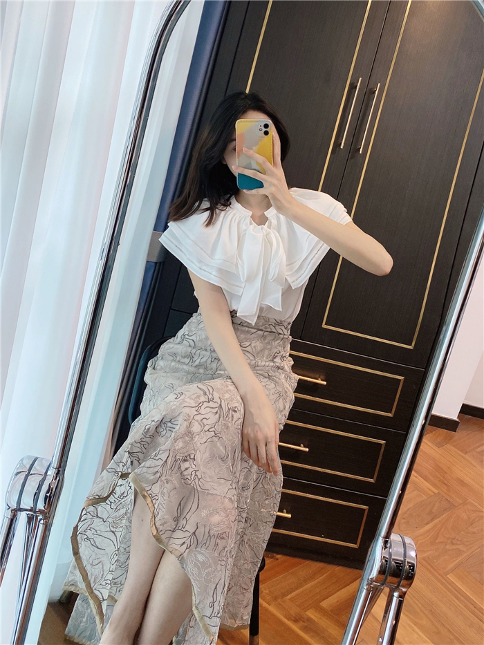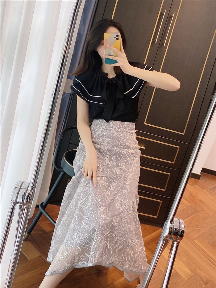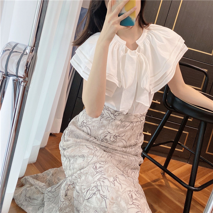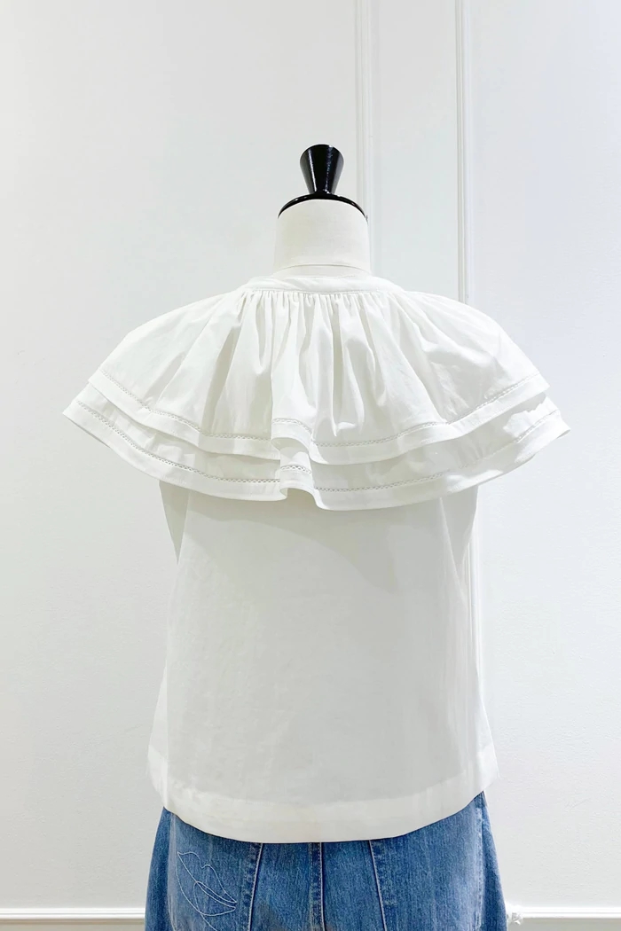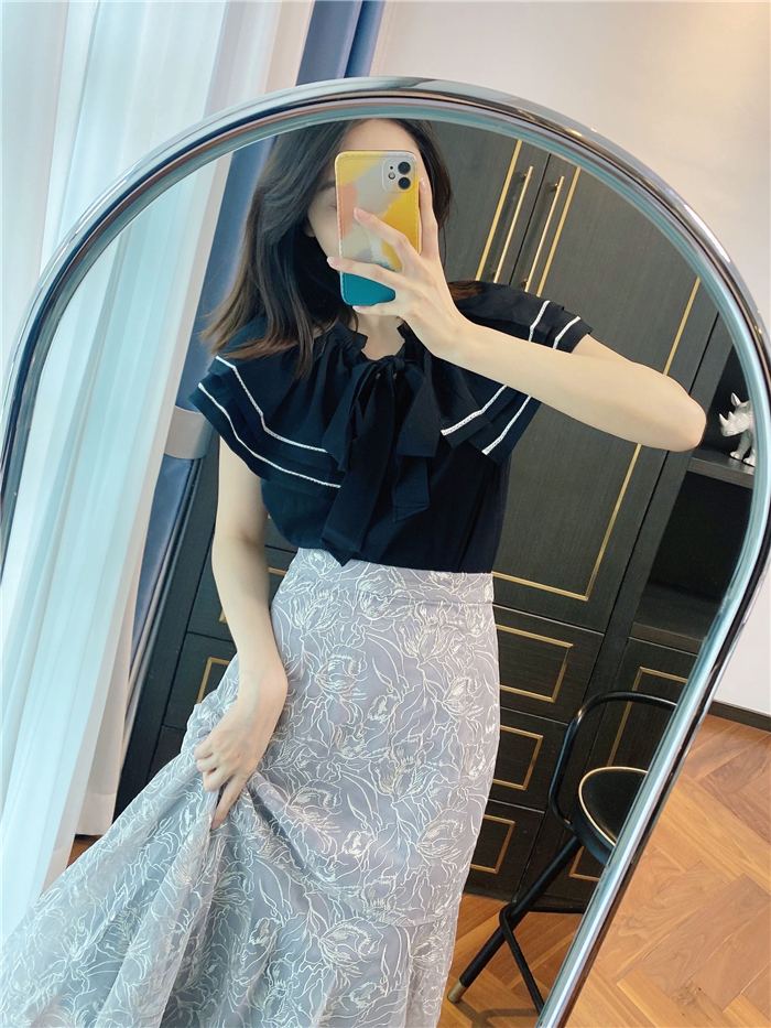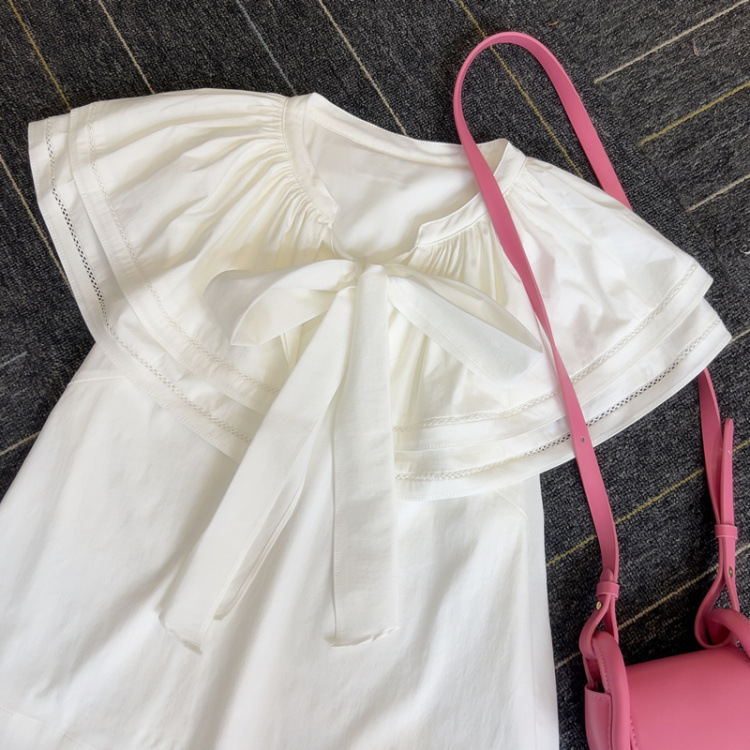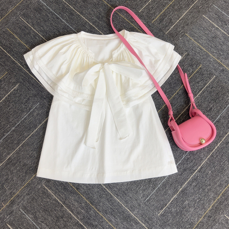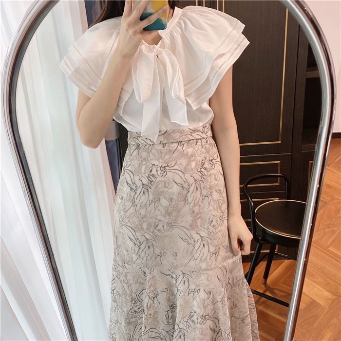 立体的なはしごレース付きWカラーがポイントのボウタイブラウス。