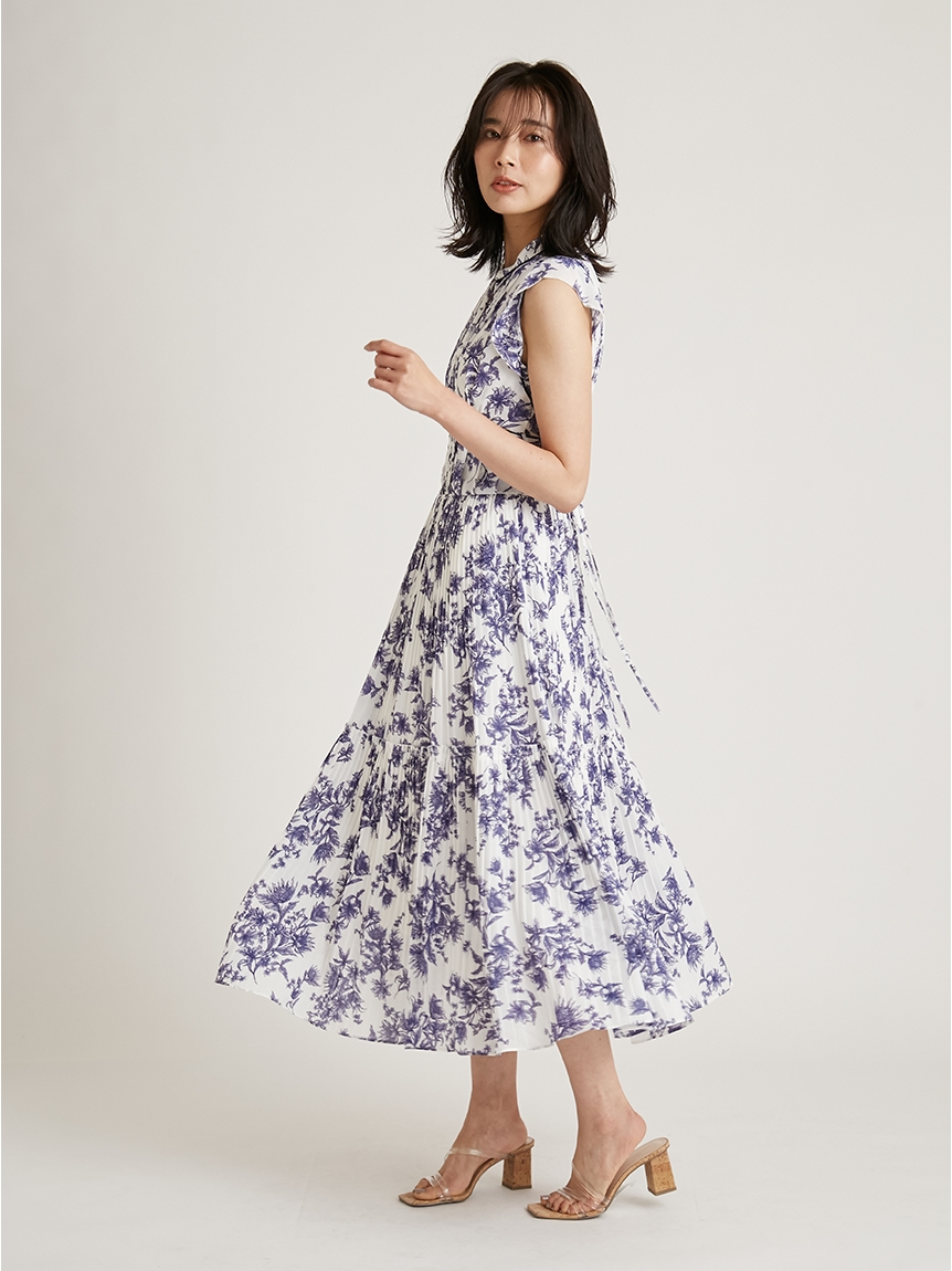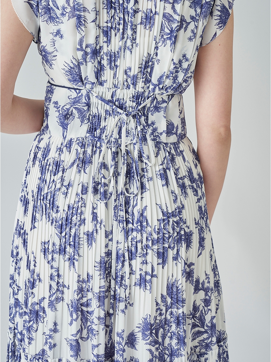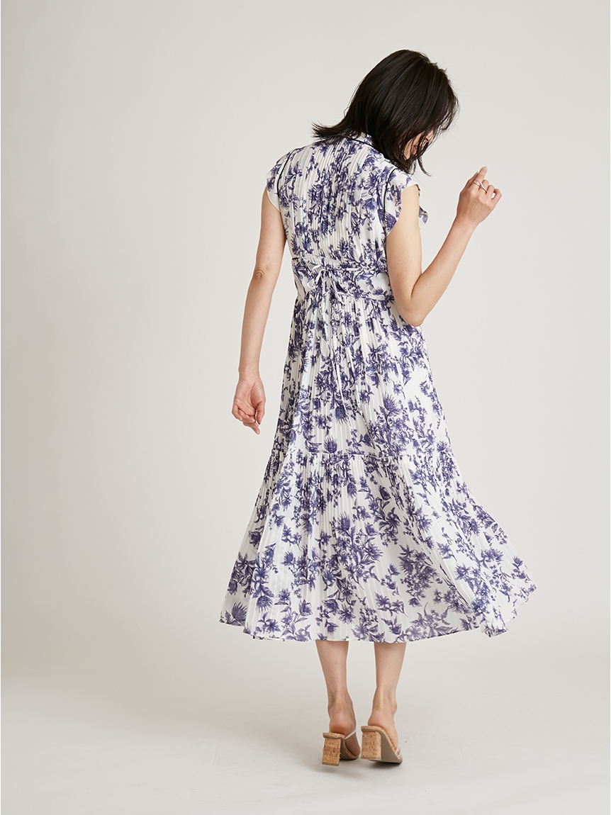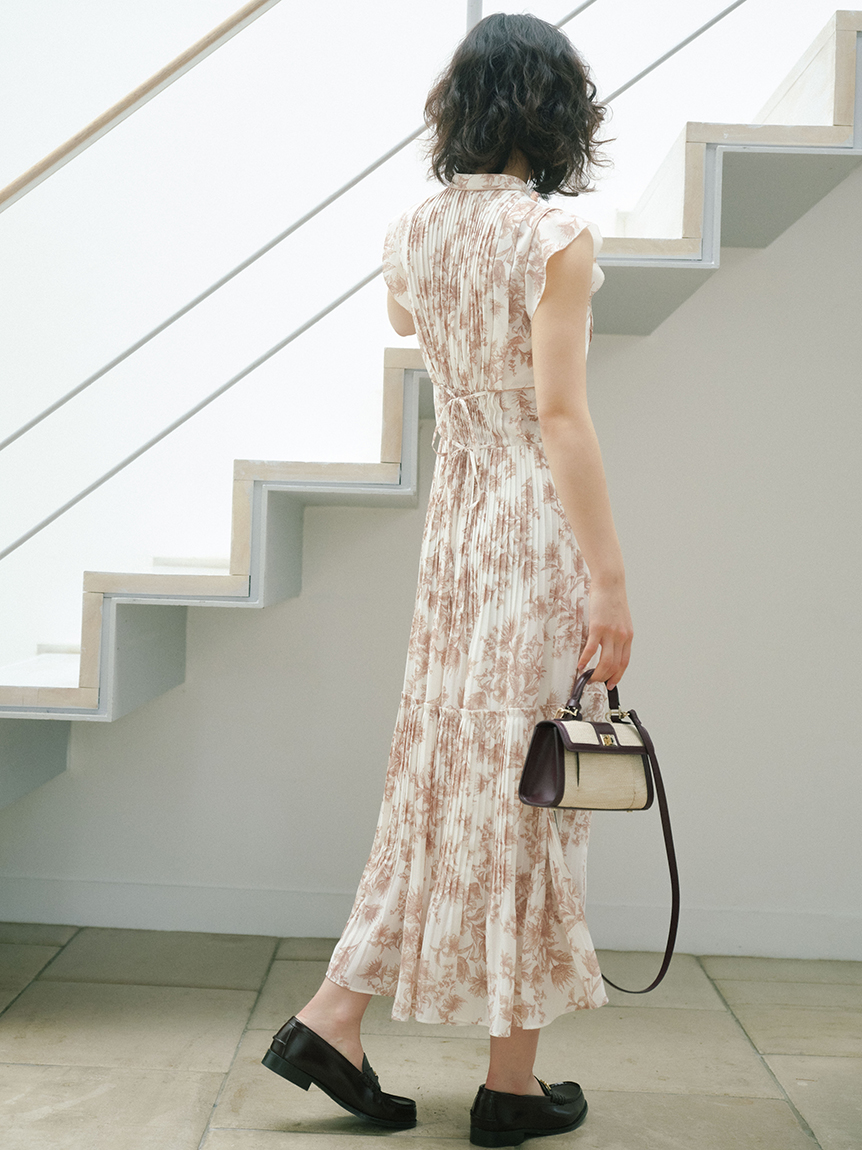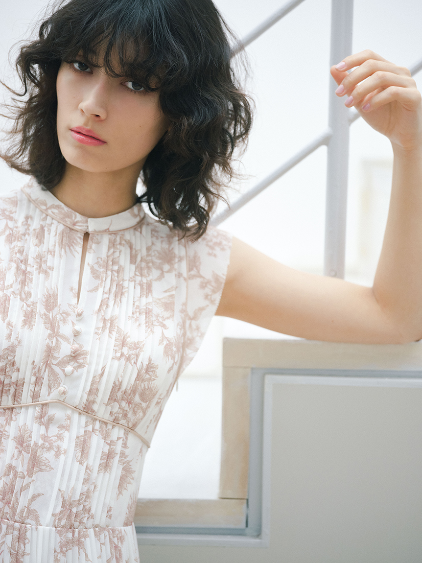 大胆にプリントされたオリジナルのフラワープリントに目を奪われる、存在感たっぷりのワンピース。全体に優美なプリーツを畳みクラシカルな雰囲気に仕上げています。スタンドカラーを採用することで上品に見せつつ、デコルテの肌見せでさり気ない色気も加味。フレンチスリーブはフリル仕様でスイートに、どこまでも女性らしさを演出しています。コルセットのような切り替えを入れたメリハリのあるシルエットは、スタイルアップ効果も絶大。バックウエストにはレースアップデザインを施し、後ろ姿まで抜かりなくアピールしています。