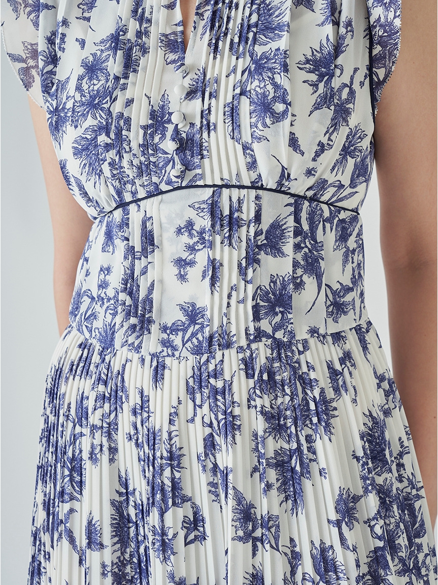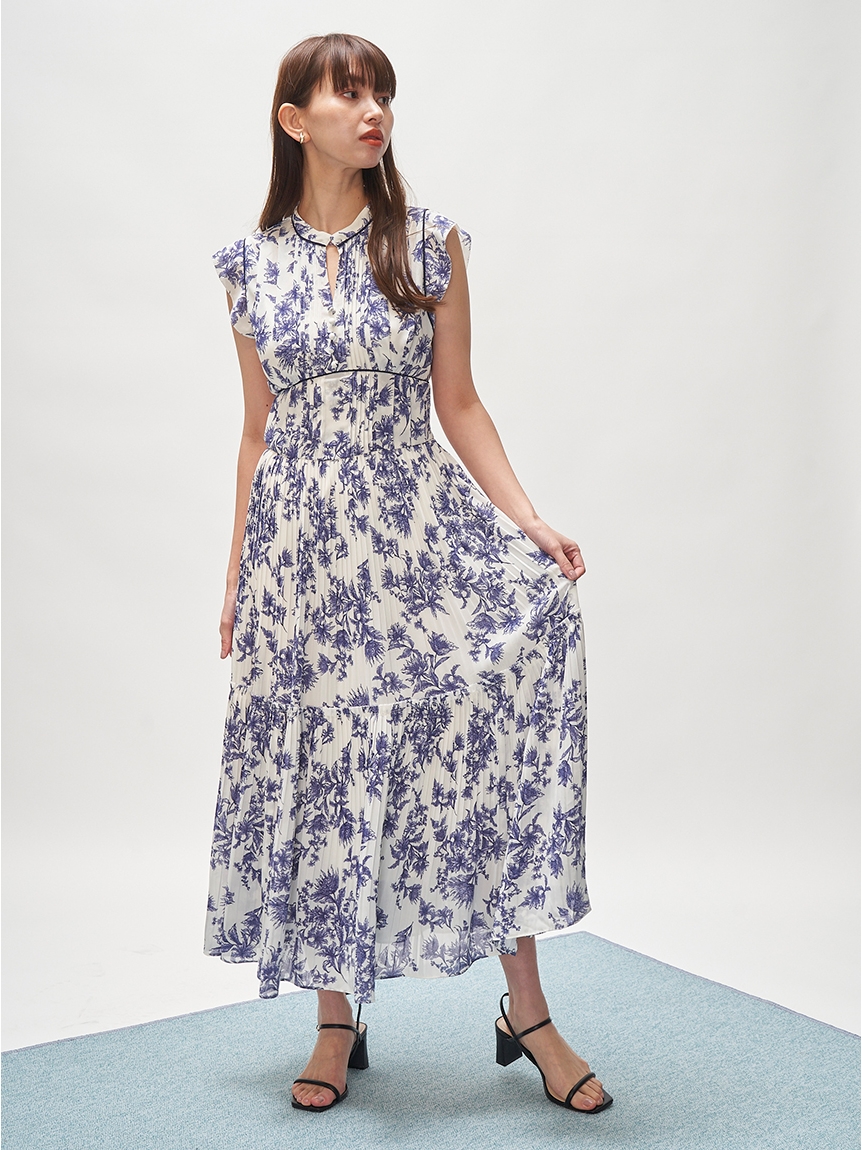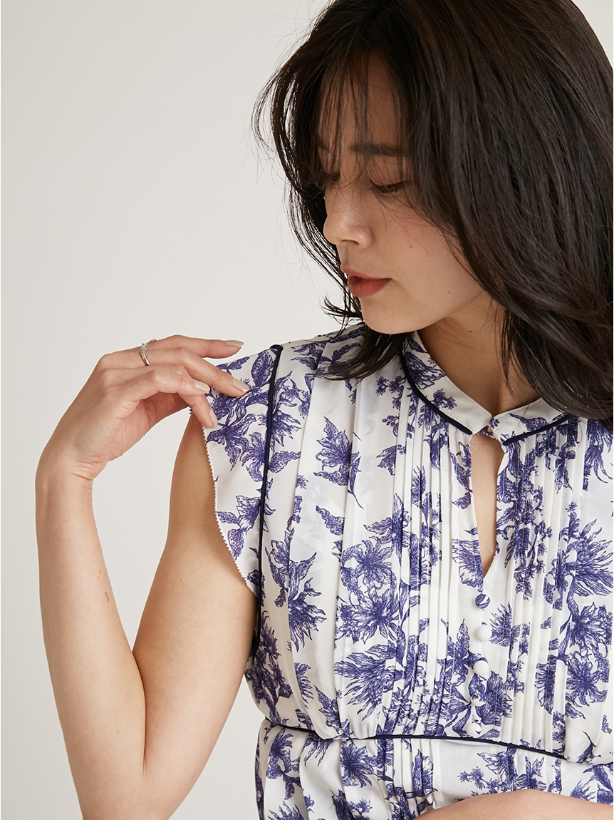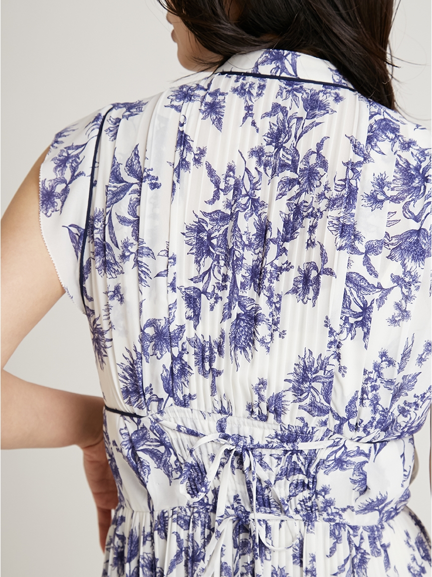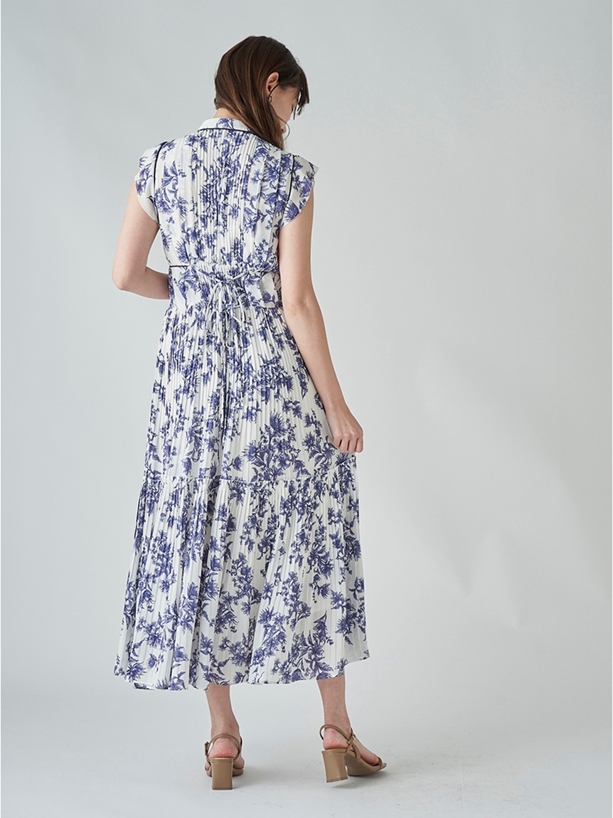大胆にプリントされたオリジナルのフラワープリントに目を奪われる、存在感たっぷりのワンピース。全体に優美なプリーツを畳みクラシカルな雰囲気に仕上げています。スタンドカラーを採用することで上品に見せつつ、デコルテの肌見せでさり気ない色気も加味。フレンチスリーブはフリル仕様でスイートに、どこまでも女性らしさを演出しています。コルセットのような切り替えを入れたメリハリのあるシルエットは、スタイルアップ効果も絶大。バックウエストにはレースアップデザインを施し、後ろ姿まで抜かりなくアピールしています。