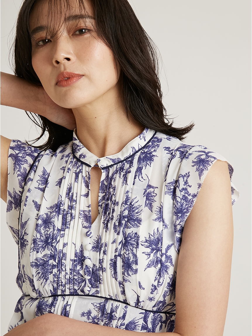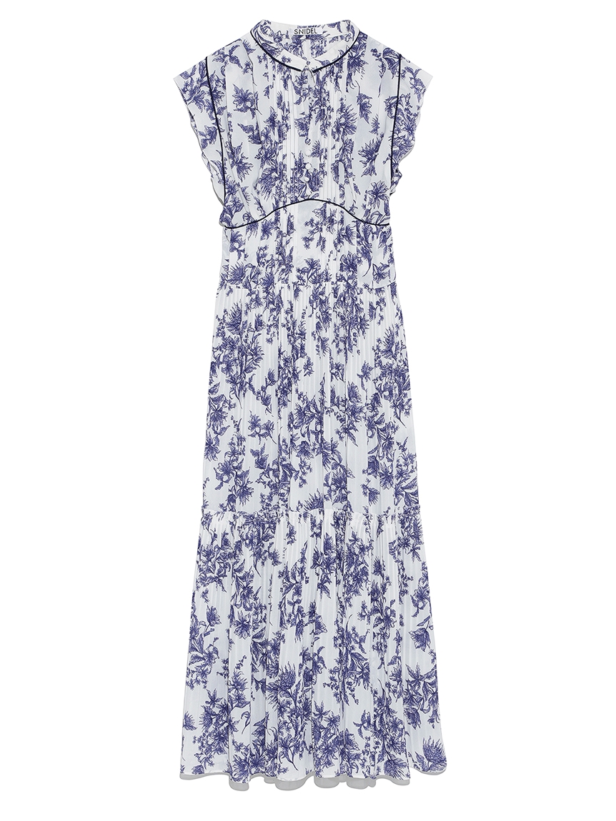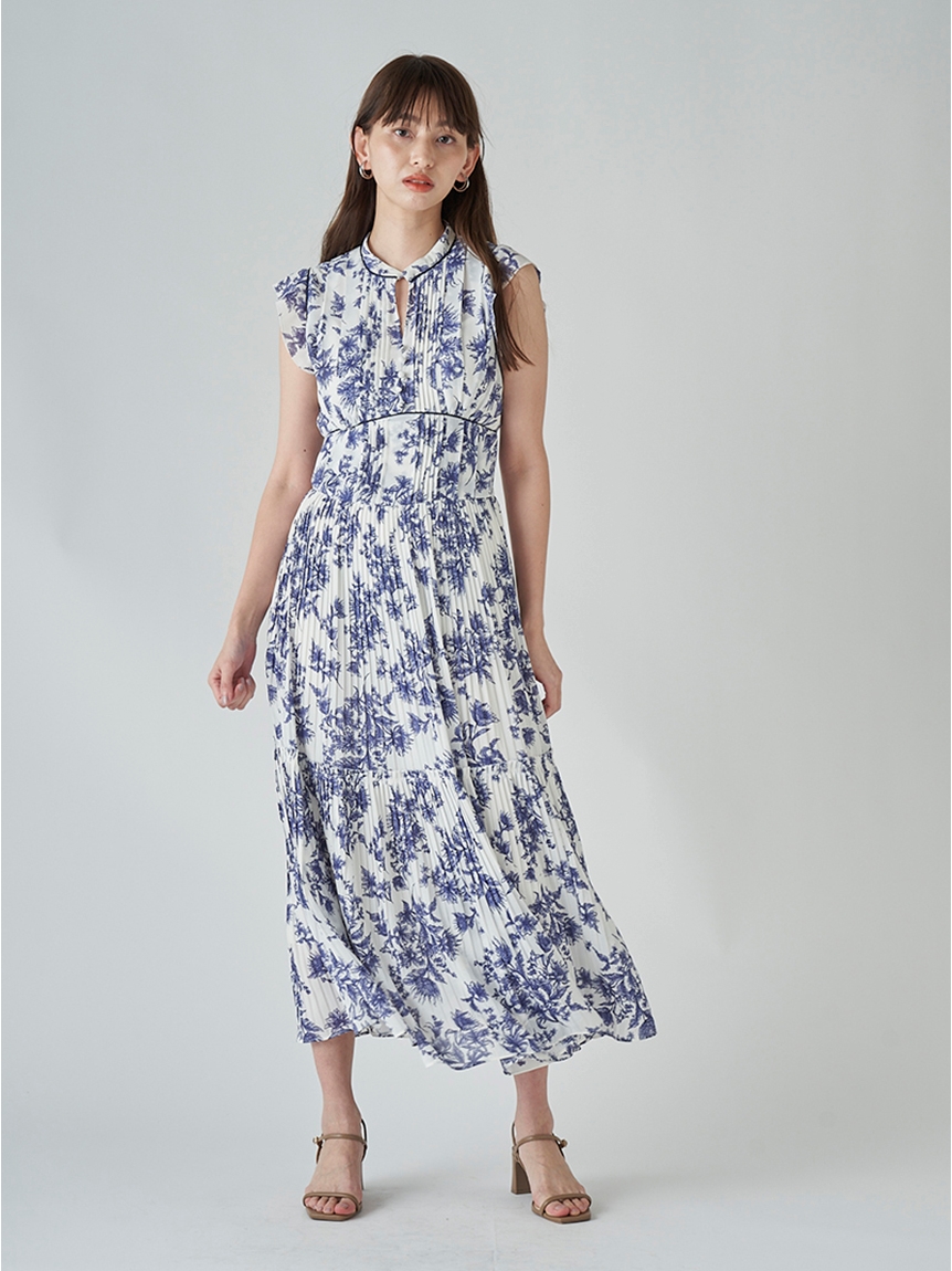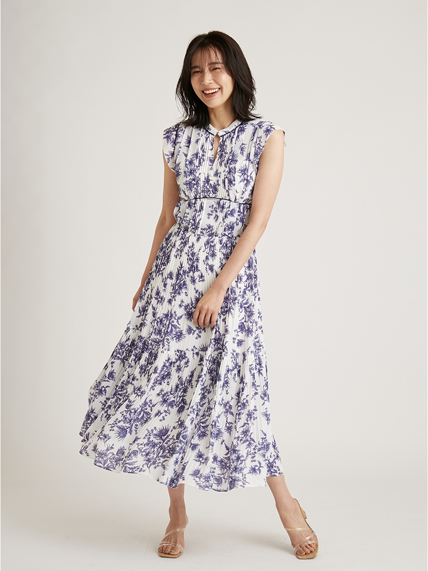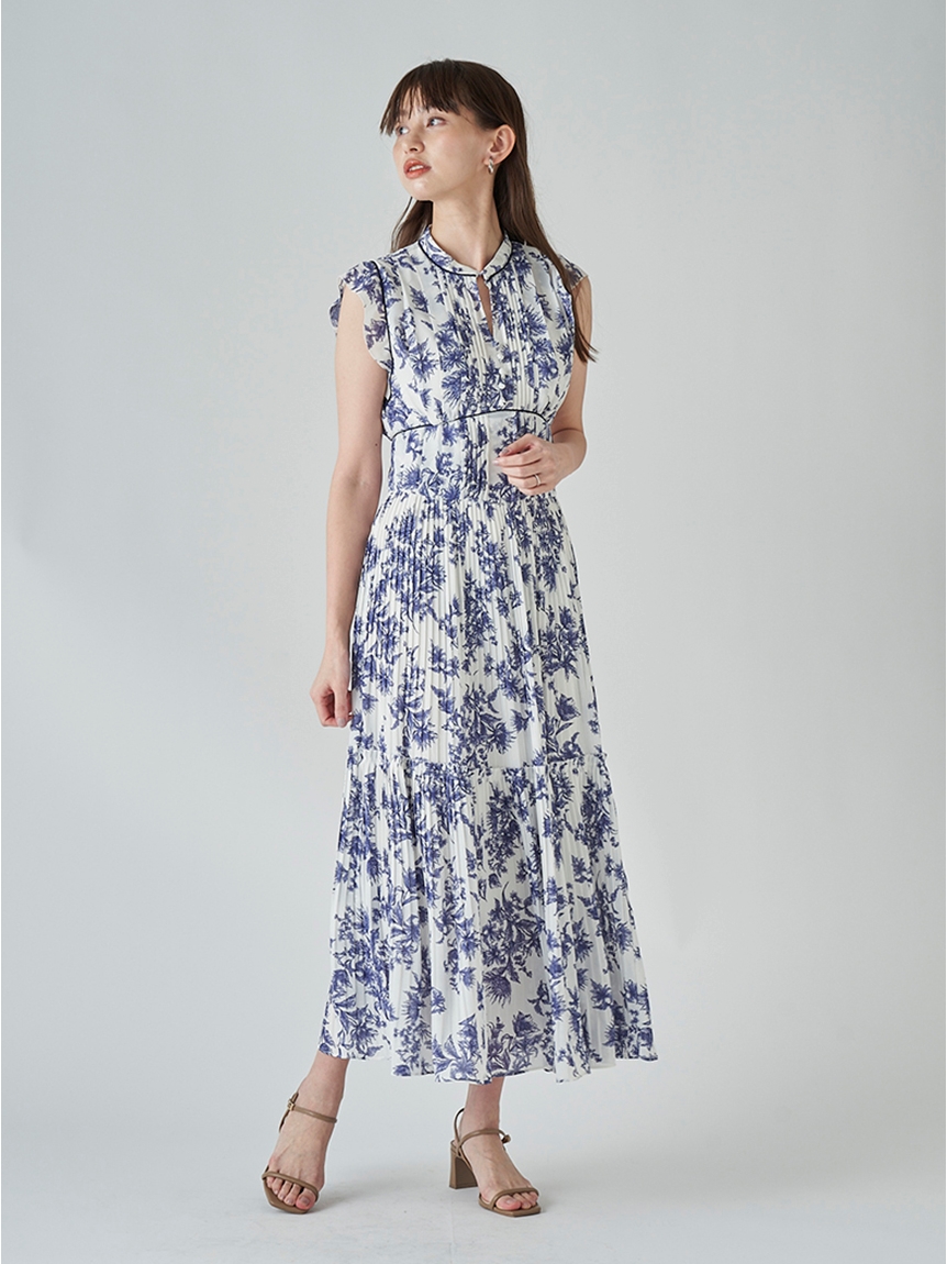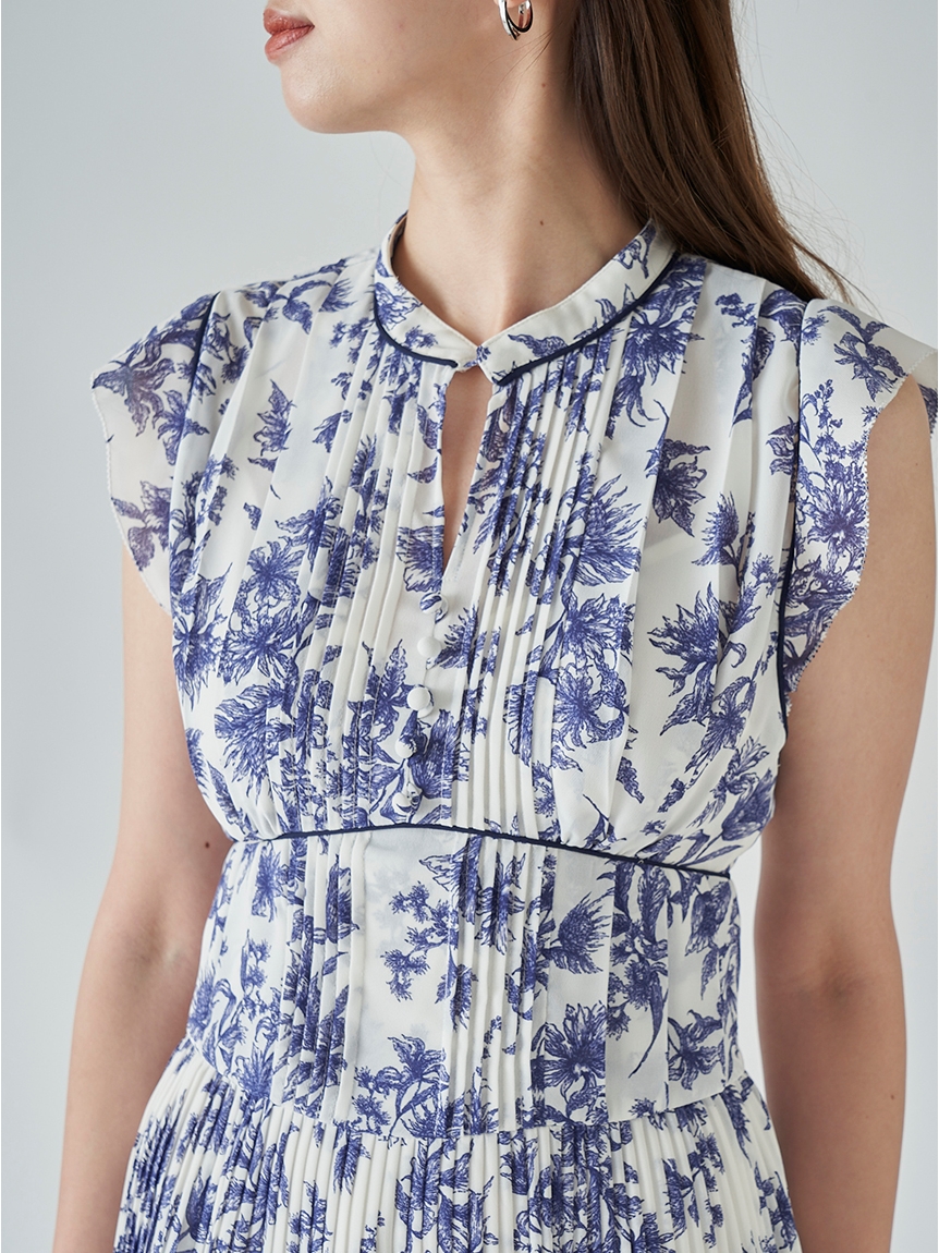 大胆にプリントされたオリジナルのフラワープリントに目を奪われる、存在感たっぷりのワンピース。全体に優美なプリーツを畳みクラシカルな雰囲気に仕上げています。スタンドカラーを採用することで上品に見せつつ、デコルテの肌見せでさり気ない色気も加味。フレンチスリーブはフリル仕様でスイートに、どこまでも女性らしさを演出しています。コルセットのような切り替えを入れたメリハリのあるシルエットは、スタイルアップ効果も絶大。バックウエストにはレースアップデザインを施し、後ろ姿まで抜かりなくアピールしています。