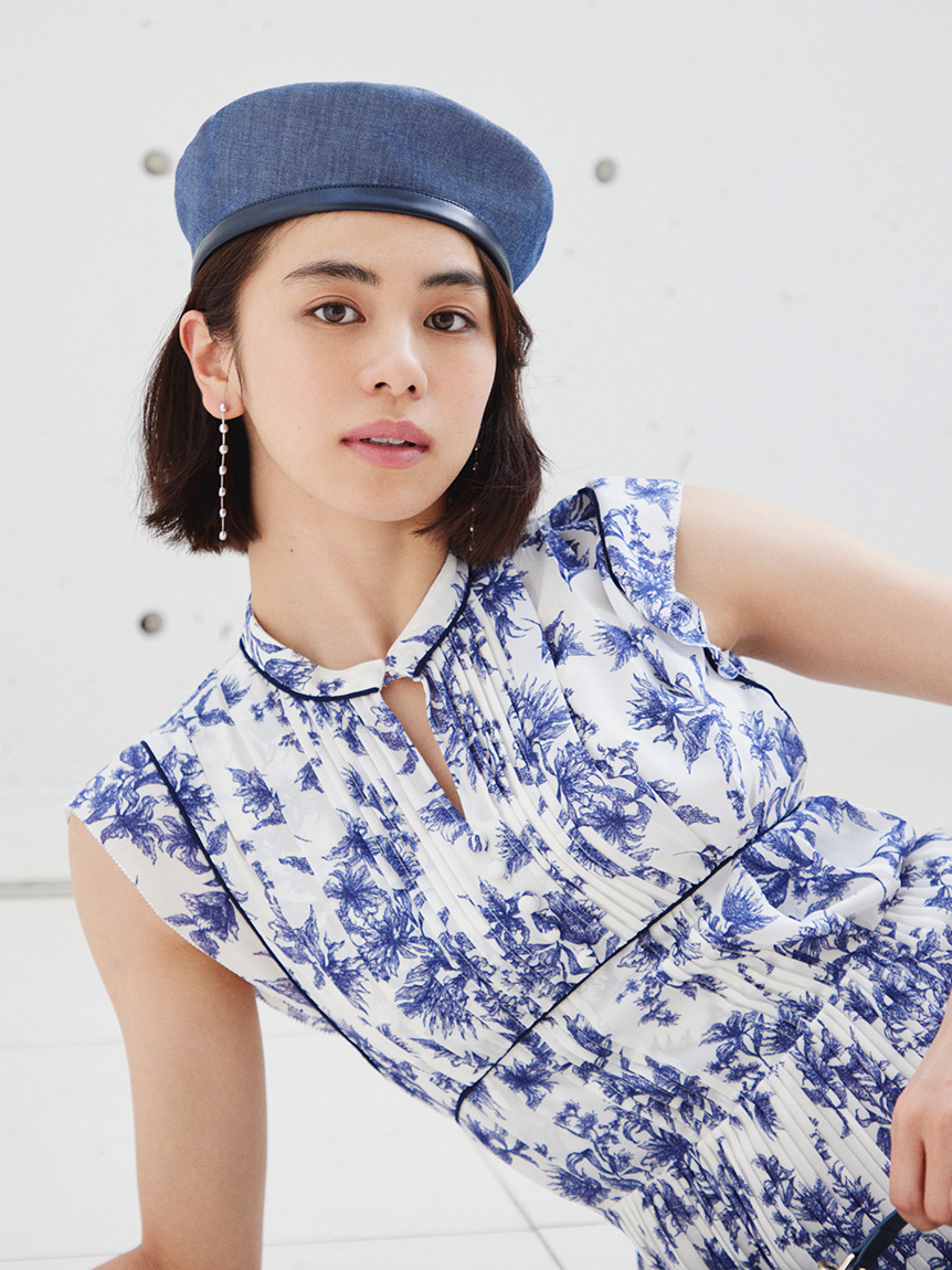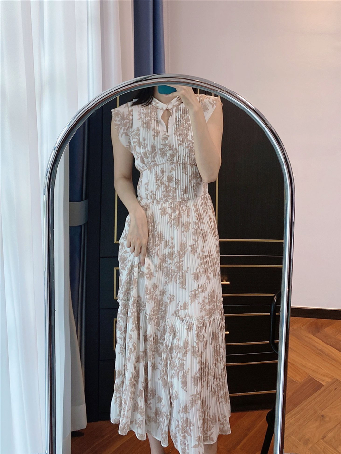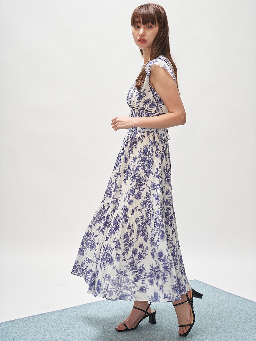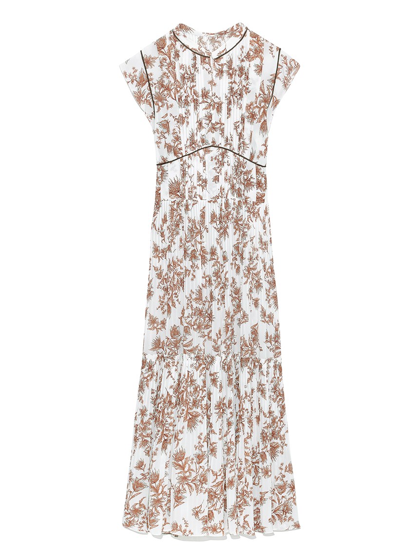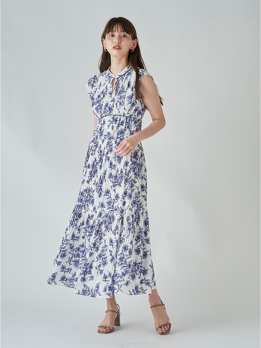 大胆にプリントされたオリジナルのフラワープリントに目を奪われる、存在感たっぷりのワンピース。全体に優美なプリーツを畳みクラシカルな雰囲気に仕上げています。スタンドカラーを採用することで上品に見せつつ、デコルテの肌見せでさり気ない色気も加味。フレンチスリーブはフリル仕様でスイートに、どこまでも女性らしさを演出しています。コルセットのような切り替えを入れたメリハリのあるシルエットは、スタイルアップ効果も絶大。バックウエストにはレースアップデザインを施し、後ろ姿まで抜かりなくアピールしています。