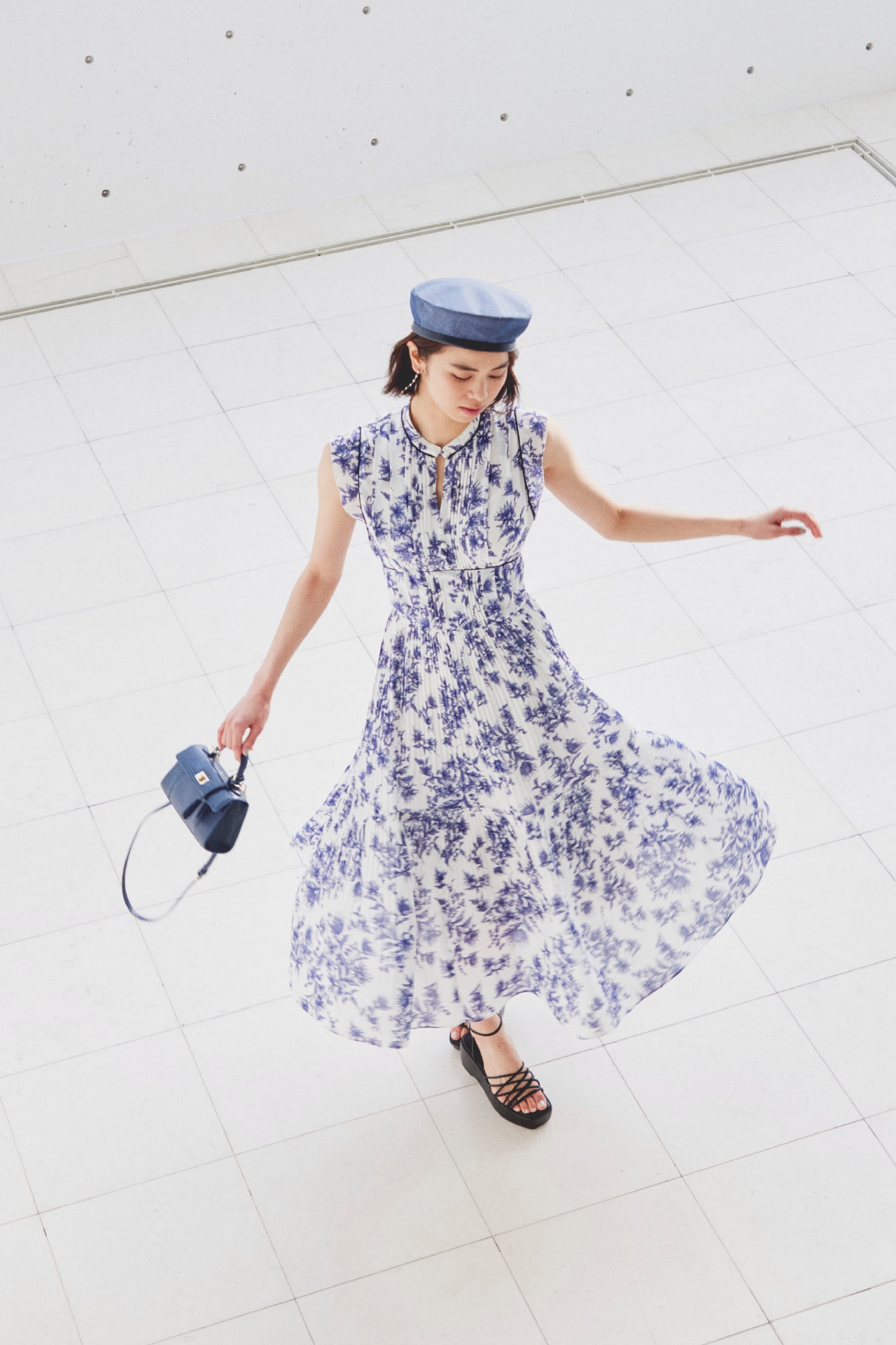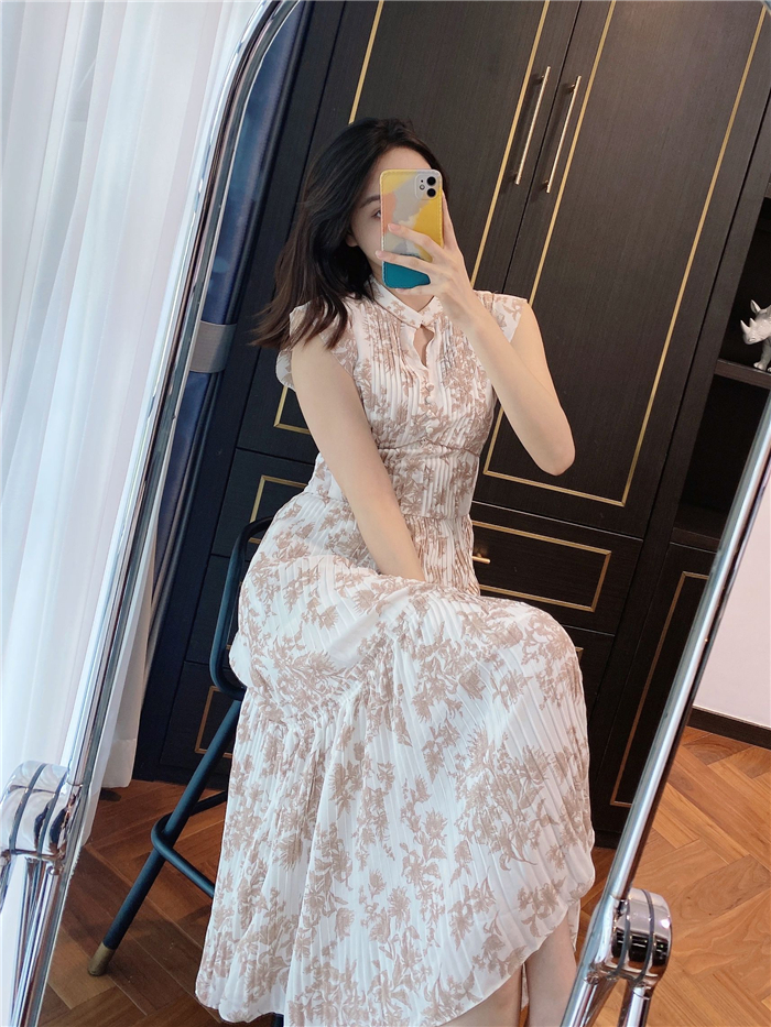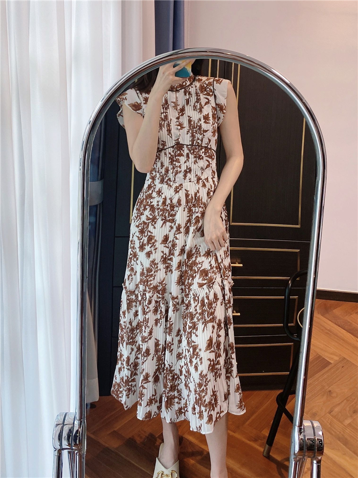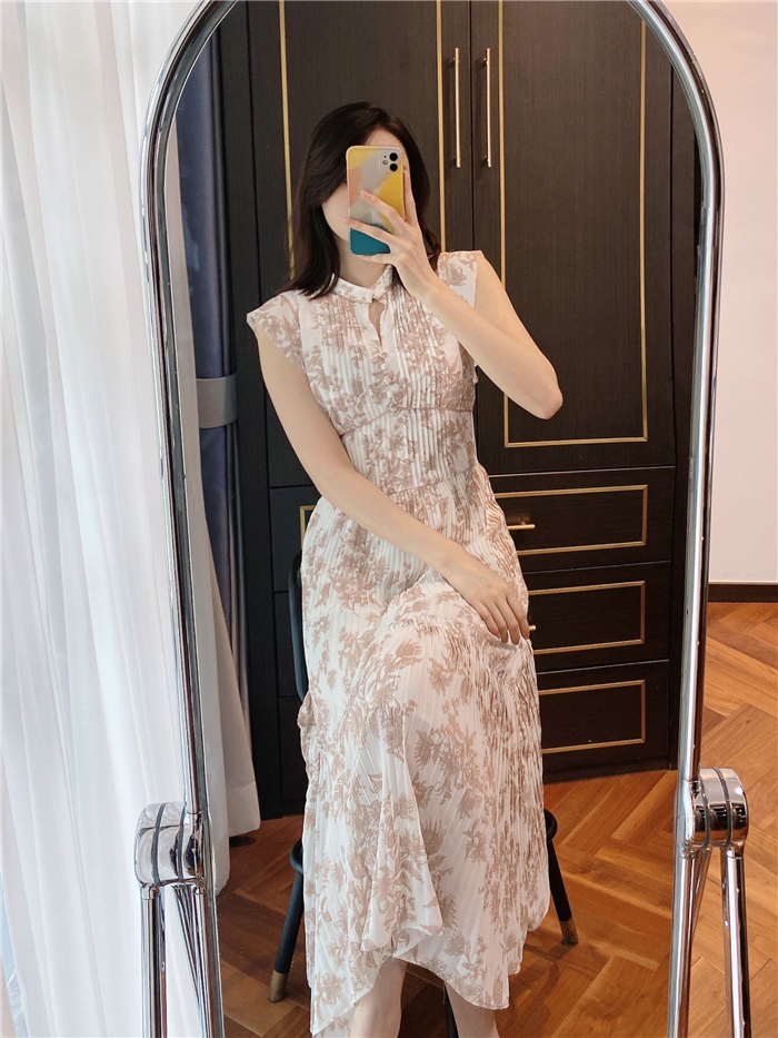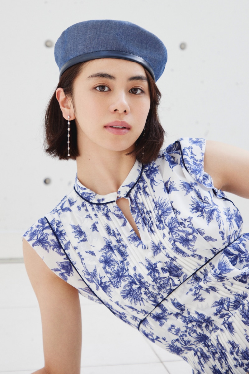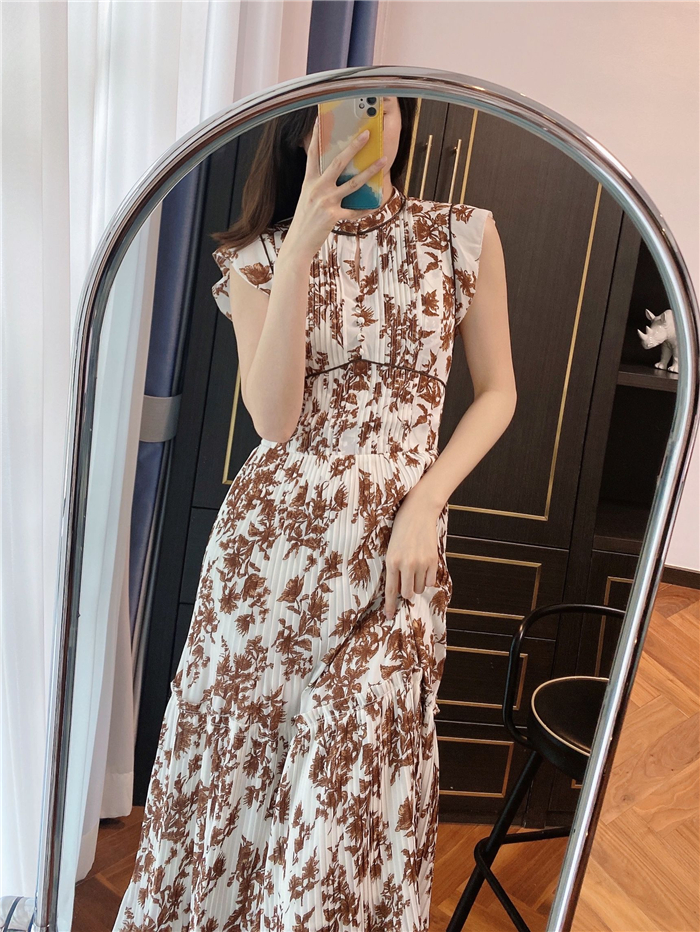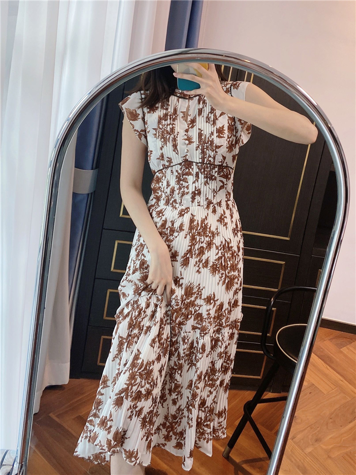 大胆にプリントされたオリジナルのフラワープリントに目を奪われる、存在感たっぷりのワンピース。全体に優美なプリーツを畳みクラシカルな雰囲気に仕上げています。スタンドカラーを採用することで上品に見せつつ、デコルテの肌見せでさり気ない色気も加味。フレンチスリーブはフリル仕様でスイートに、どこまでも女性らしさを演出しています。コルセットのような切り替えを入れたメリハリのあるシルエットは、スタイルアップ効果も絶大。バックウエストにはレースアップデザインを施し、後ろ姿まで抜かりなくアピールしています。