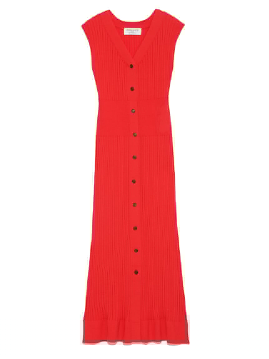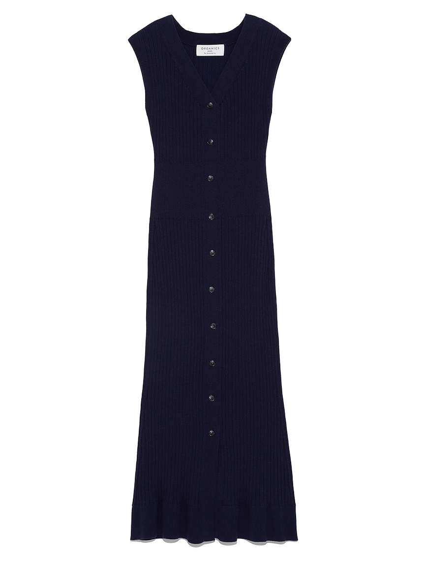 前シーズン反響の大きかったフロントボタンニットワンピースをベースにデザインをアップデート。前立て部分を細くしボタンを大きくすることですっきりとした印象に仕上げました。ウエストの編地を切り替えメリハリを与えた美シルエットで、女性らしい身体のラインを演出。裾部分の絶妙なフレアラインが愛らしさをぐっと高めてくれます。