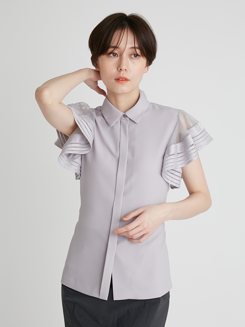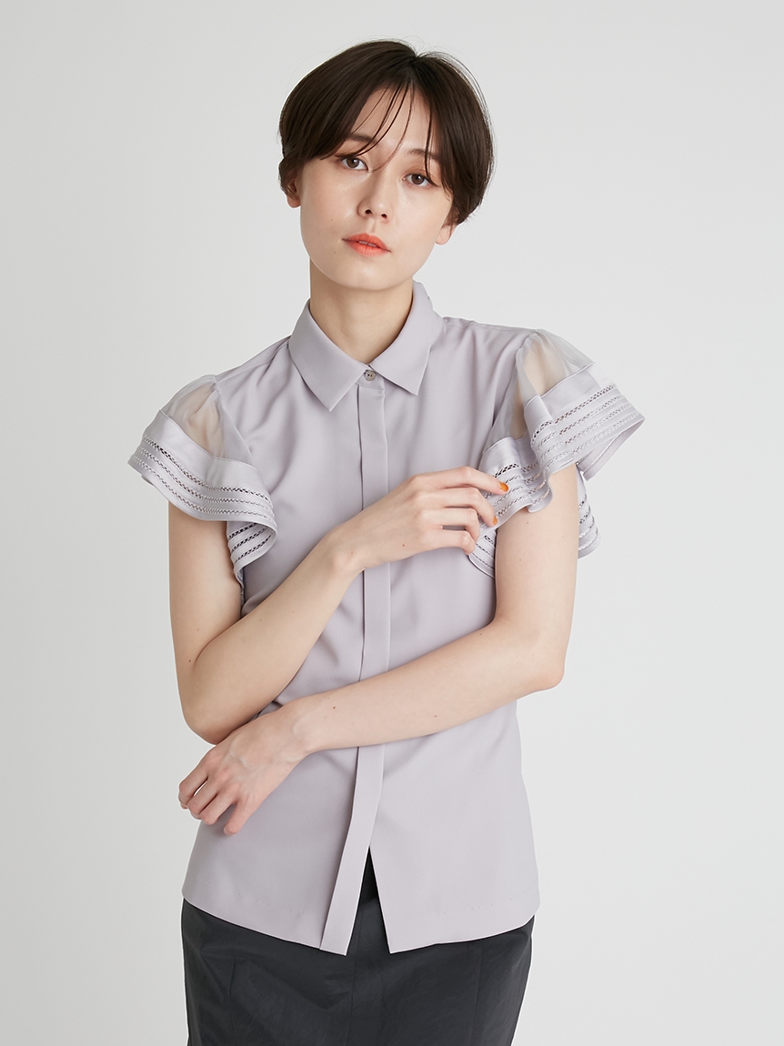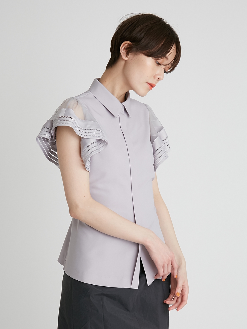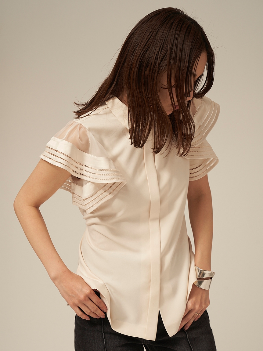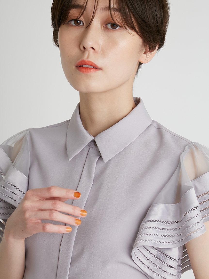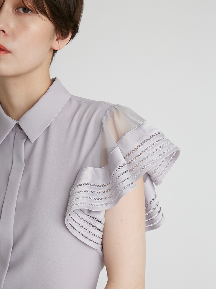 クロスステッチで繋いだバテンレースが表情を華やげるラッフルスリーブブラウスは、コンパクトなシャツカラーと比翼の内ボタン仕様で、甘すぎないモードな印象のデザインに。
