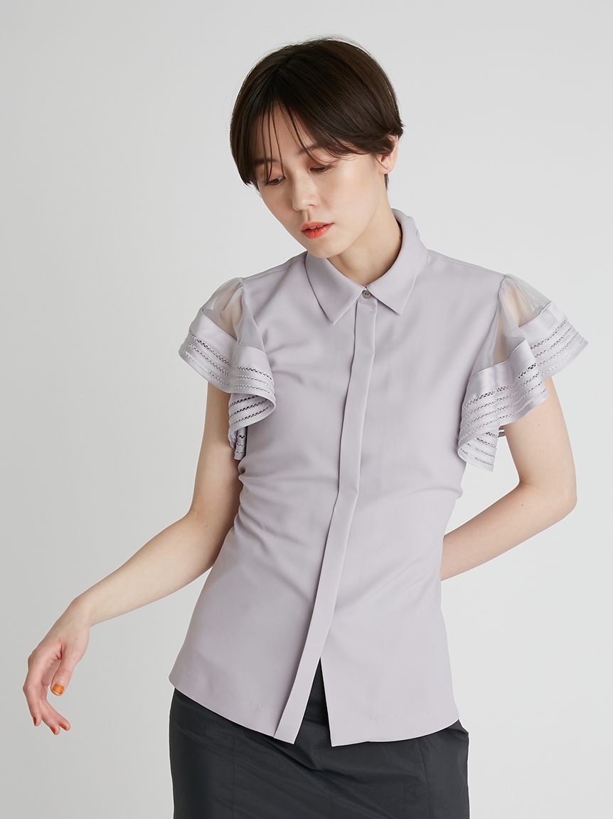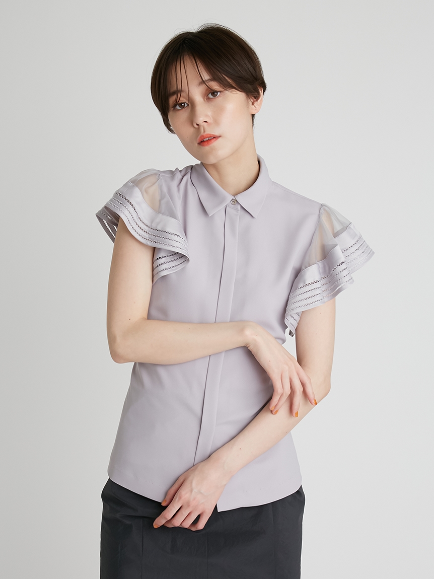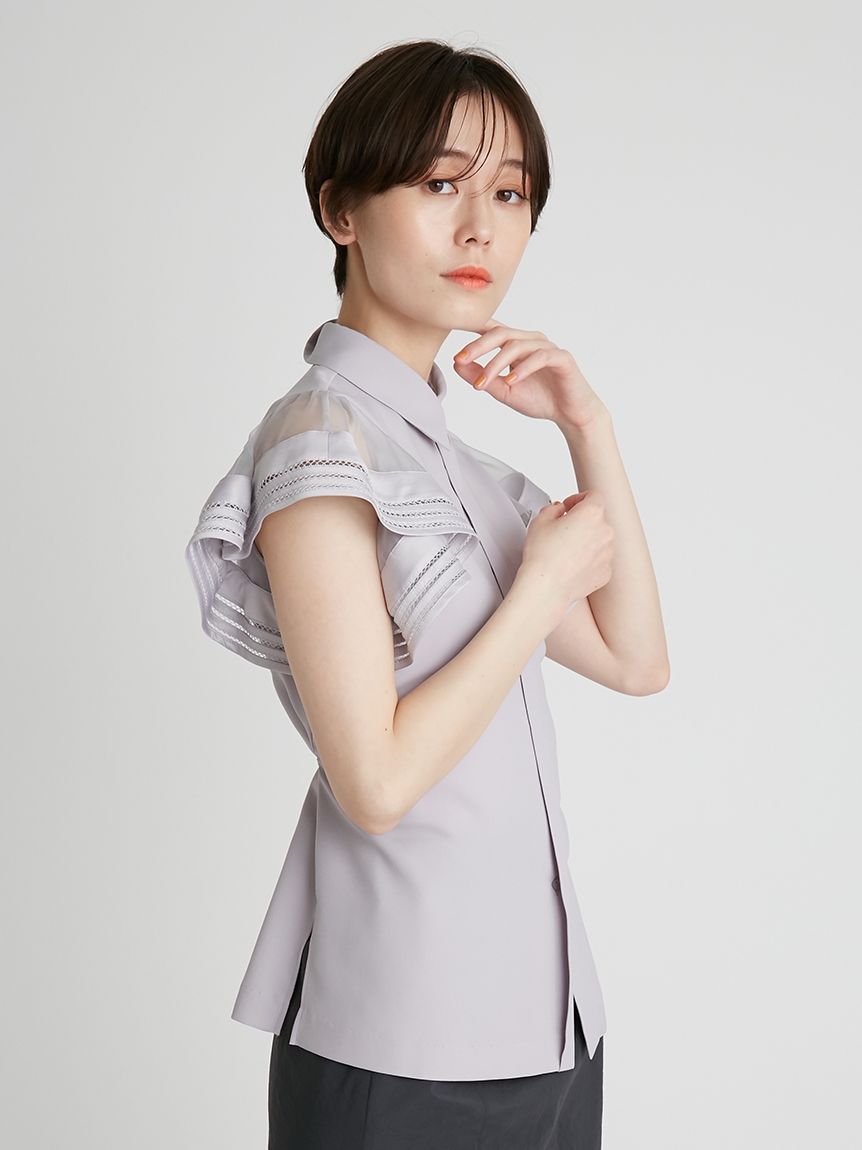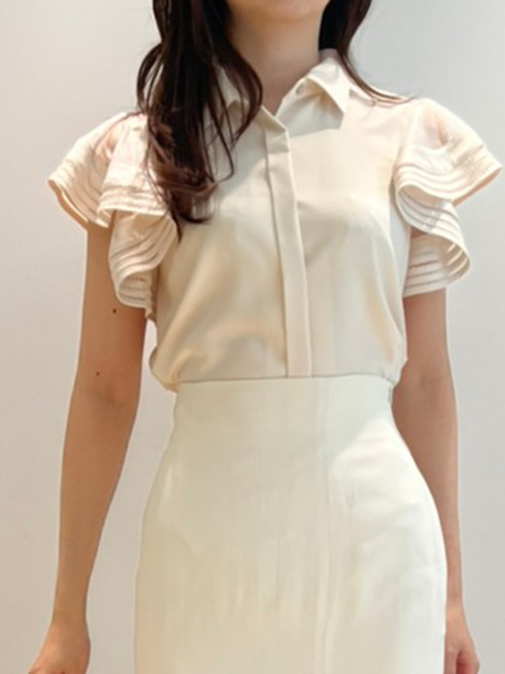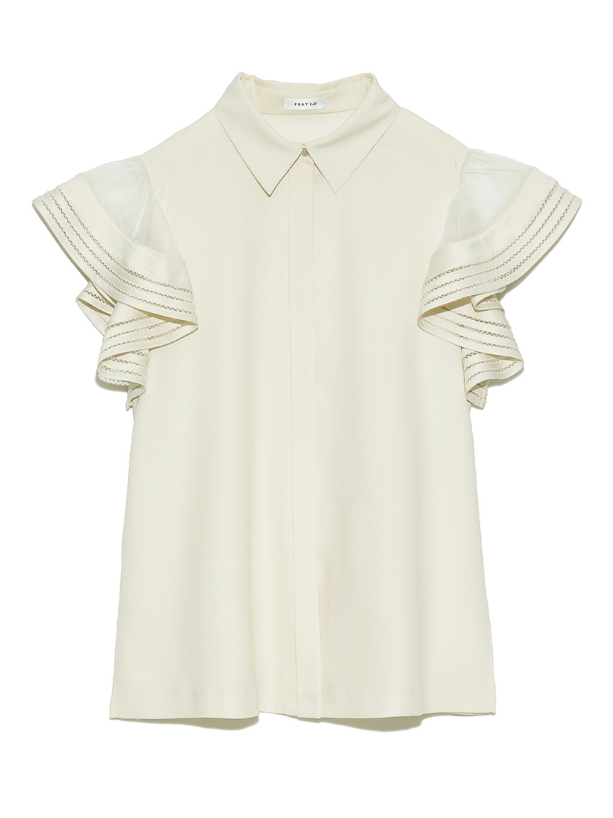 クロスステッチで繋いだバテンレースが表情を華やげるラッフルスリーブブラウスは、コンパクトなシャツカラーと比翼の内ボタン仕様で、甘すぎないモードな印象のデザインに。