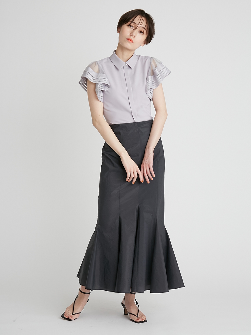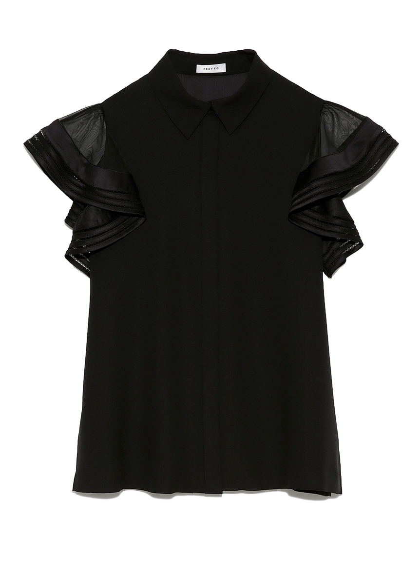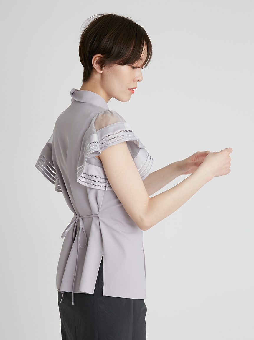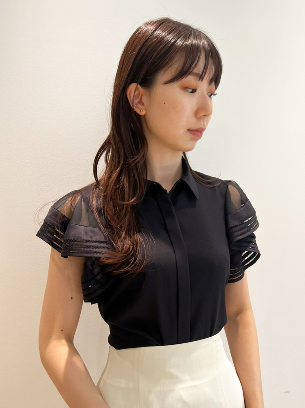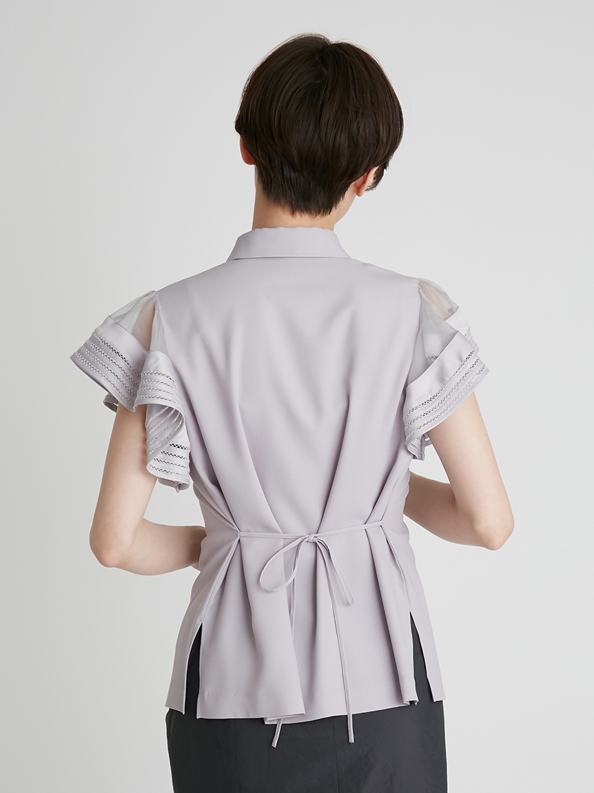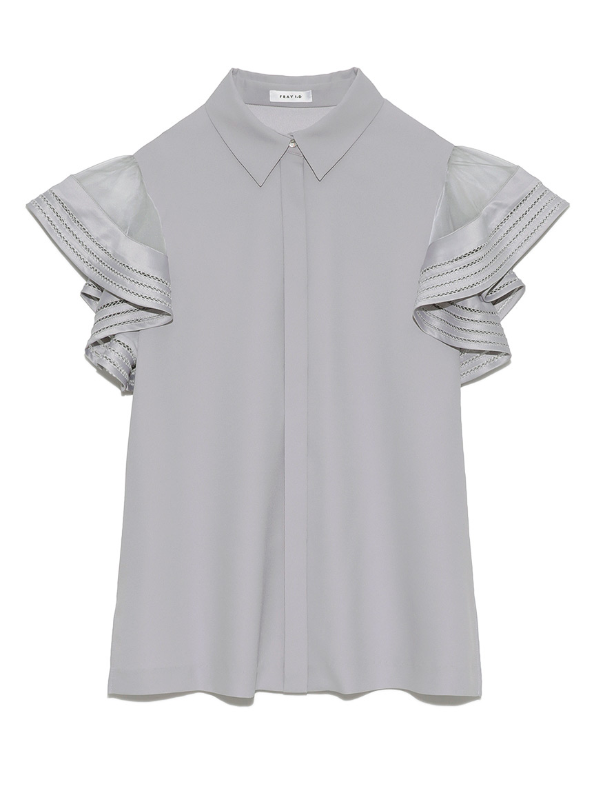 クロスステッチで繋いだバテンレースが表情を華やげるラッフルスリーブブラウスは、コンパクトなシャツカラーと比翼の内ボタン仕様で、甘すぎないモードな印象のデザインに。