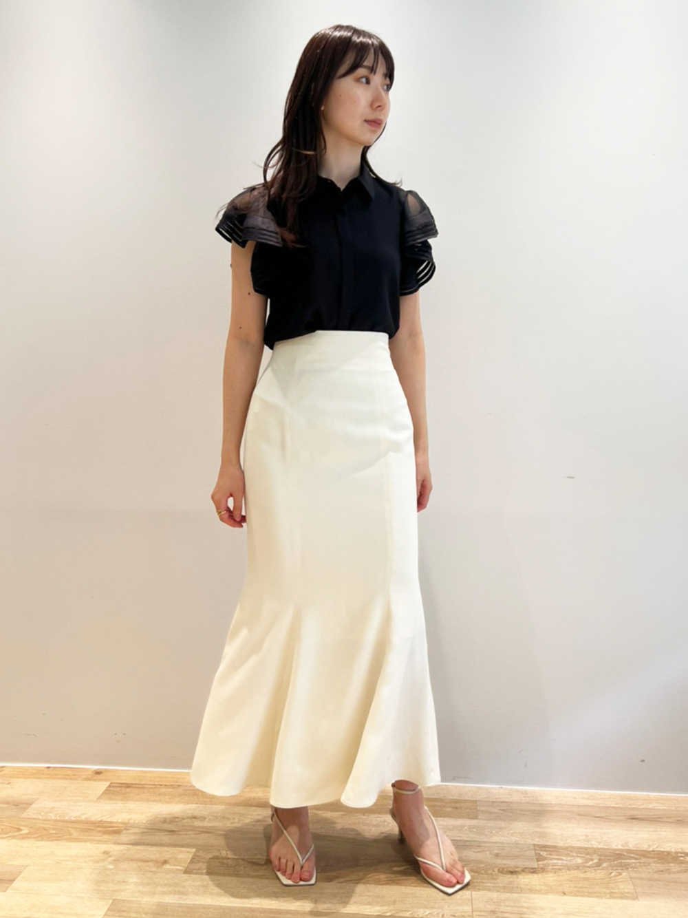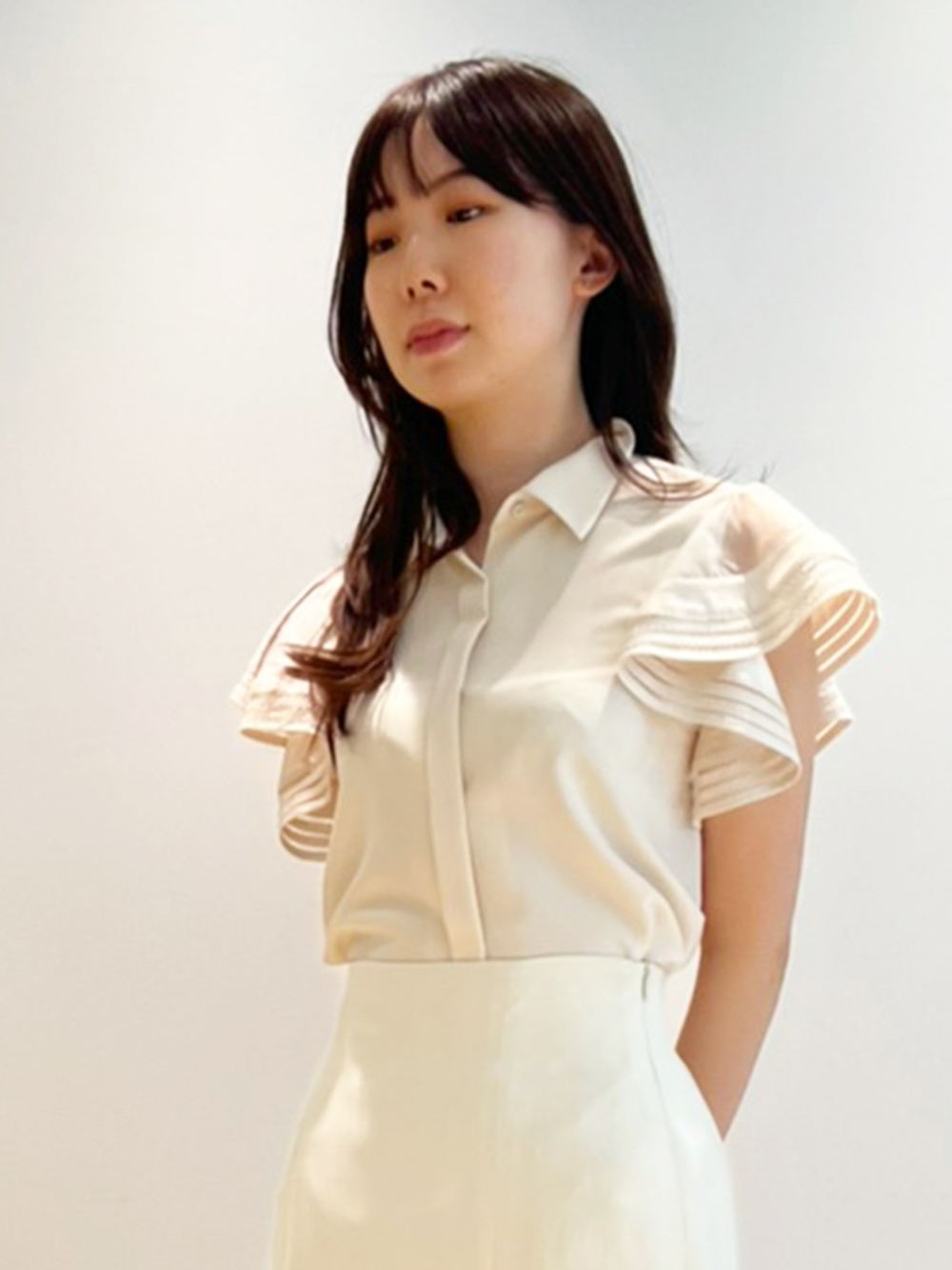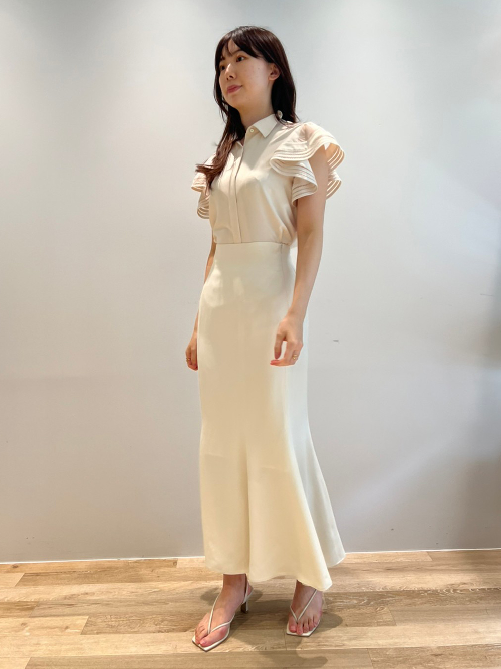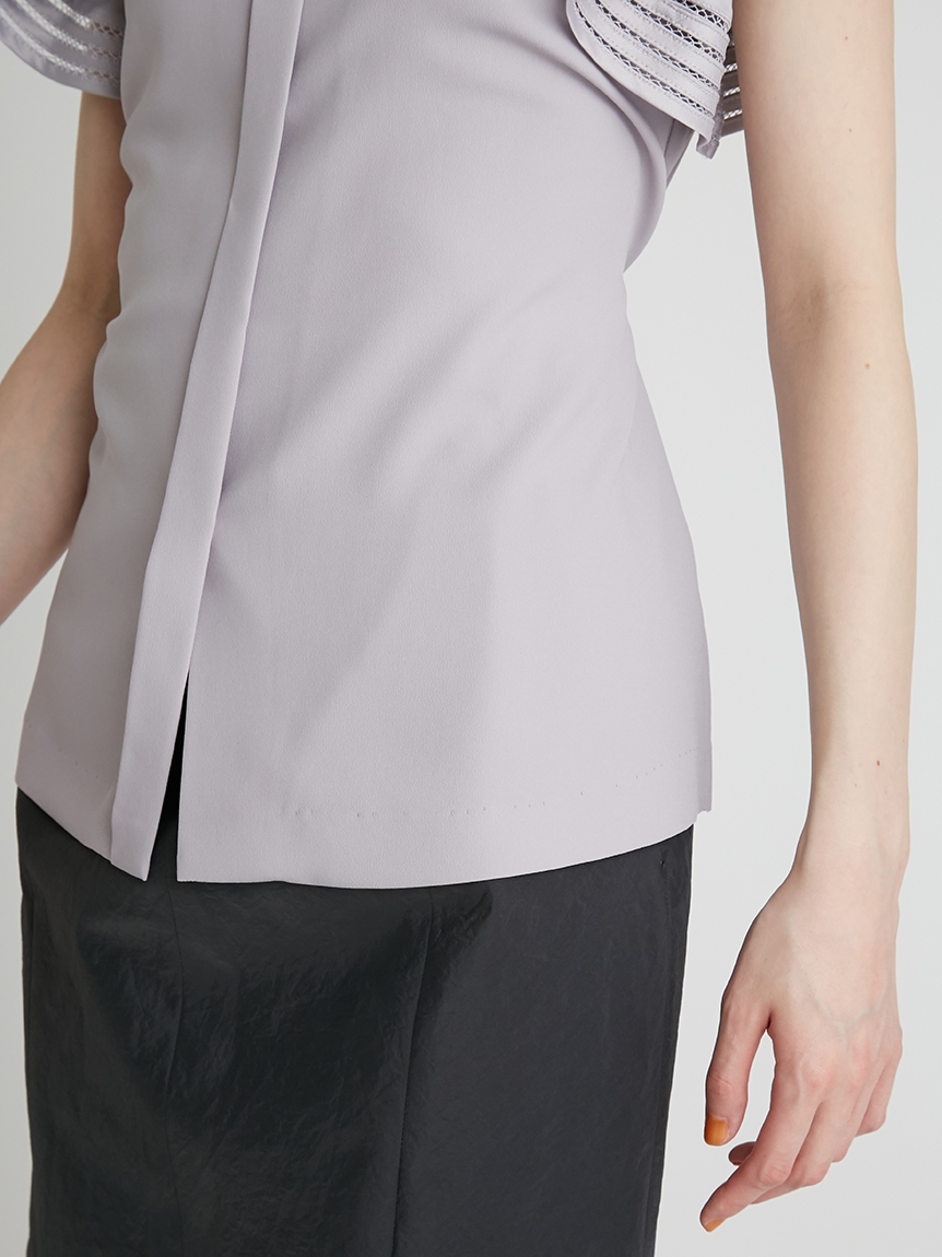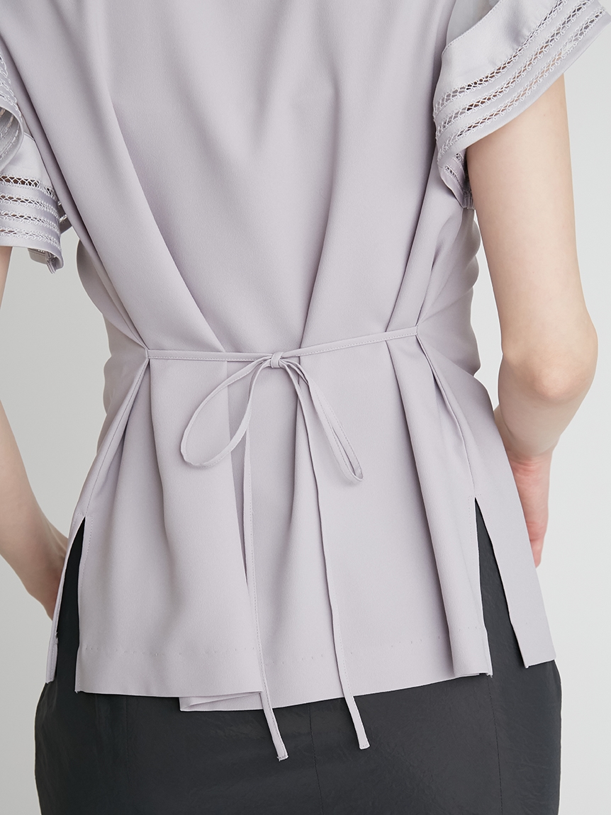 クロスステッチで繋いだバテンレースが表情を華やげるラッフルスリーブブラウスは、コンパクトなシャツカラーと比翼の内ボタン仕様で、甘すぎないモードな印象のデザインに。