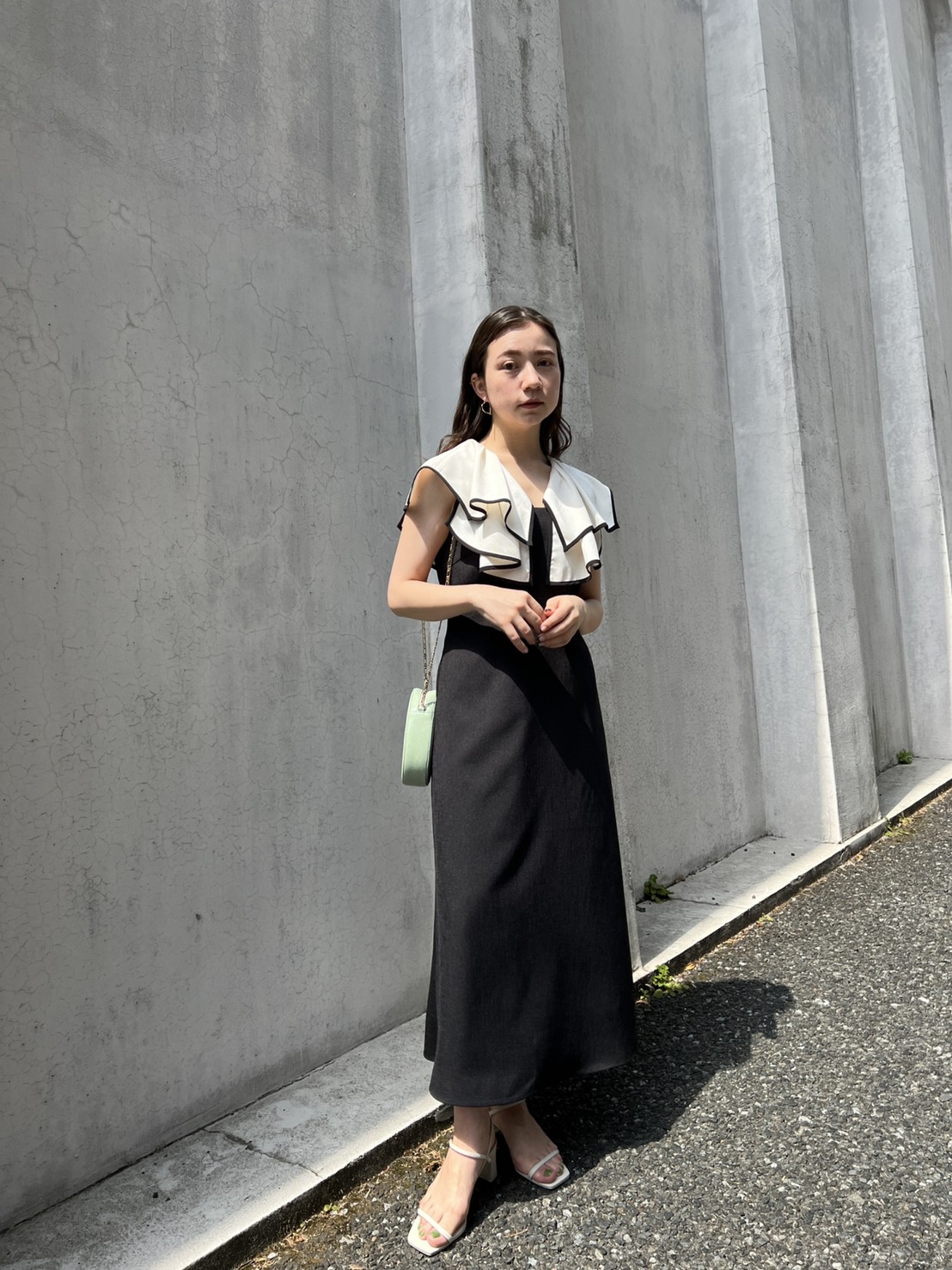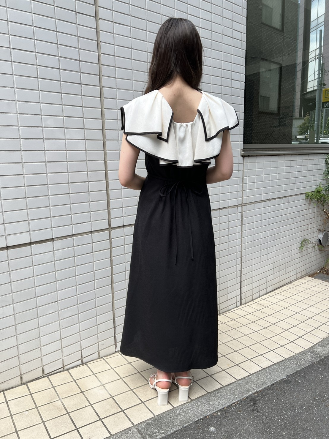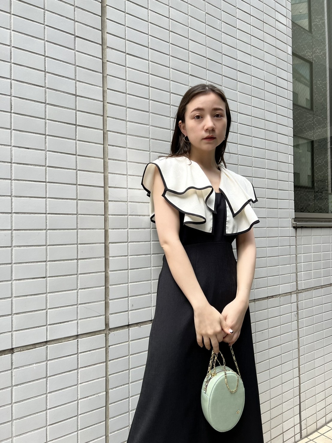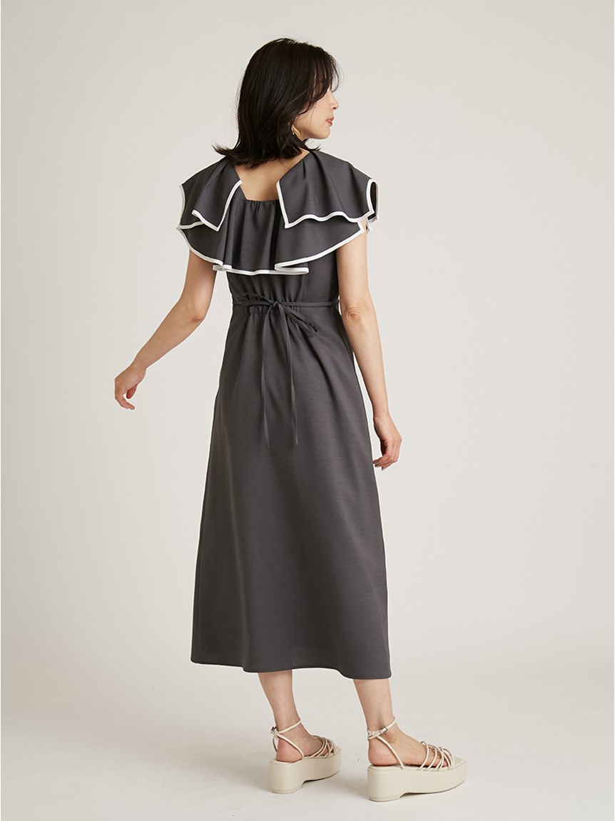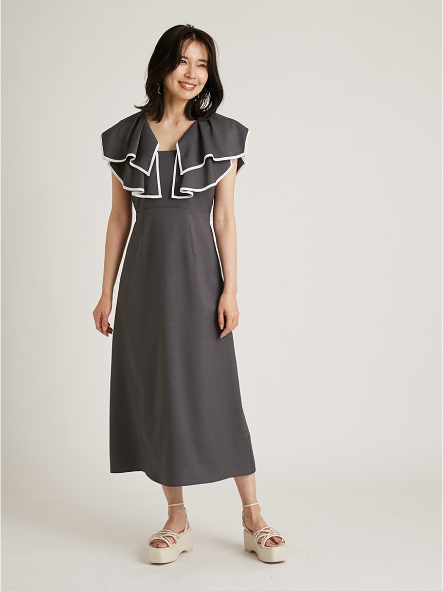 トレンドのパイピングでアクセントを付けたモードなフリルカラーが印象的。前回人気を集めたノースリーブワンピースが、新色を加えた豊富なバリエーション展開で届きました。ハイウエストの切り替えから緩やかに広がるAラインシルエットで、スタイルアップ効果は抜群。ギャザーを効かせたバックウエストには華奢なリボンをあしらい後ろ姿まで抜かりなく仕上げています。