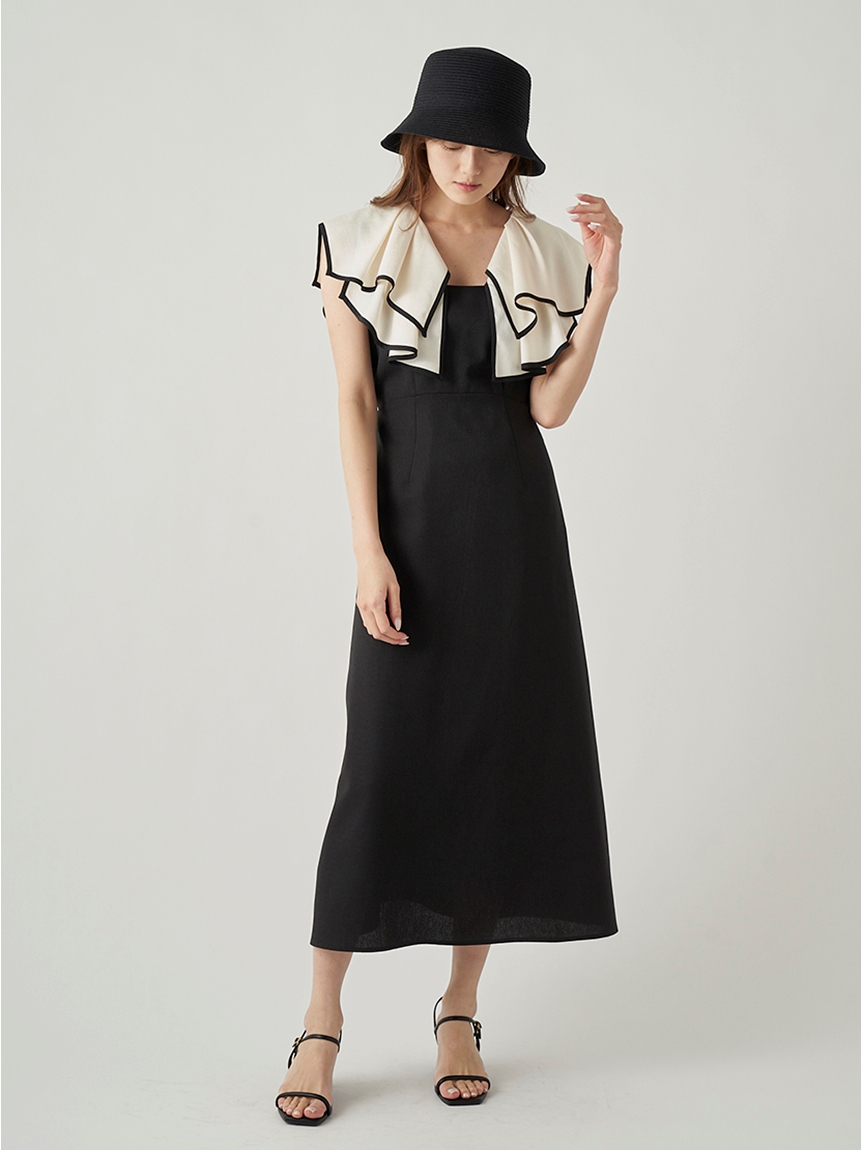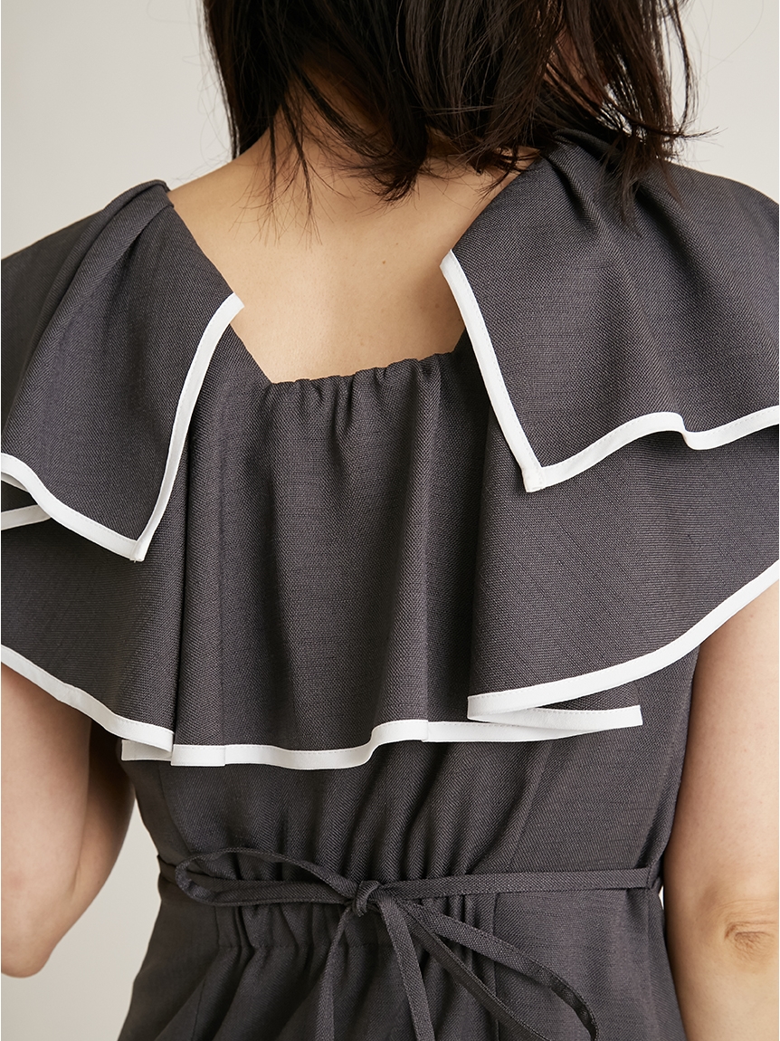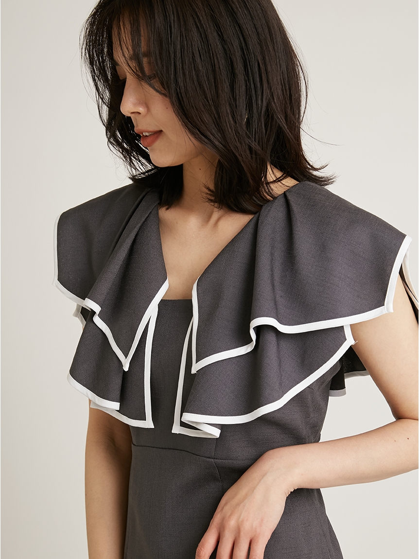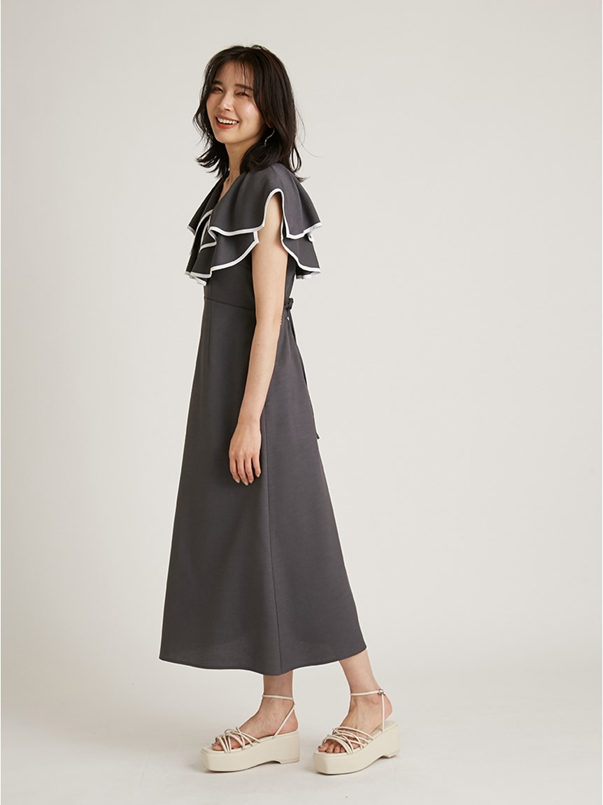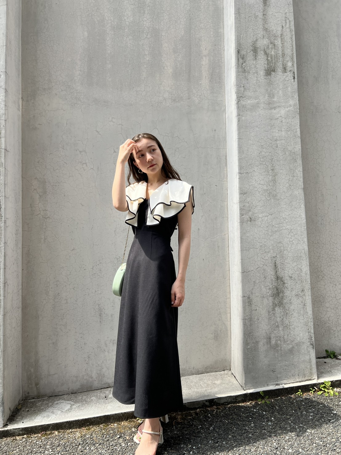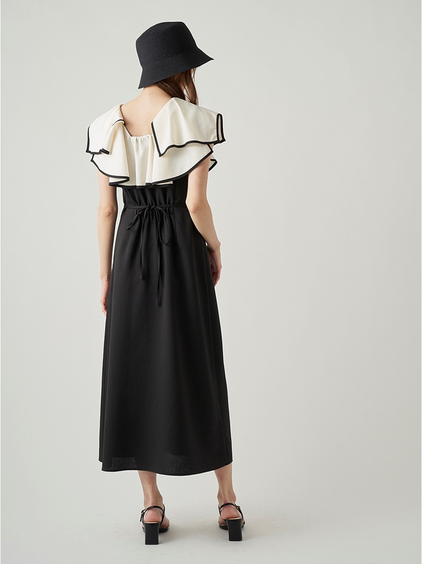 トレンドのパイピングでアクセントを付けたモードなフリルカラーが印象的。前回人気を集めたノースリーブワンピースが、新色を加えた豊富なバリエーション展開で届きました。ハイウエストの切り替えから緩やかに広がるAラインシルエットで、スタイルアップ効果は抜群。ギャザーを効かせたバックウエストには華奢なリボンをあしらい後ろ姿まで抜かりなく仕上げています。