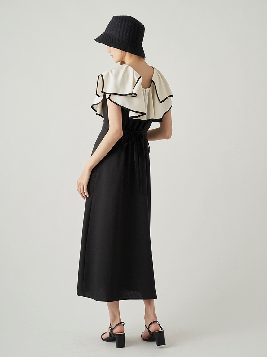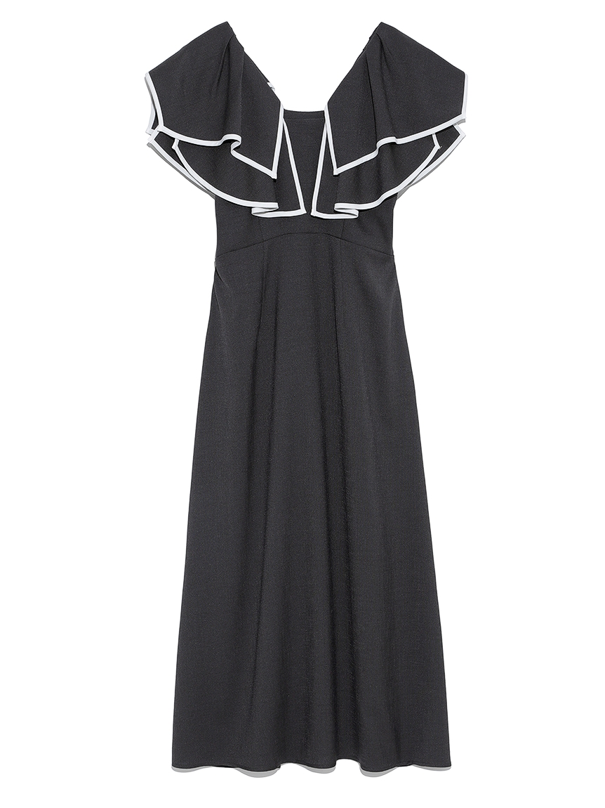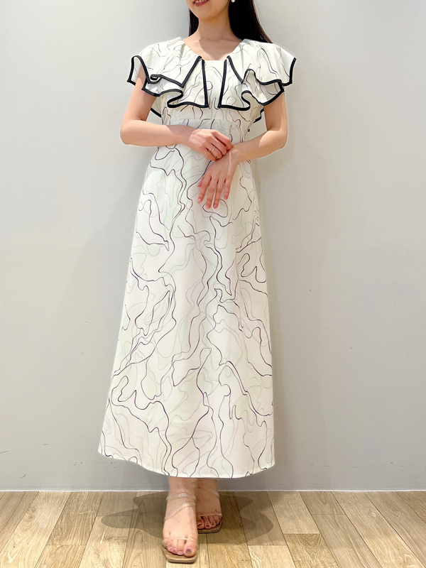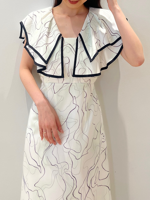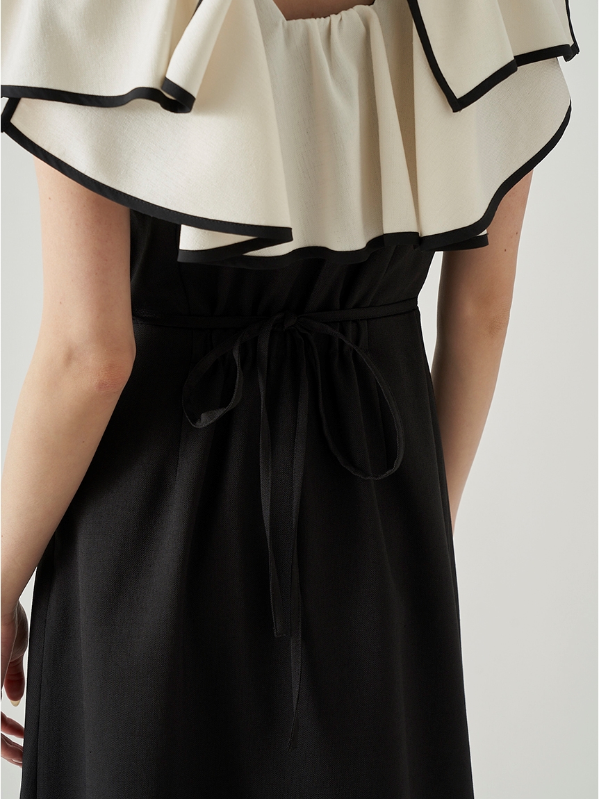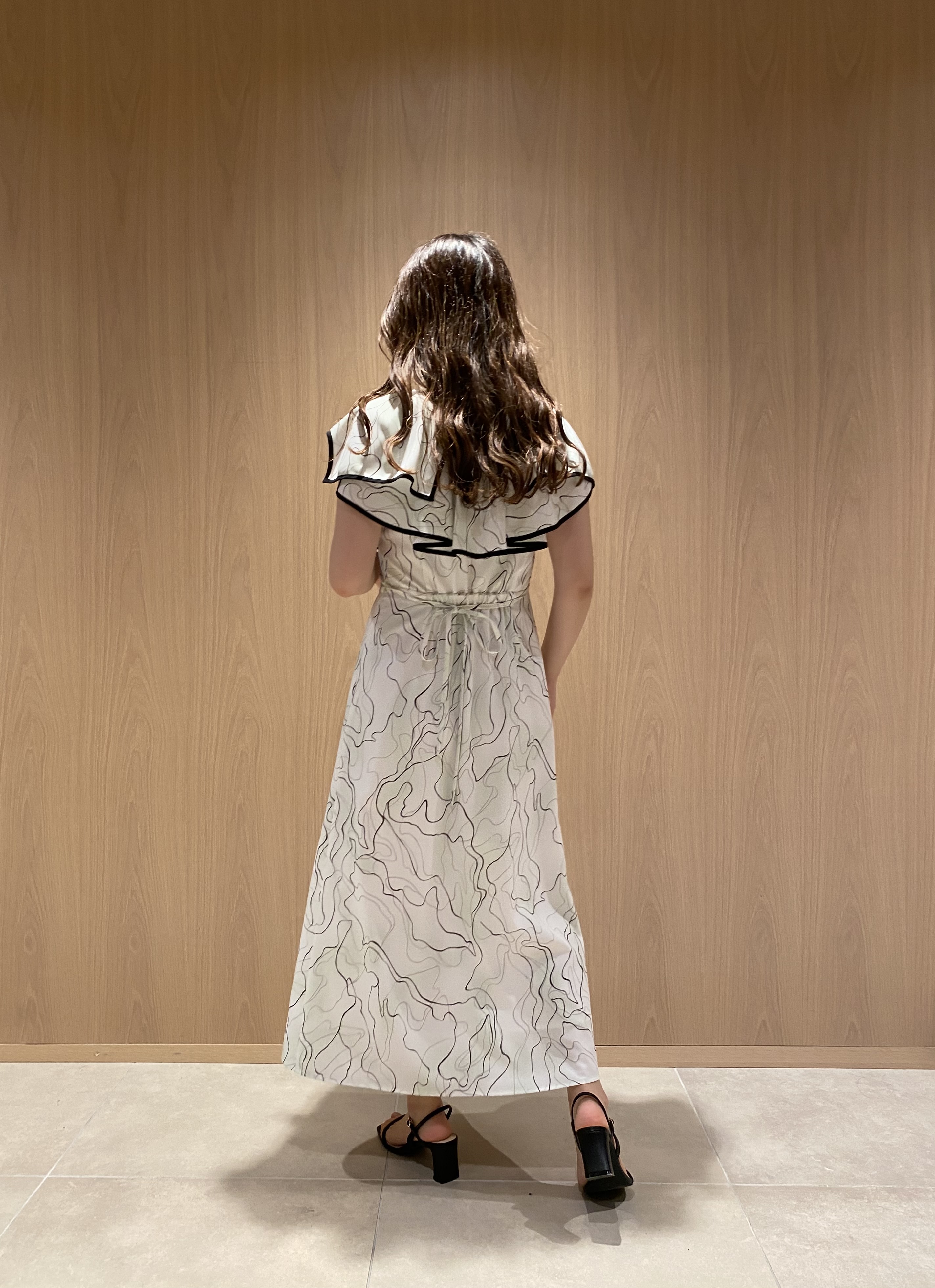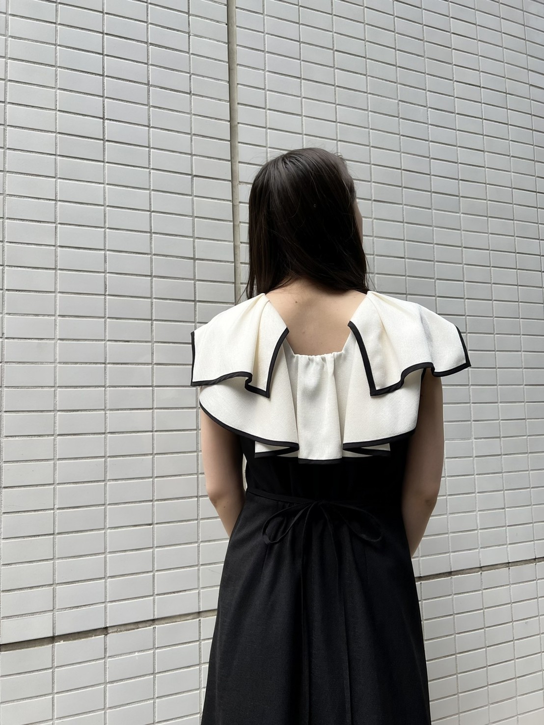 トレンドのパイピングでアクセントを付けたモードなフリルカラーが印象的。前回人気を集めたノースリーブワンピースが、新色を加えた豊富なバリエーション展開で届きました。ハイウエストの切り替えから緩やかに広がるAラインシルエットで、スタイルアップ効果は抜群。ギャザーを効かせたバックウエストには華奢なリボンをあしらい後ろ姿まで抜かりなく仕上げています。