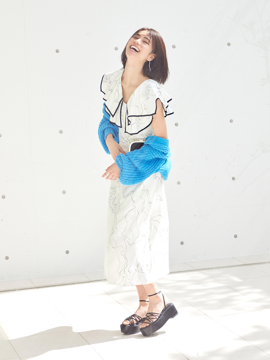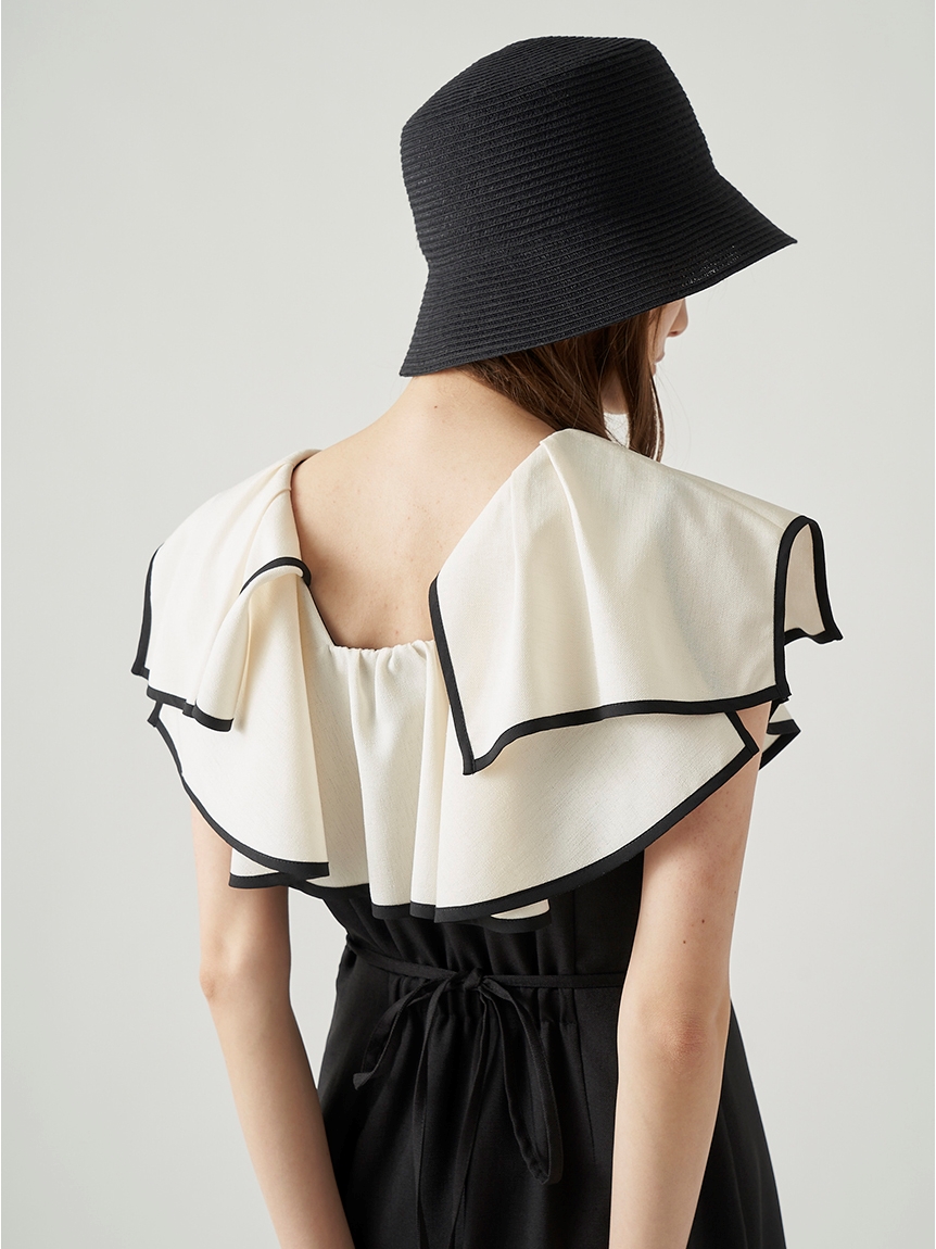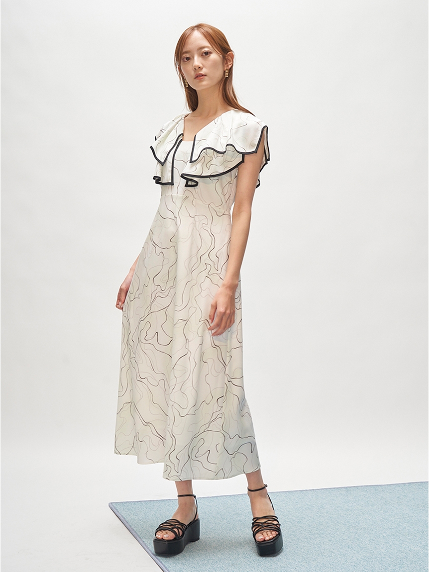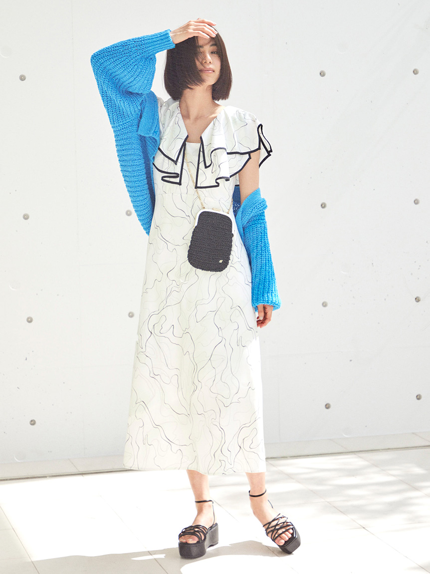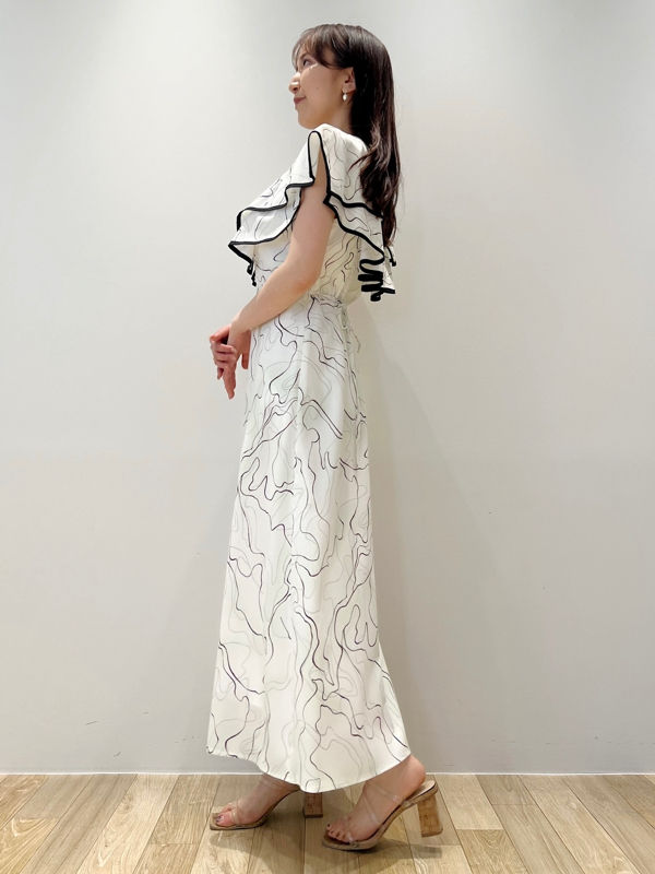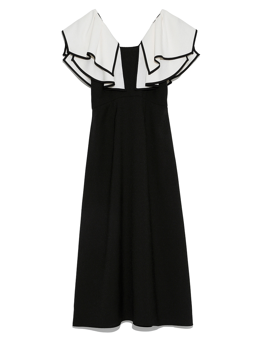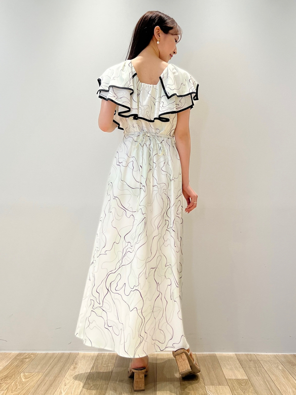 トレンドのパイピングでアクセントを付けたモードなフリルカラーが印象的。前回人気を集めたノースリーブワンピースが、新色を加えた豊富なバリエーション展開で届きました。ハイウエストの切り替えから緩やかに広がるAラインシルエットで、スタイルアップ効果は抜群。ギャザーを効かせたバックウエストには華奢なリボンをあしらい後ろ姿まで抜かりなく仕上げています。