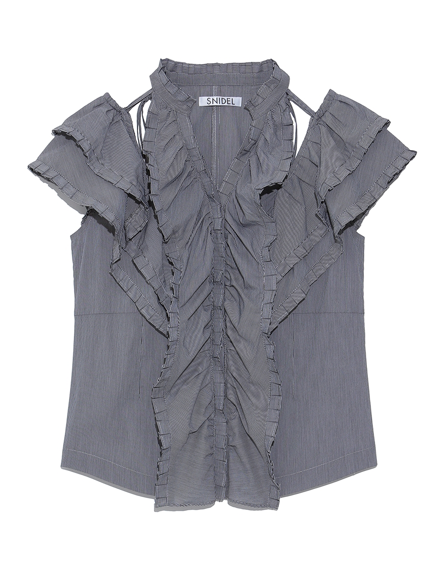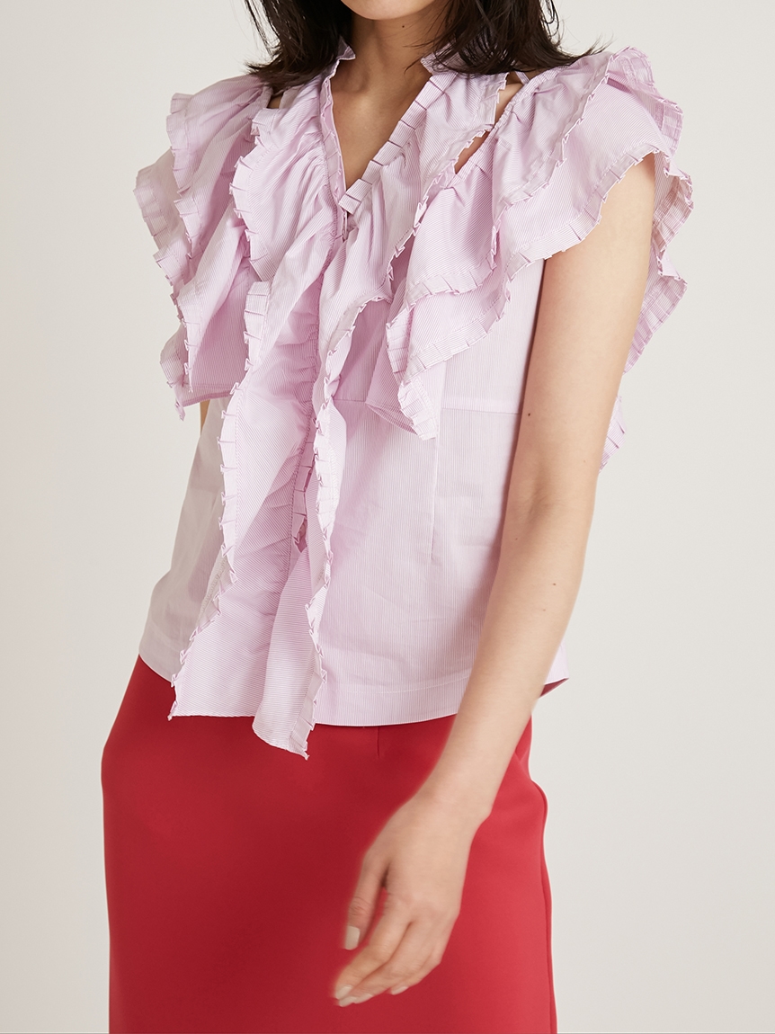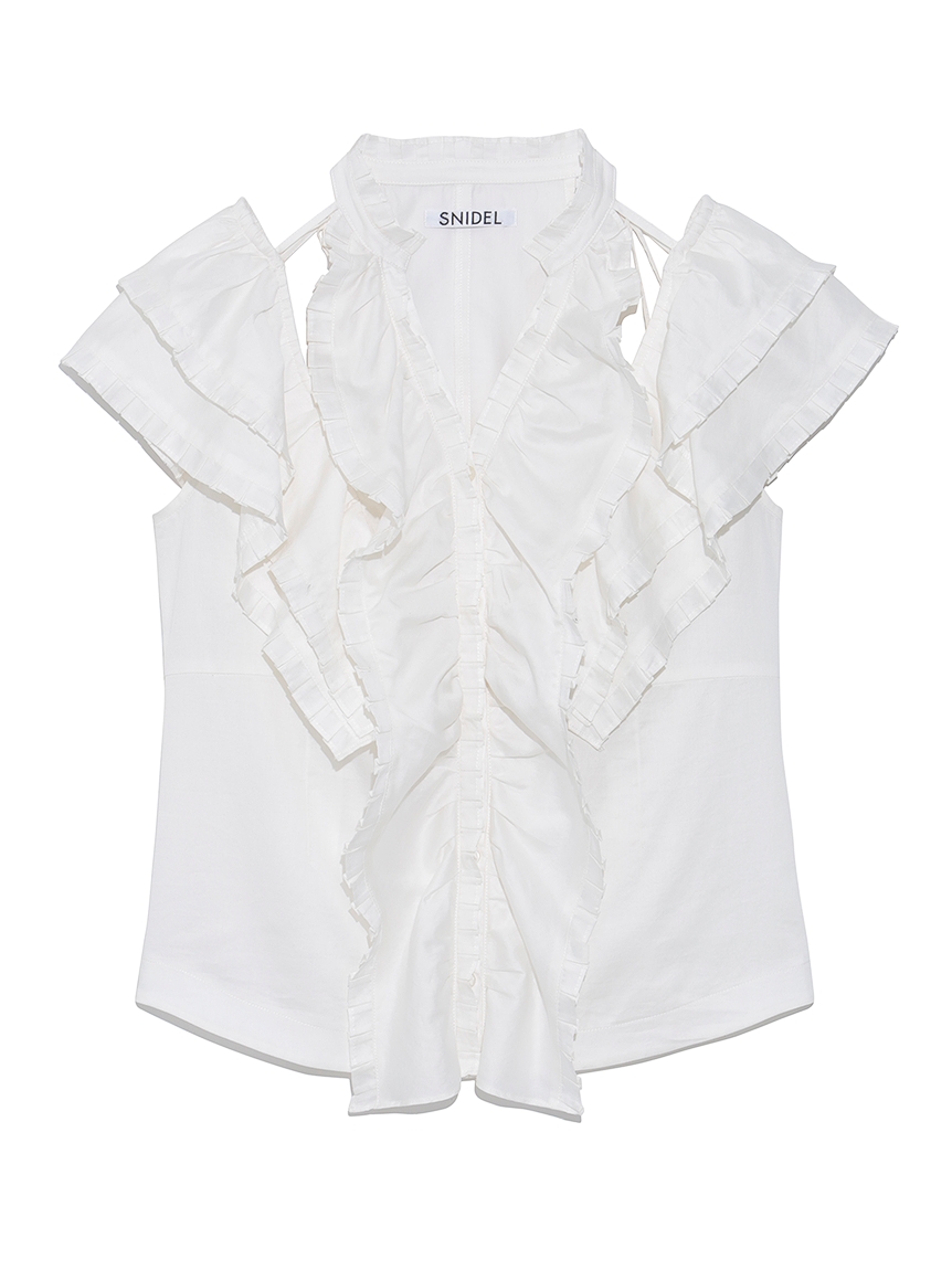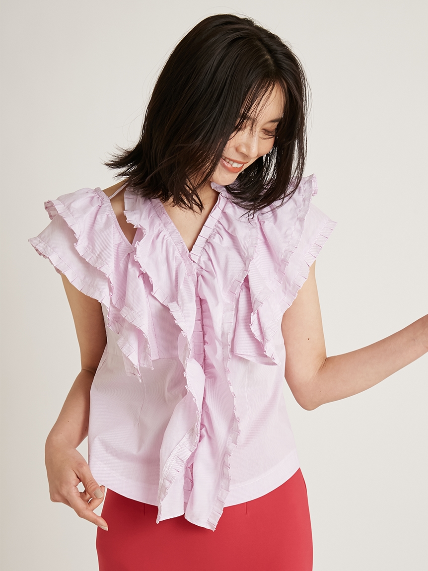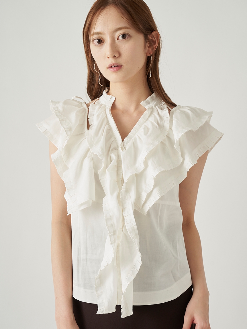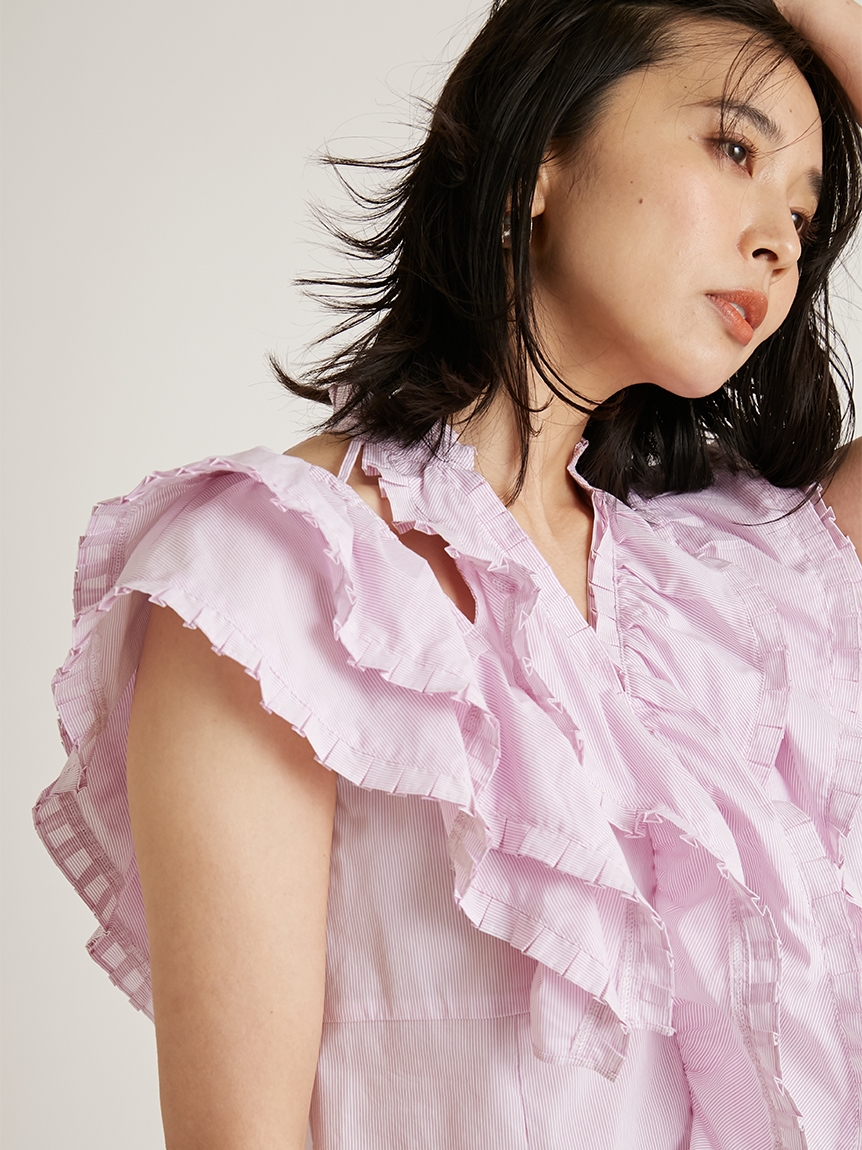 たっぷりとあしらわれたフリルが印象的な、フェミニンムード溢れるブラウス。デコルテの大胆なカッティングで今年らしいヘルシーな肌見せが叶います。袖にボリュームがあり重心を上に持っていっているので、ボトムはすっきりとまとめるのがおすすめ。インでもアウトでも着られるよう計算されたシルエットでパンツともスカートともバランス良く決まります。