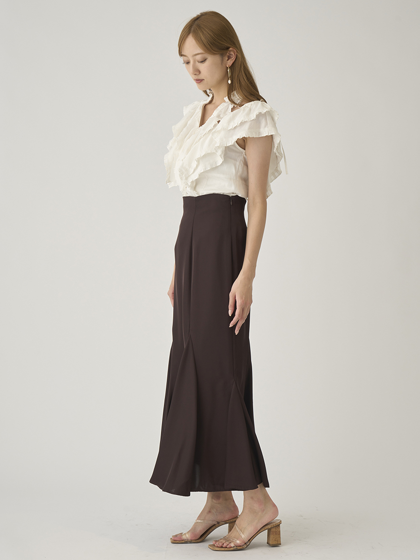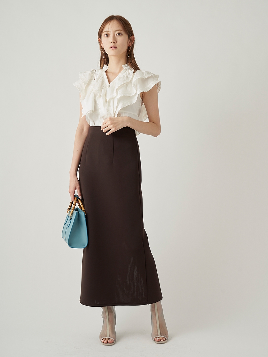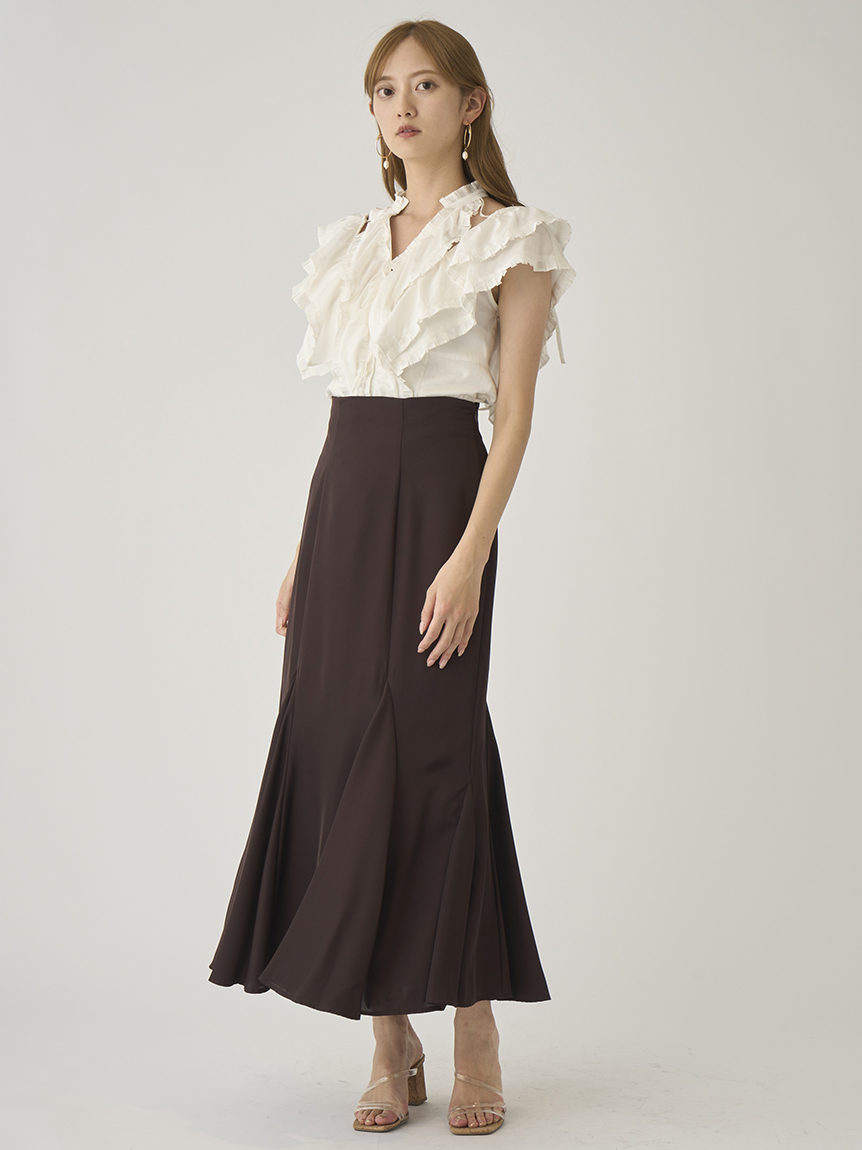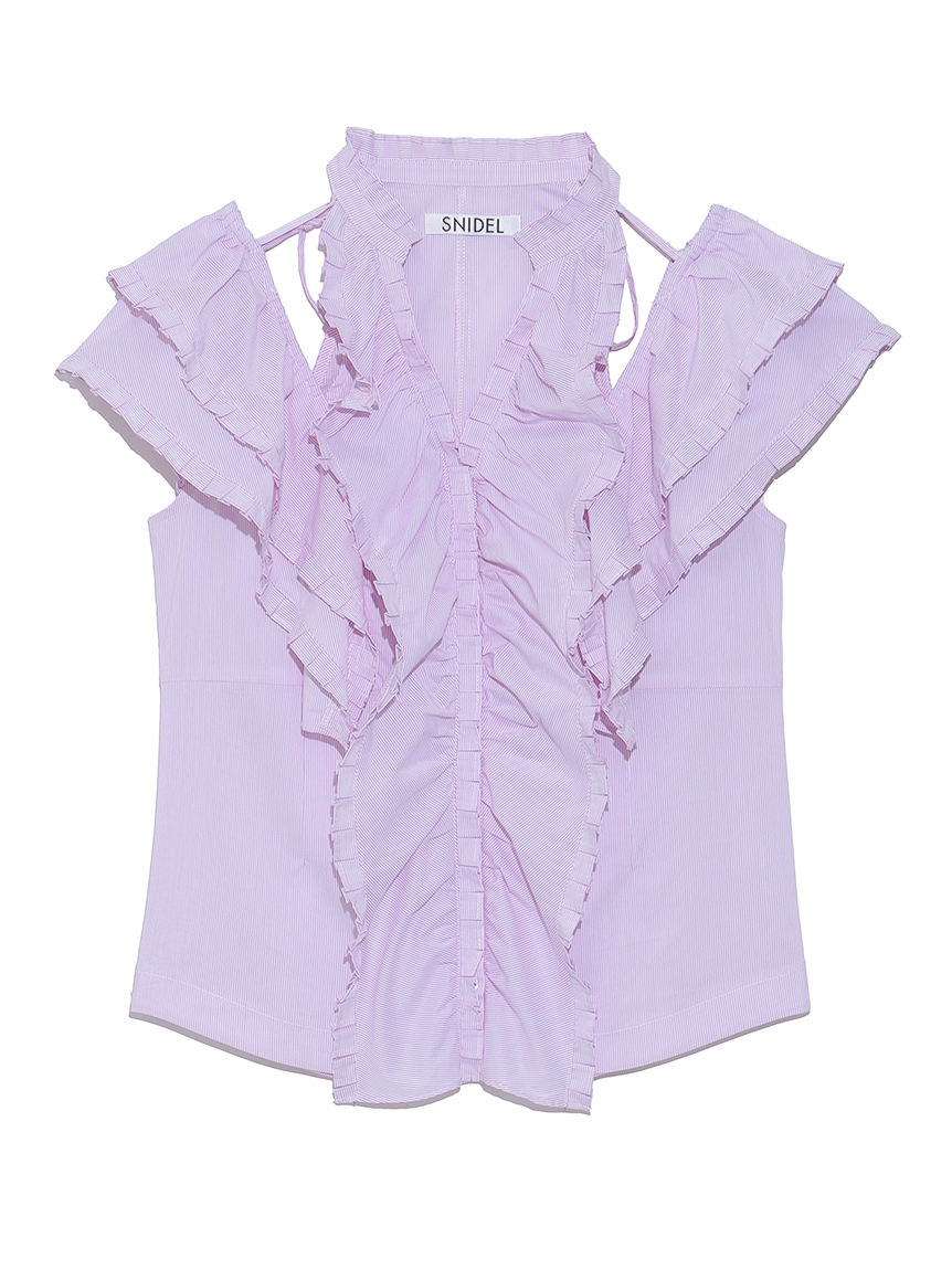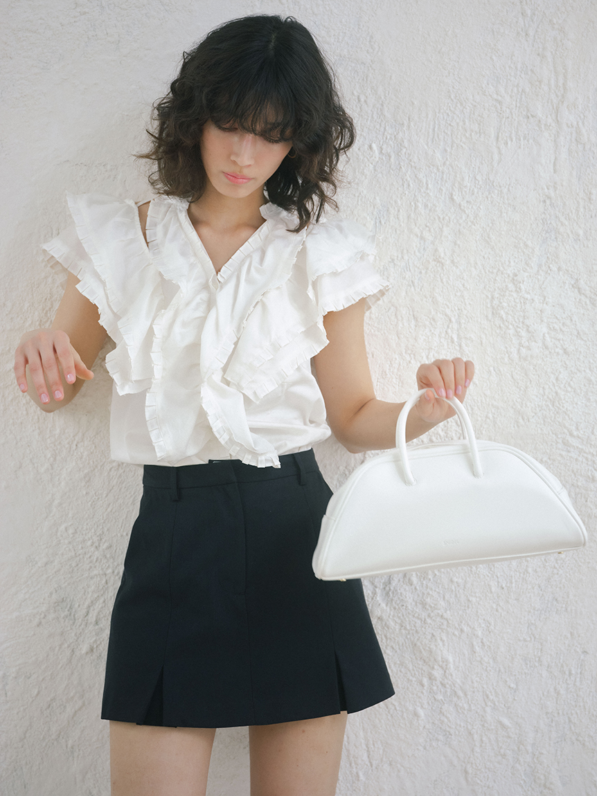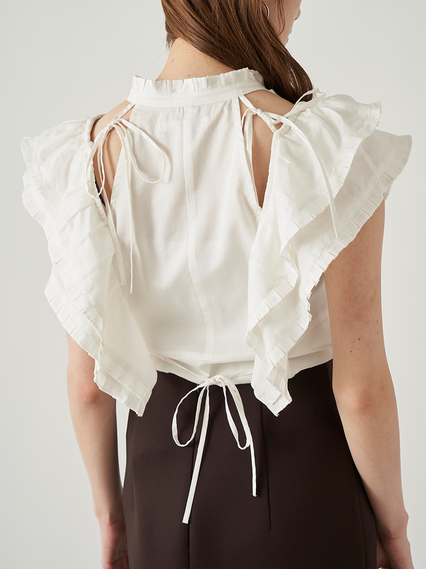 たっぷりとあしらわれたフリルが印象的な、フェミニンムード溢れるブラウス。デコルテの大胆なカッティングで今年らしいヘルシーな肌見せが叶います。袖にボリュームがあり重心を上に持っていっているので、ボトムはすっきりとまとめるのがおすすめ。インでもアウトでも着られるよう計算されたシルエットでパンツともスカートともバランス良く決まります。