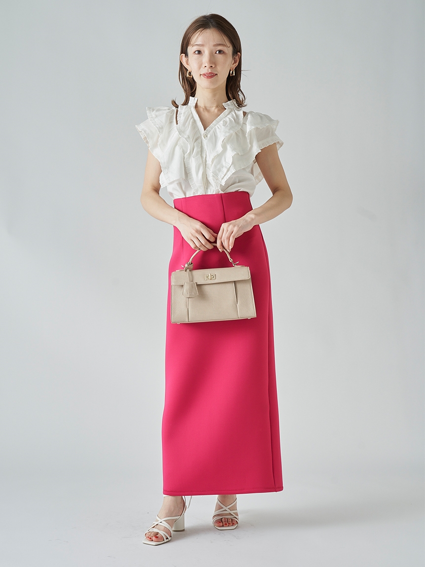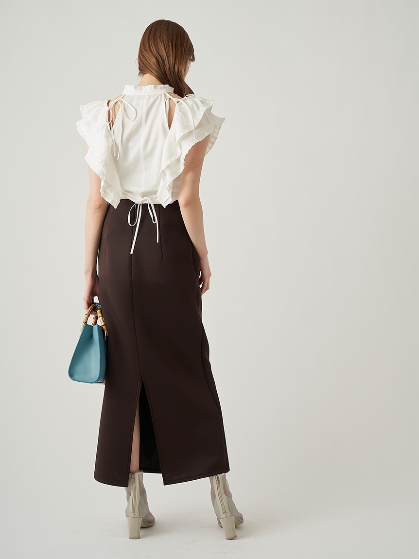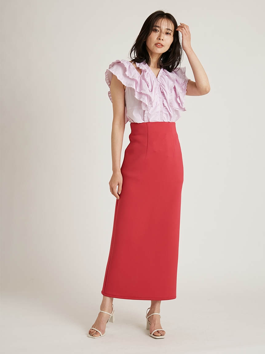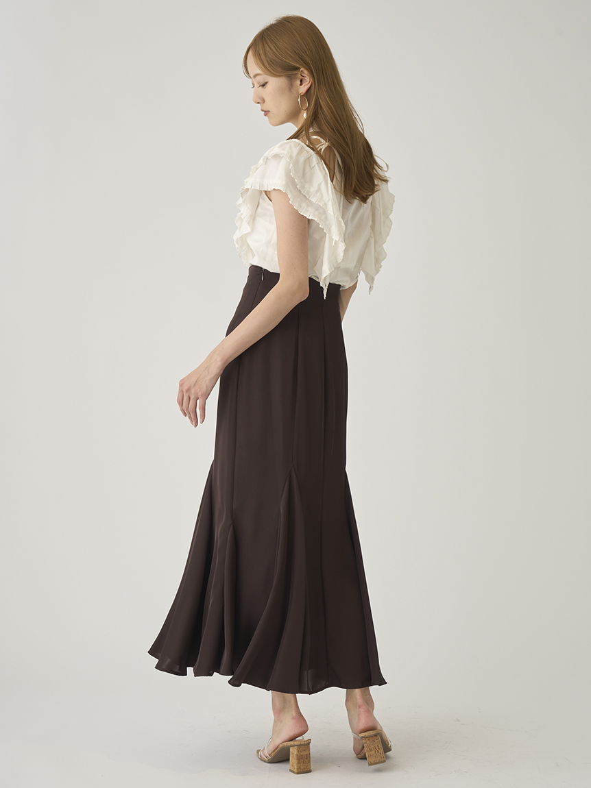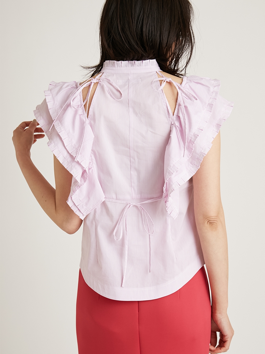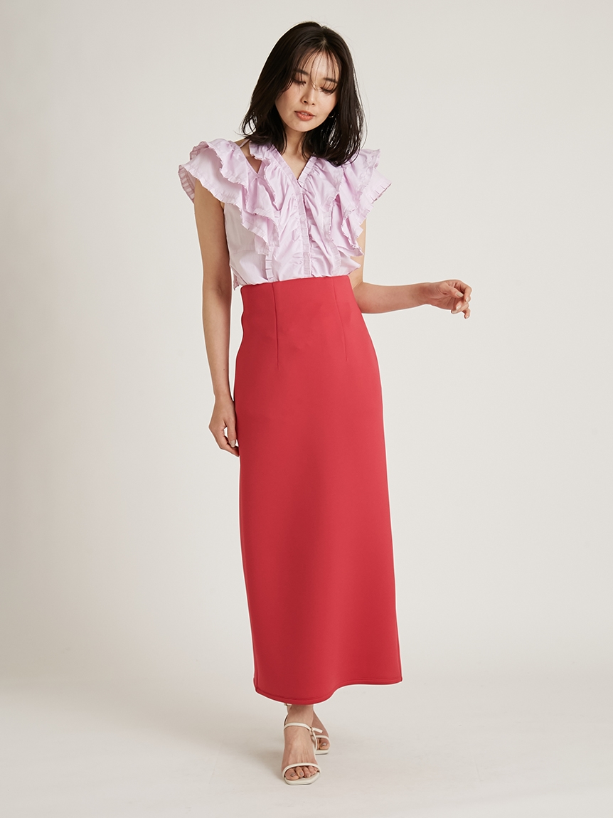 たっぷりとあしらわれたフリルが印象的な、フェミニンムード溢れるブラウス。デコルテの大胆なカッティングで今年らしいヘルシーな肌見せが叶います。袖にボリュームがあり重心を上に持っていっているので、ボトムはすっきりとまとめるのがおすすめ。インでもアウトでも着られるよう計算されたシルエットでパンツともスカートともバランス良く決まります。