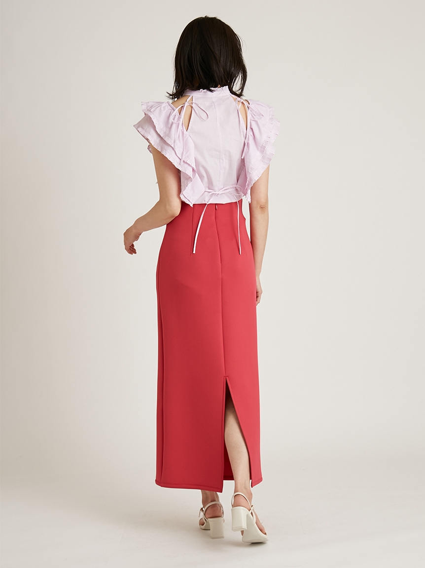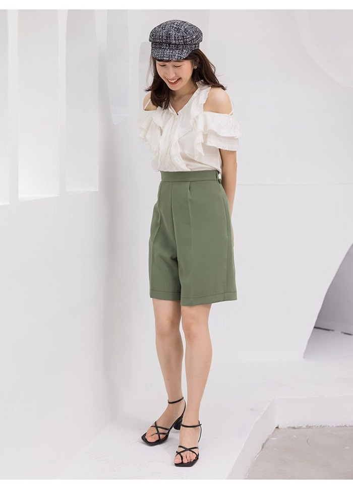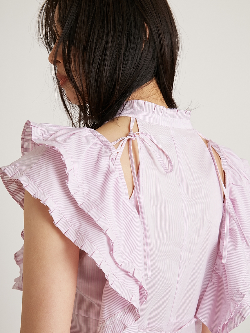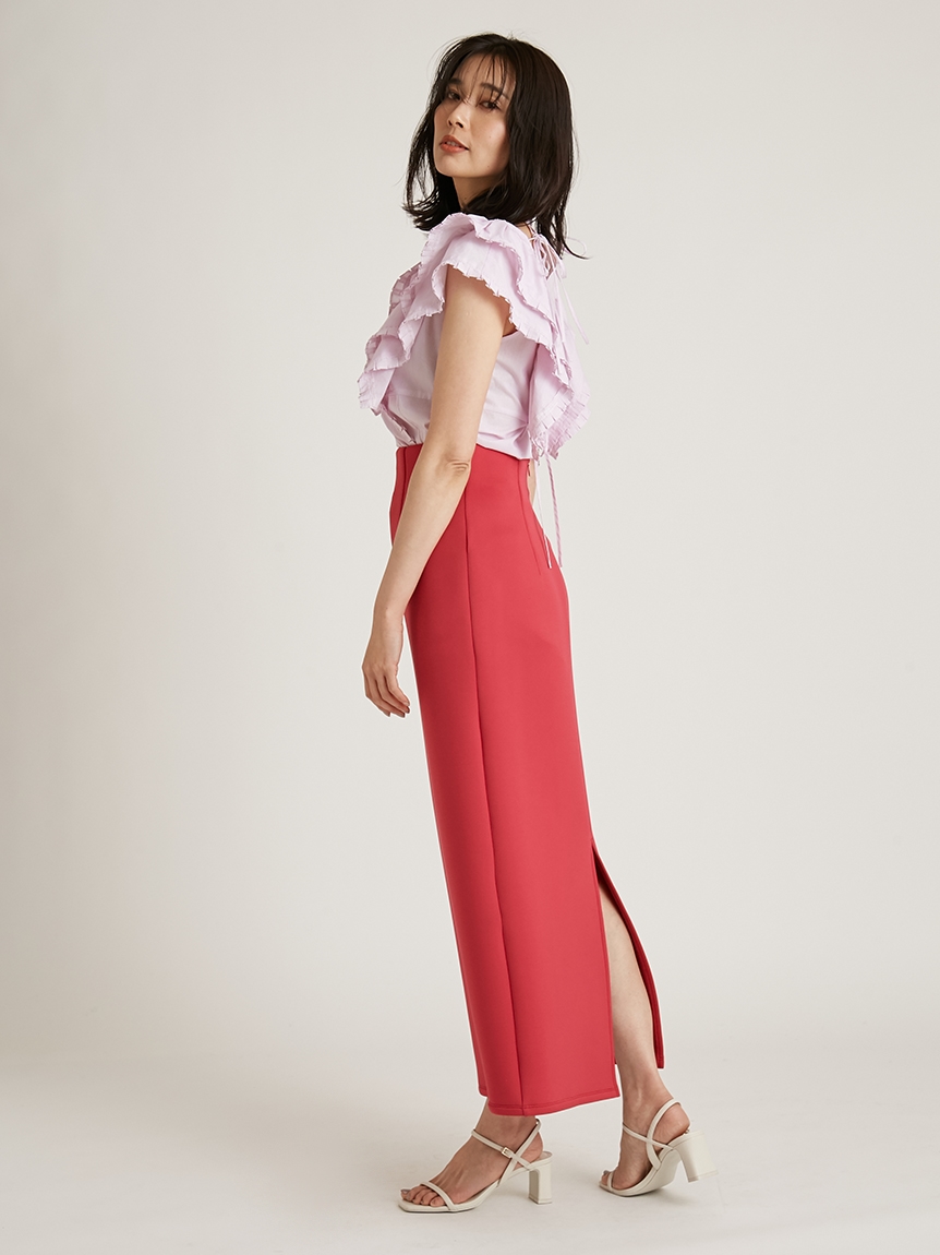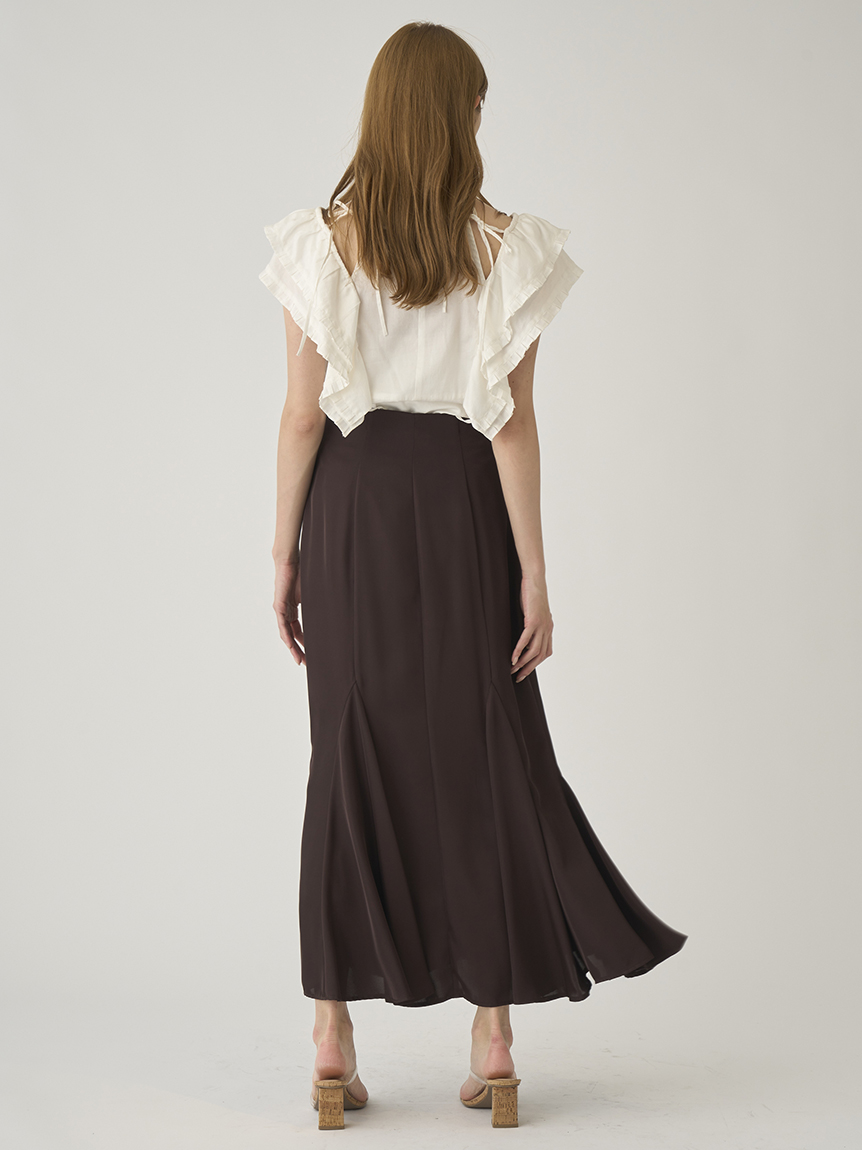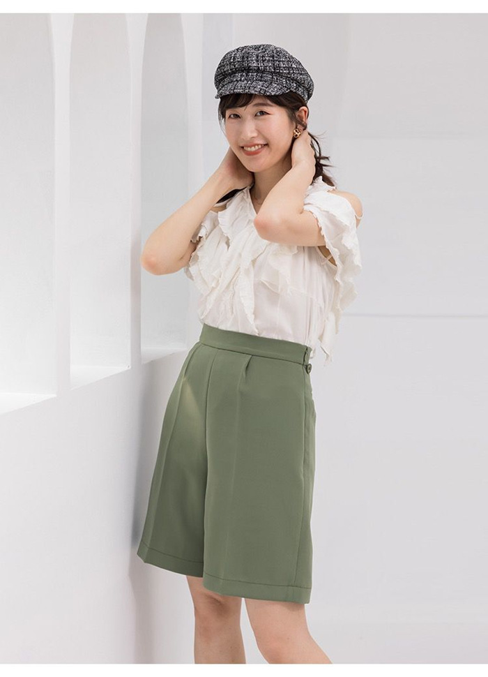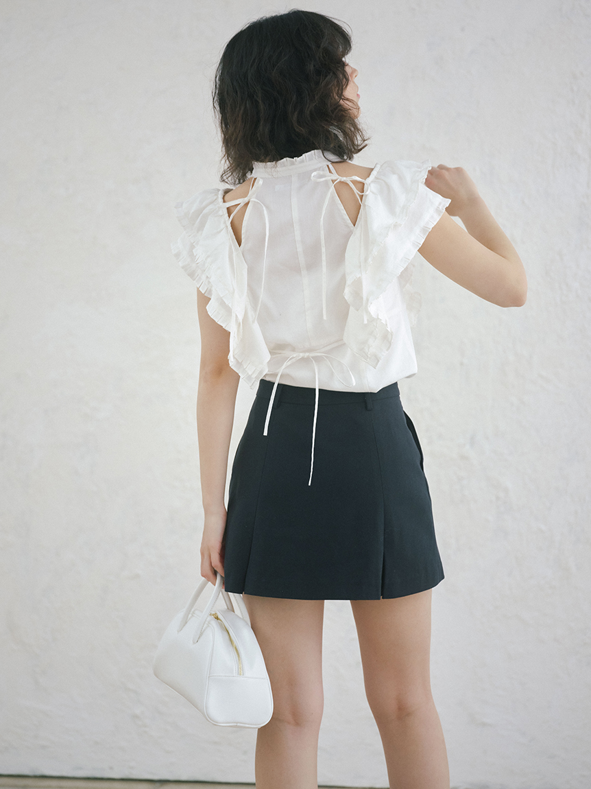 たっぷりとあしらわれたフリルが印象的な、フェミニンムード溢れるブラウス。デコルテの大胆なカッティングで今年らしいヘルシーな肌見せが叶います。袖にボリュームがあり重心を上に持っていっているので、ボトムはすっきりとまとめるのがおすすめ。インでもアウトでも着られるよう計算されたシルエットでパンツともスカートともバランス良く決まります。