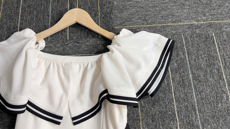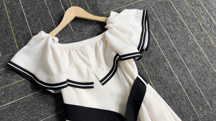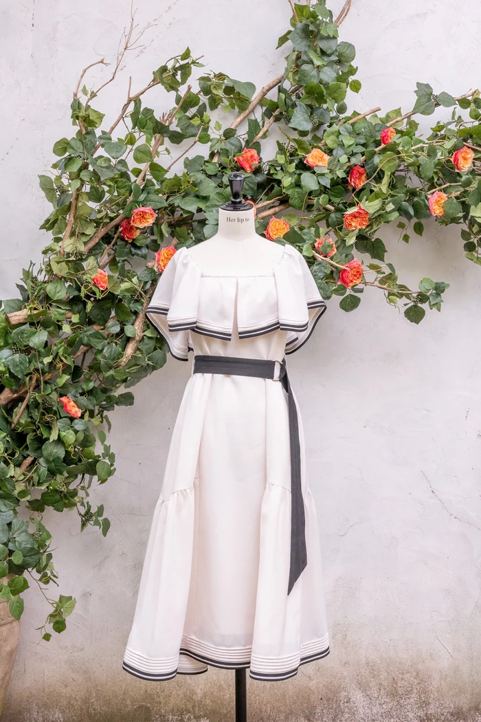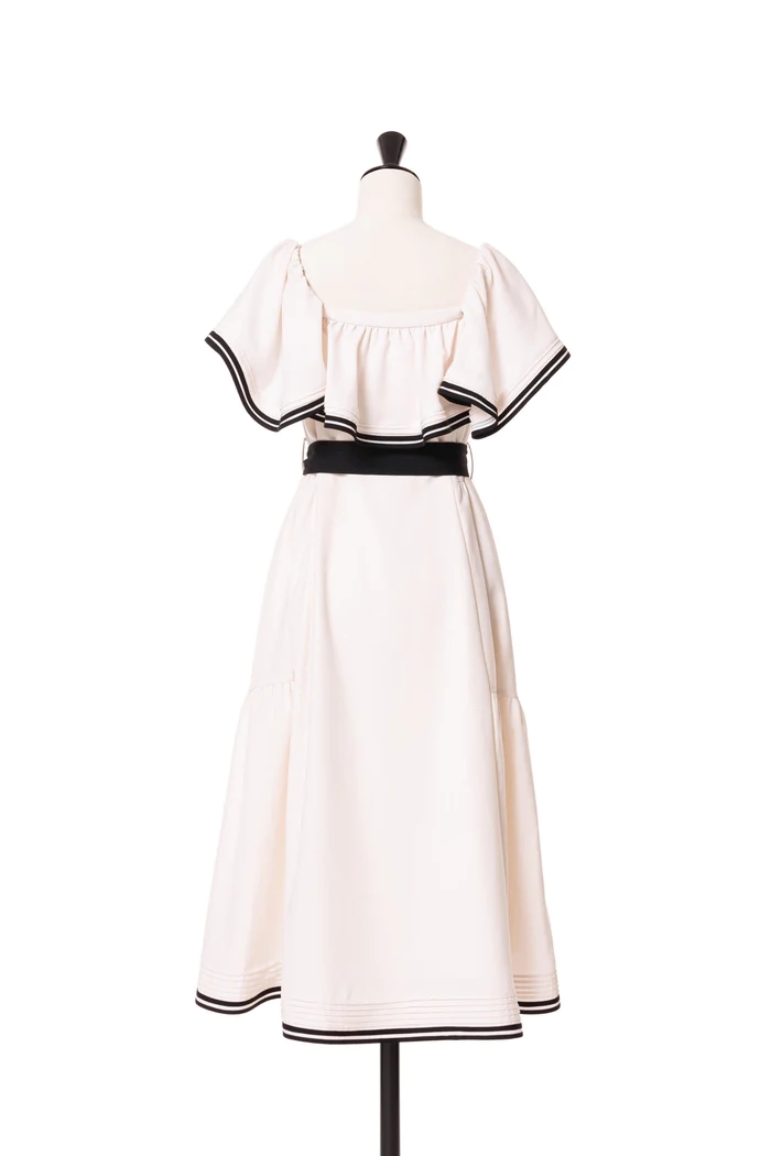 バイカラーのベルトや2本ラインのトリミングが魅力的なドレス。