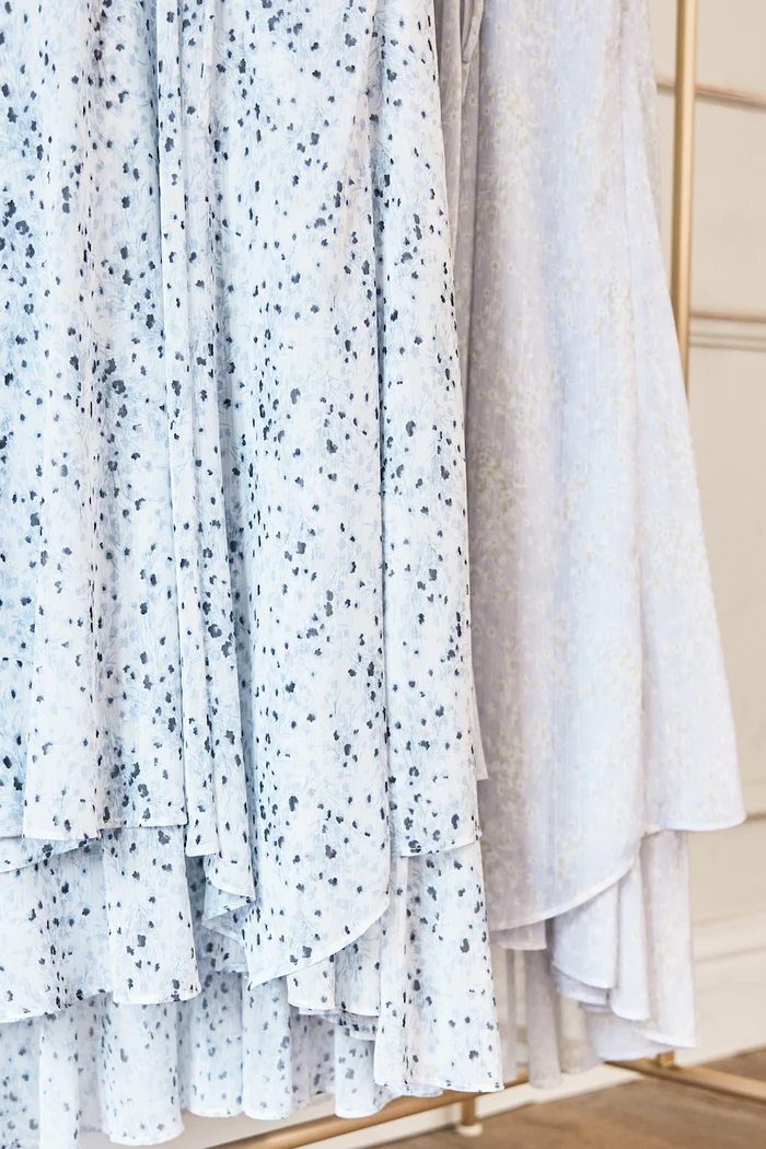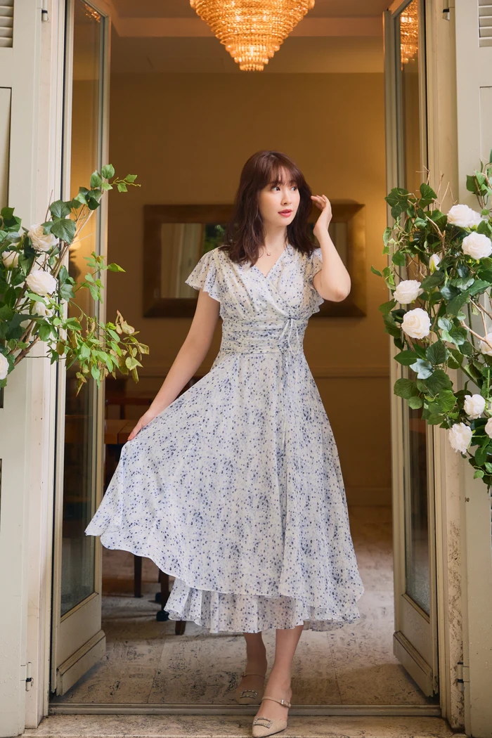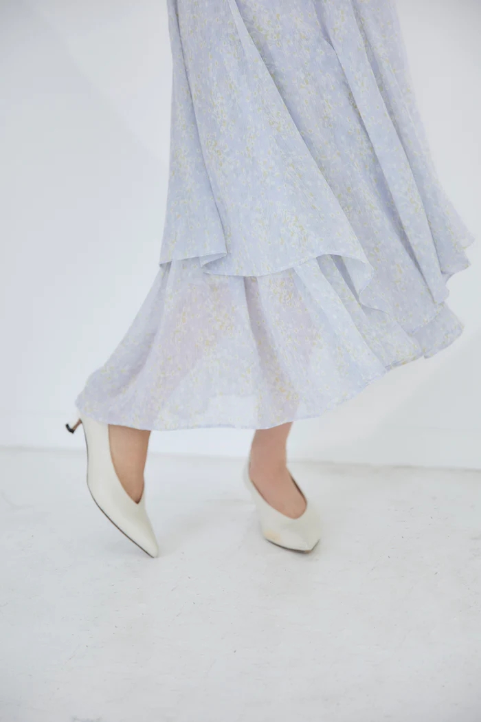 ふわっとウエストからゆるやかにヘムラインを描くスカートが、動いた時に優雅なシルエットに。