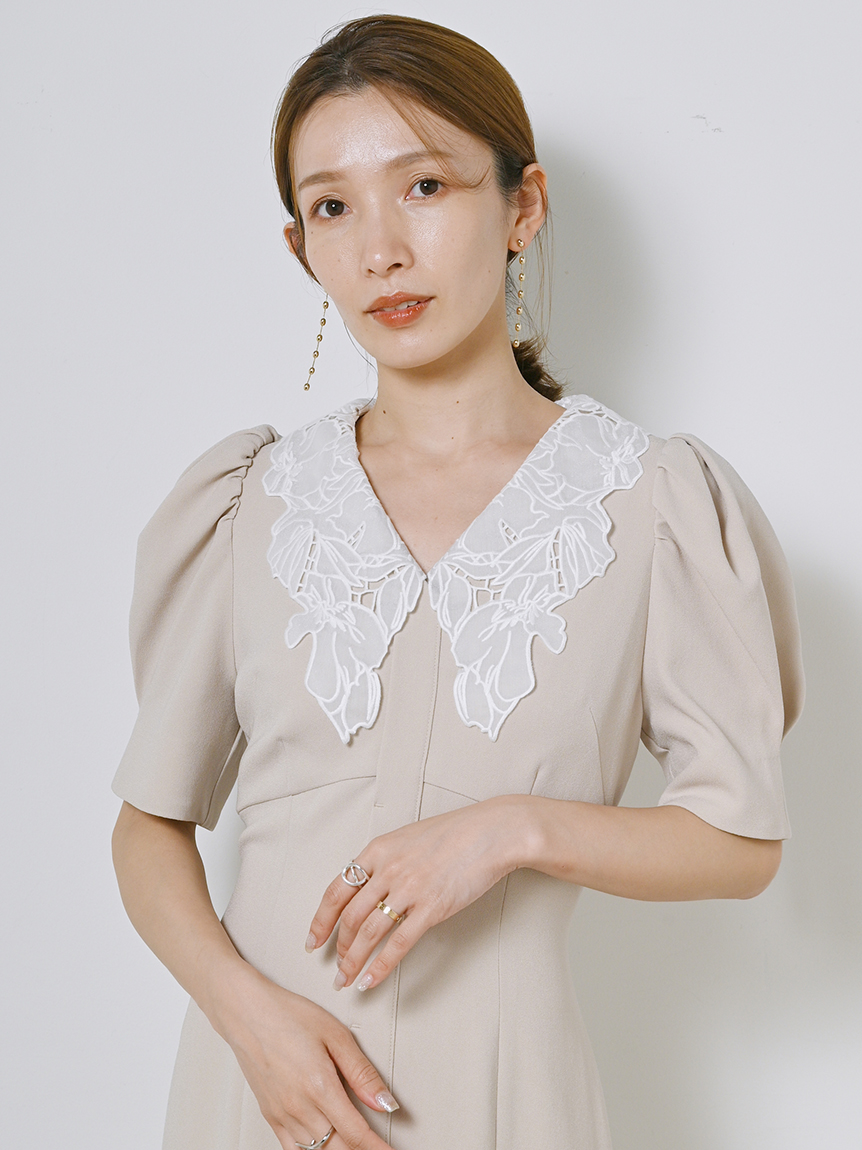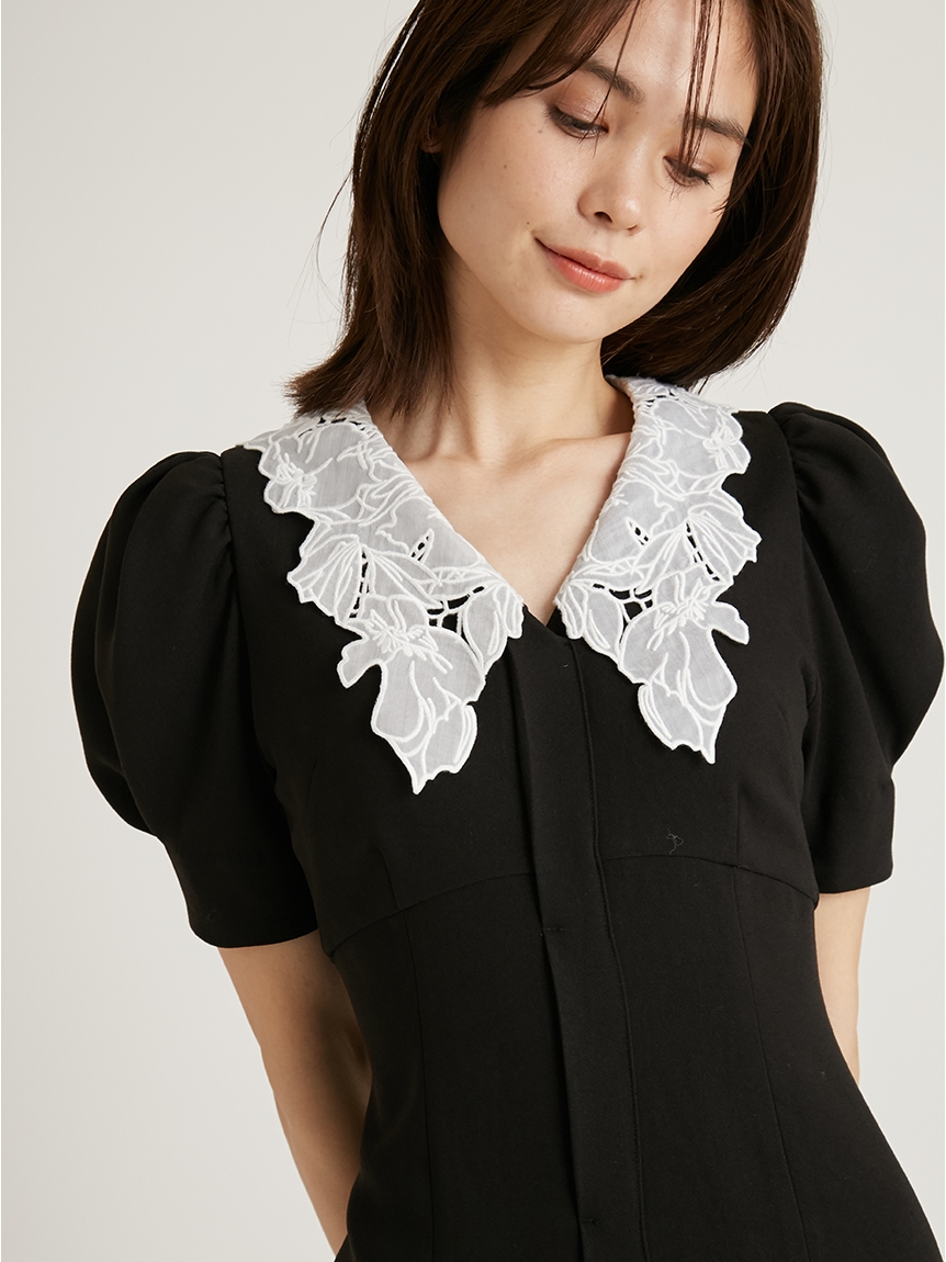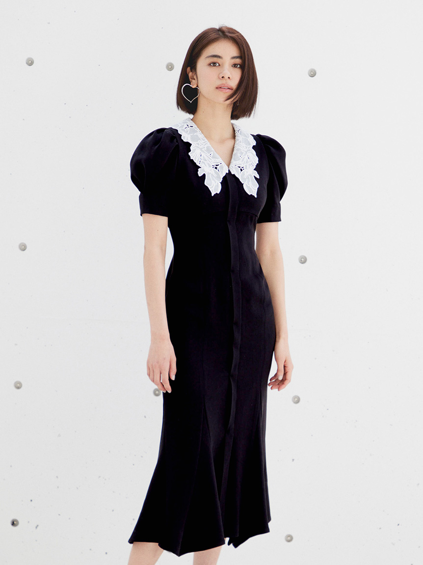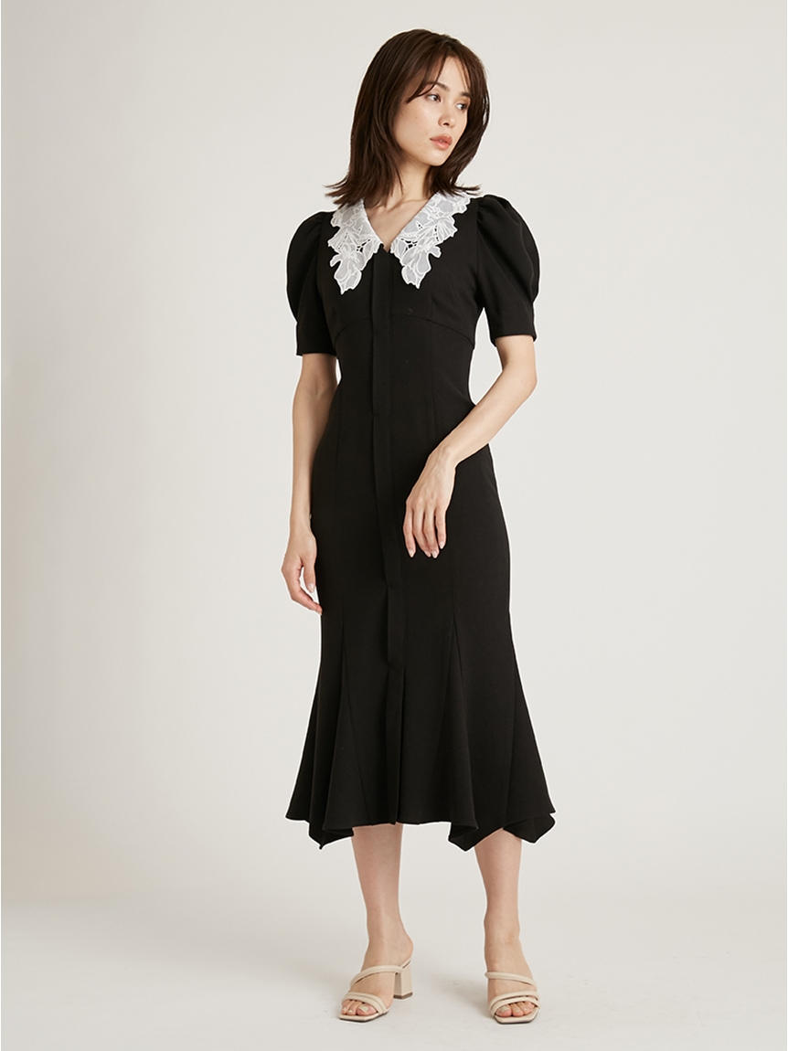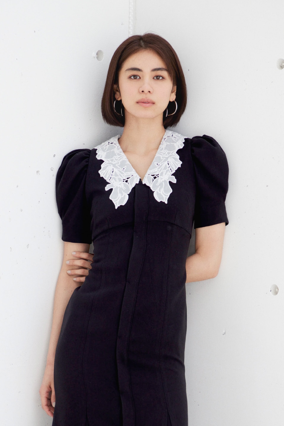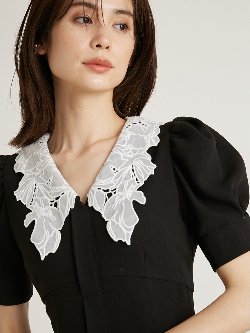 細やかな刺繍が施されたホワイトカラーが印象的な、クラシカルな雰囲気のワンピース。襟は取り外し可能な2WAYデザインなので、様々なオケージョンシーンからオフィスなどのデイリーにも、幅広いコーディネートに活躍してくれます。巧みな切り替えで仕立てられた美しいマーメイドシルエットで、女性らしさは一気に加速。イレギュラーなヘムラインがさり気なくモードなアクセントを添えています。