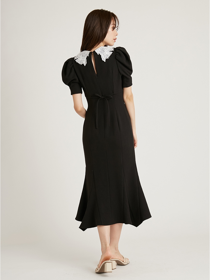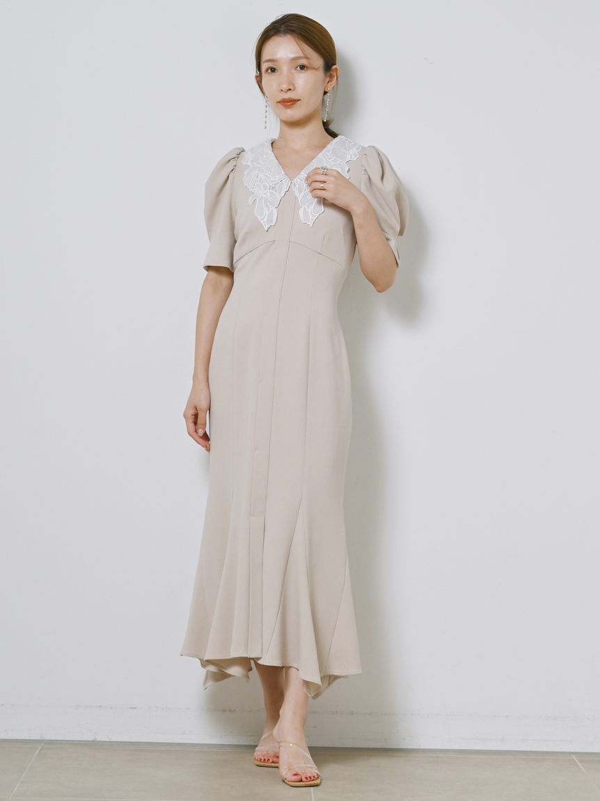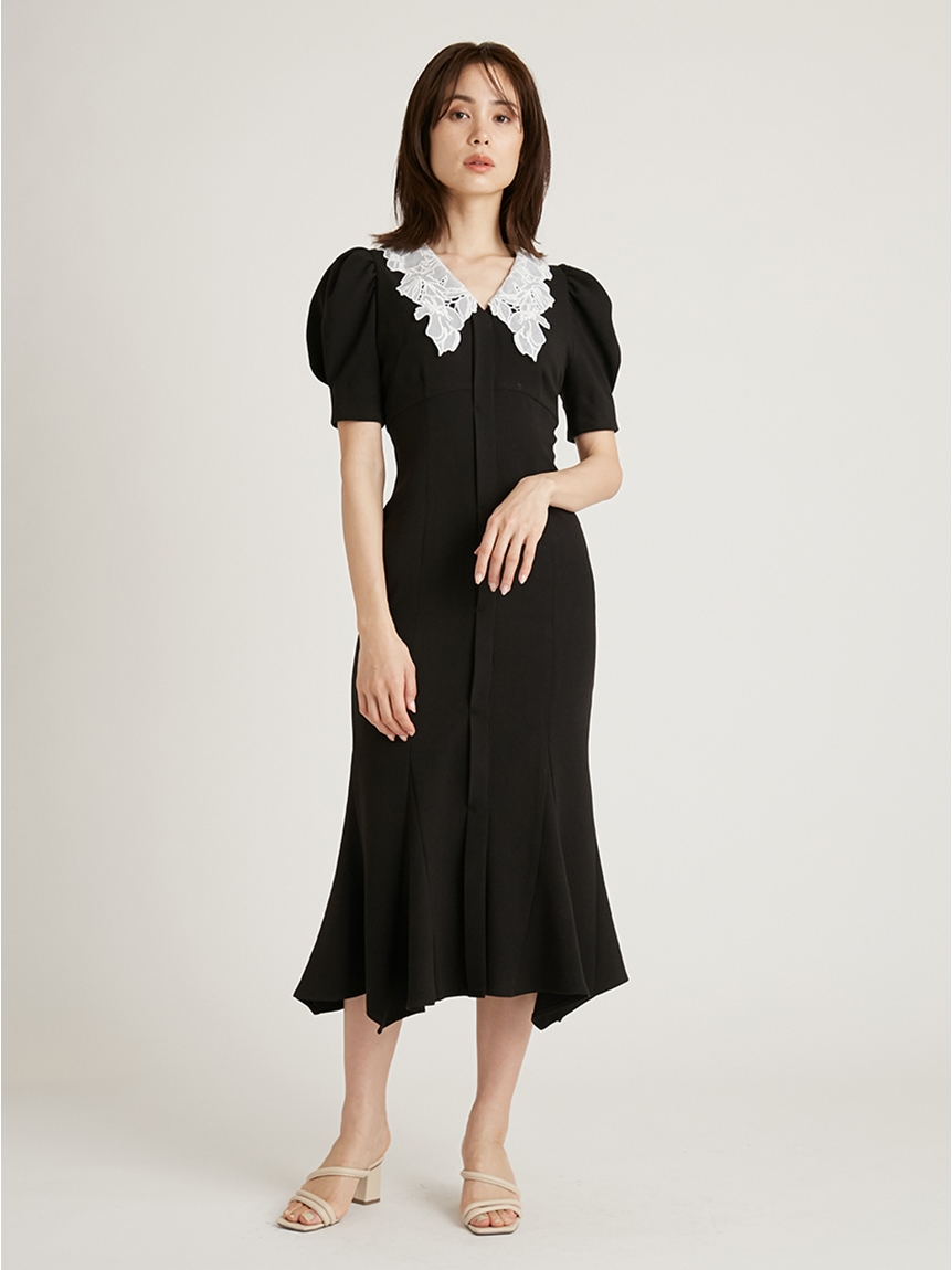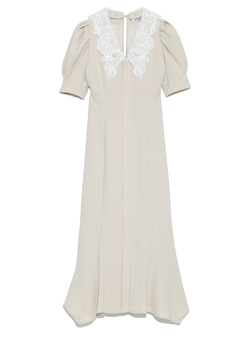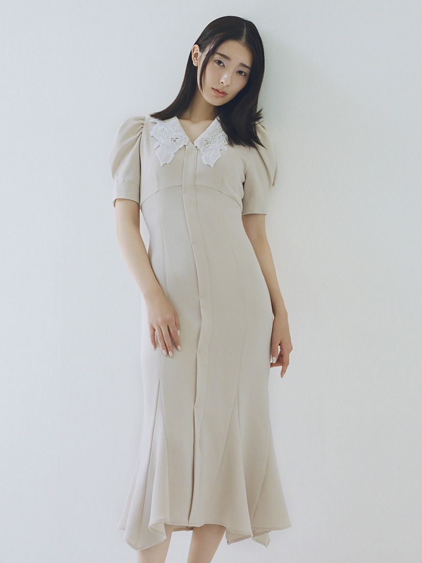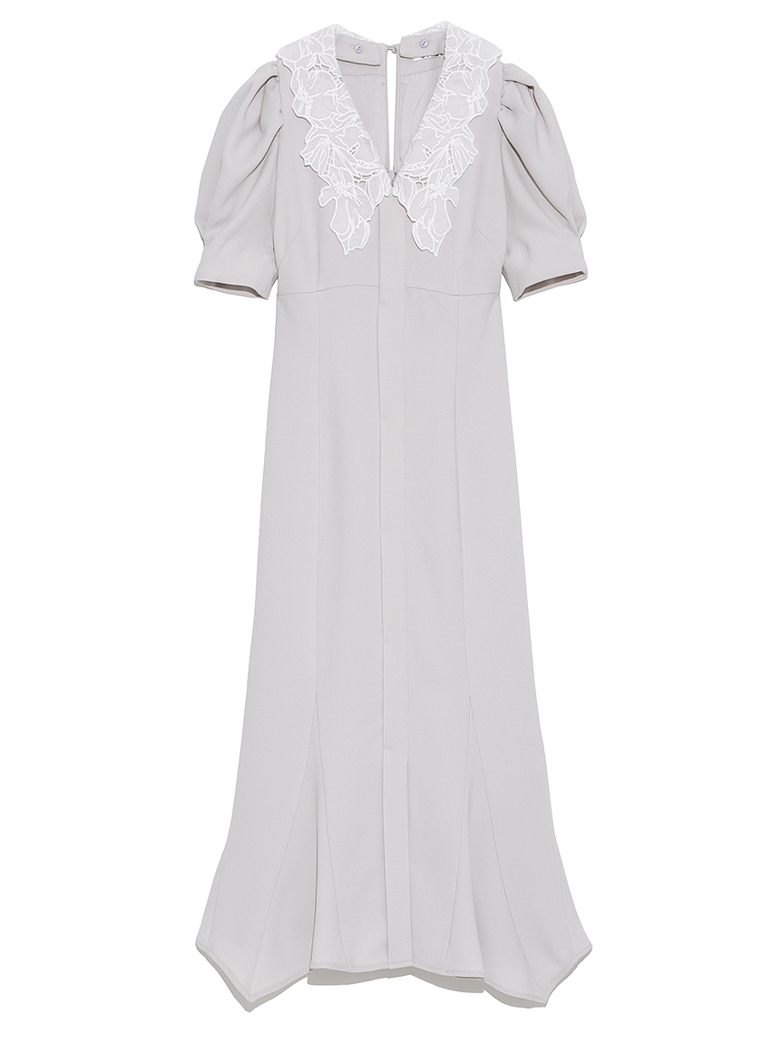 細やかな刺繍が施されたホワイトカラーが印象的な、クラシカルな雰囲気のワンピース。襟は取り外し可能な2WAYデザインなので、様々なオケージョンシーンからオフィスなどのデイリーにも、幅広いコーディネートに活躍してくれます。巧みな切り替えで仕立てられた美しいマーメイドシルエットで、女性らしさは一気に加速。イレギュラーなヘムラインがさり気なくモードなアクセントを添えています。
