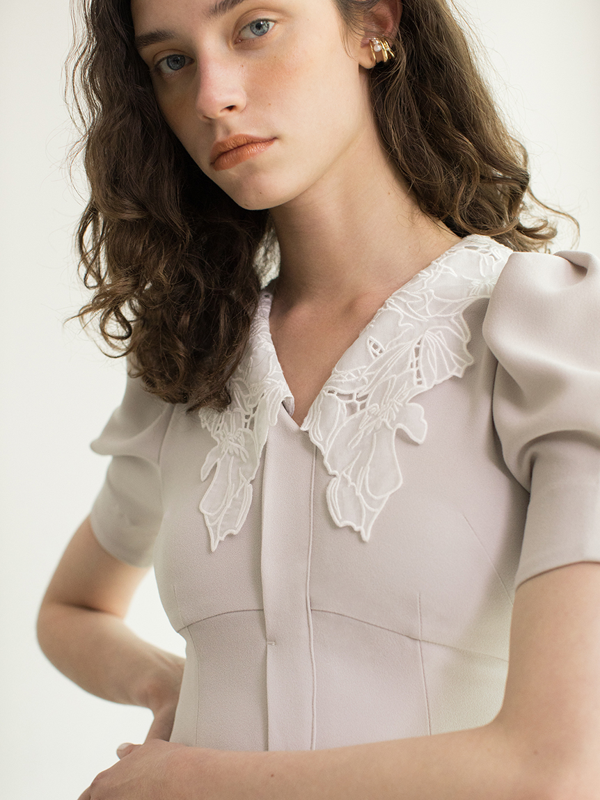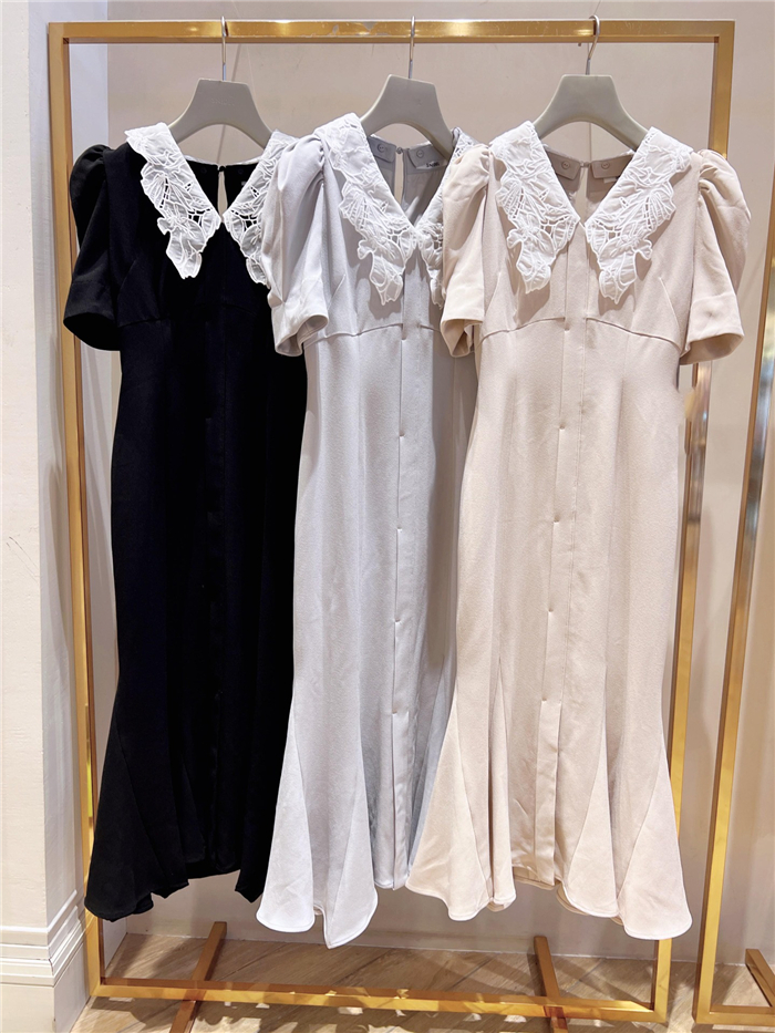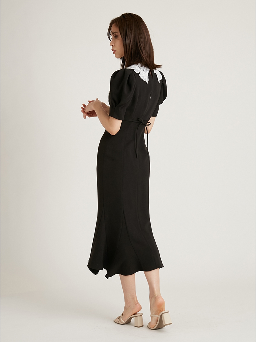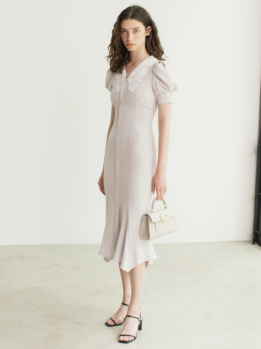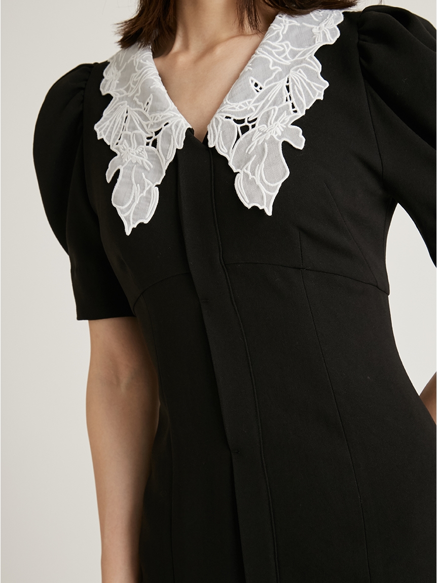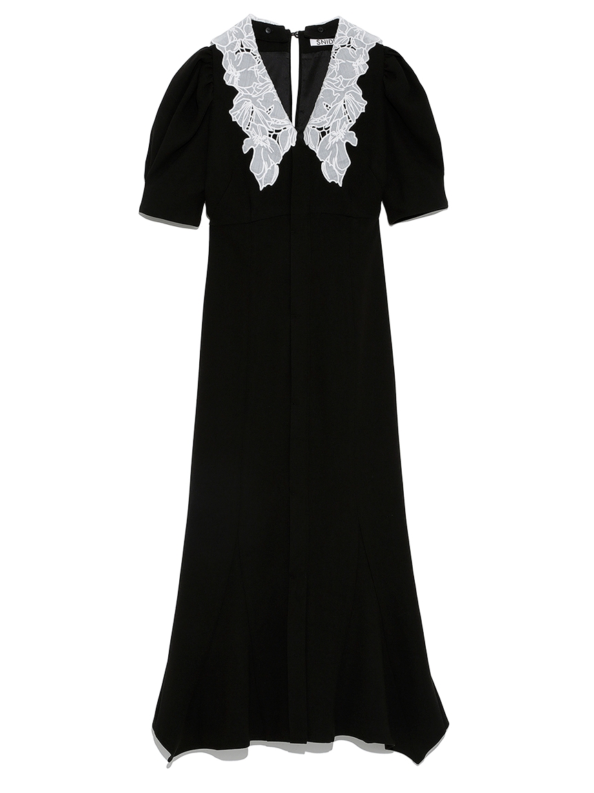 細やかな刺繍が施されたホワイトカラーが印象的な、クラシカルな雰囲気のワンピース。襟は取り外し可能な2WAYデザインなので、様々なオケージョンシーンからオフィスなどのデイリーにも、幅広いコーディネートに活躍してくれます。巧みな切り替えで仕立てられた美しいマーメイドシルエットで、女性らしさは一気に加速。イレギュラーなヘムラインがさり気なくモードなアクセントを添えています。