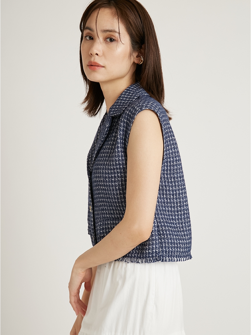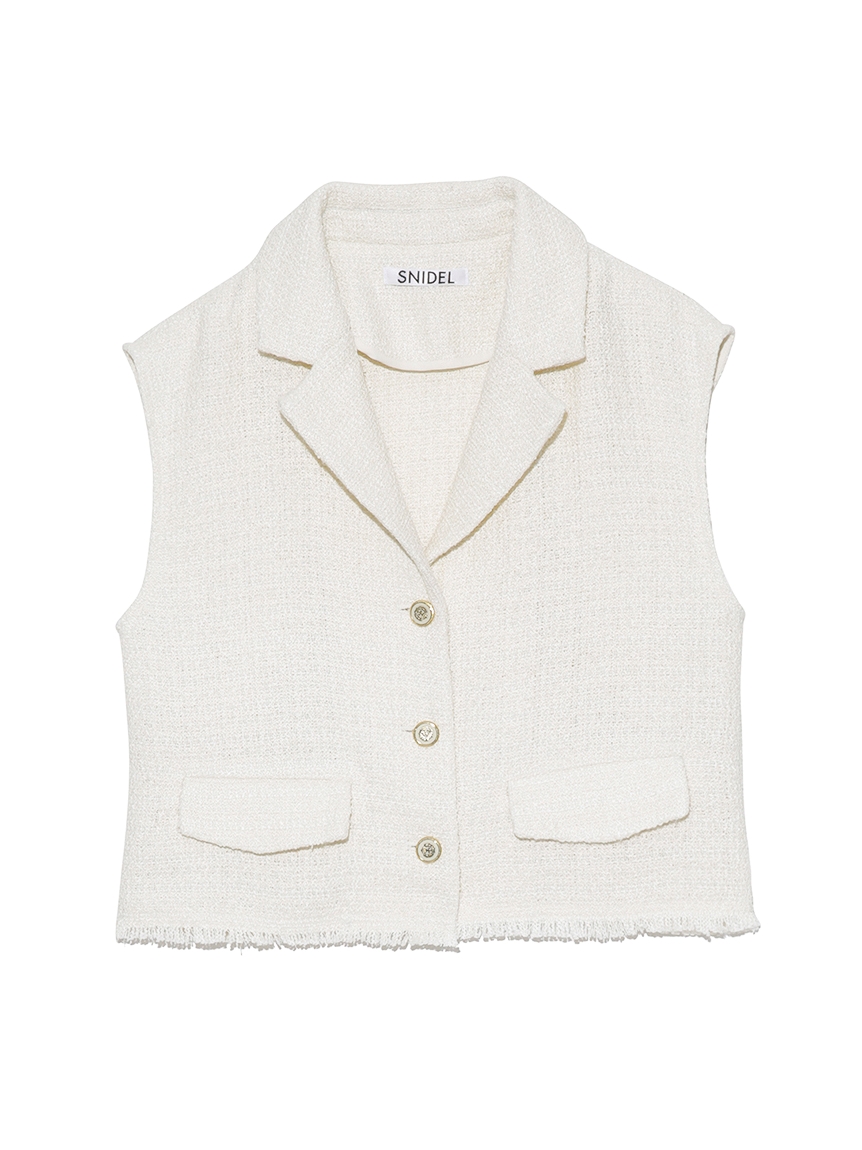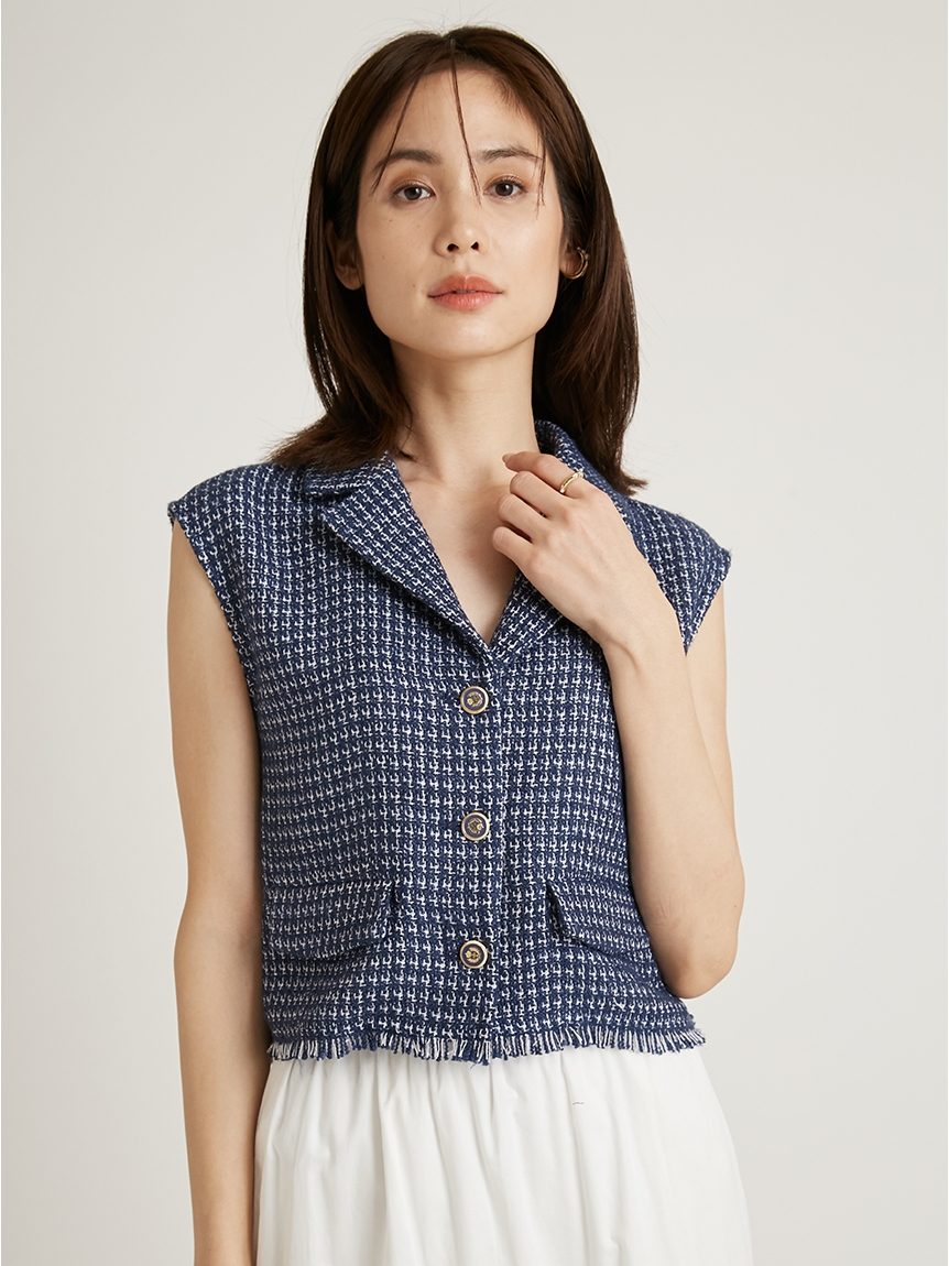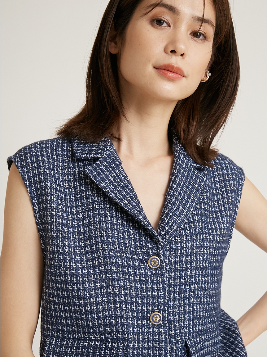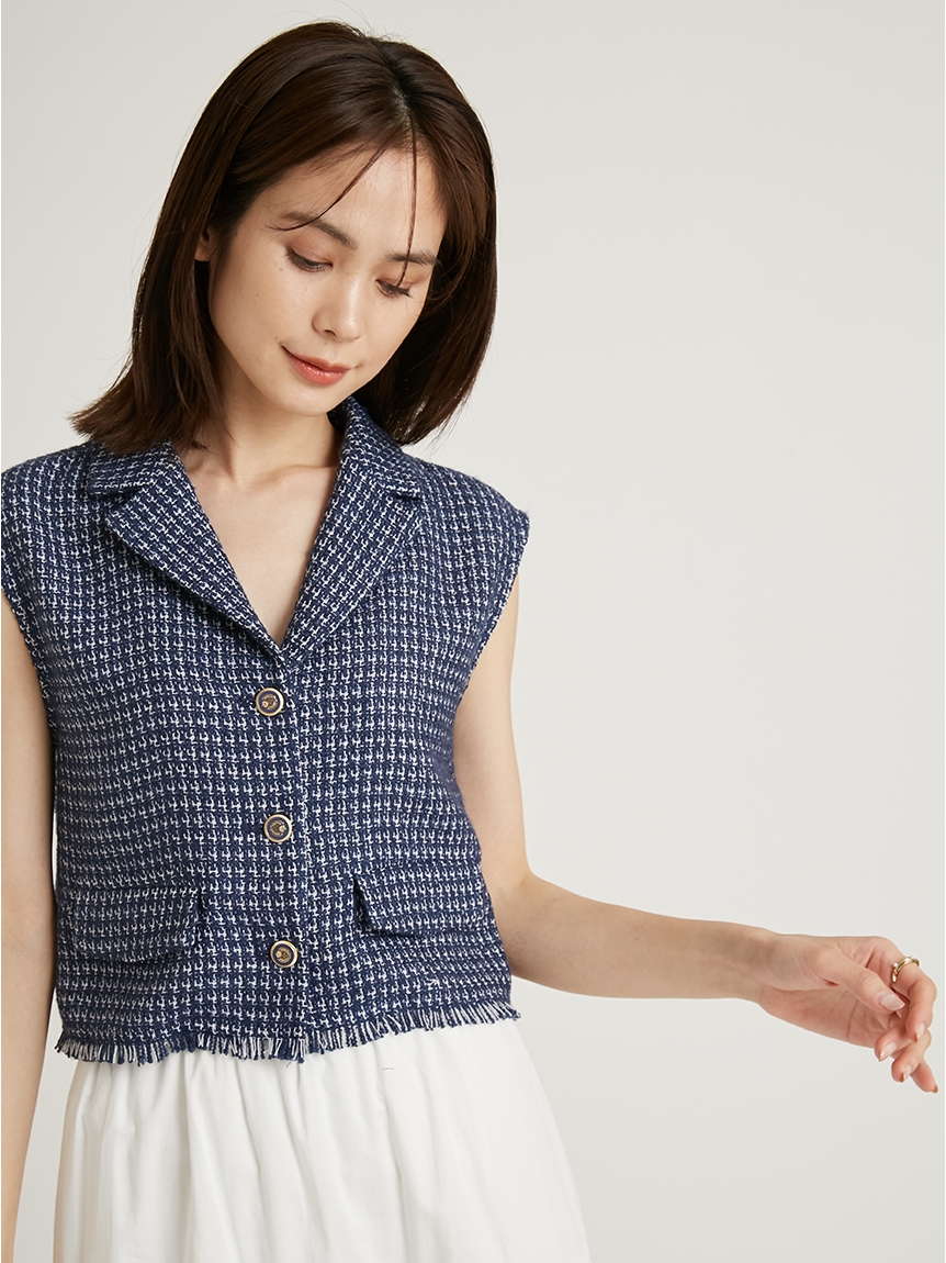 フロントボタンやフラップなど、ヴィンテージムード溢れるディテールでトレンド感たっぷりに仕上げたツイードベストトップス。すっきりとしたコンパクトなシルエットが女性らしさを感じさせる秘訣。デニムやハイウエストパンツと相性が良く、同素材を用いたスカート(SWFS222103)とセットアップでスタイリングするのもおすすめです。