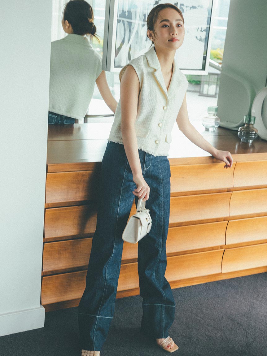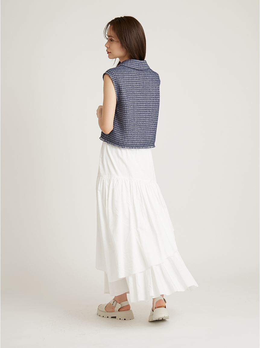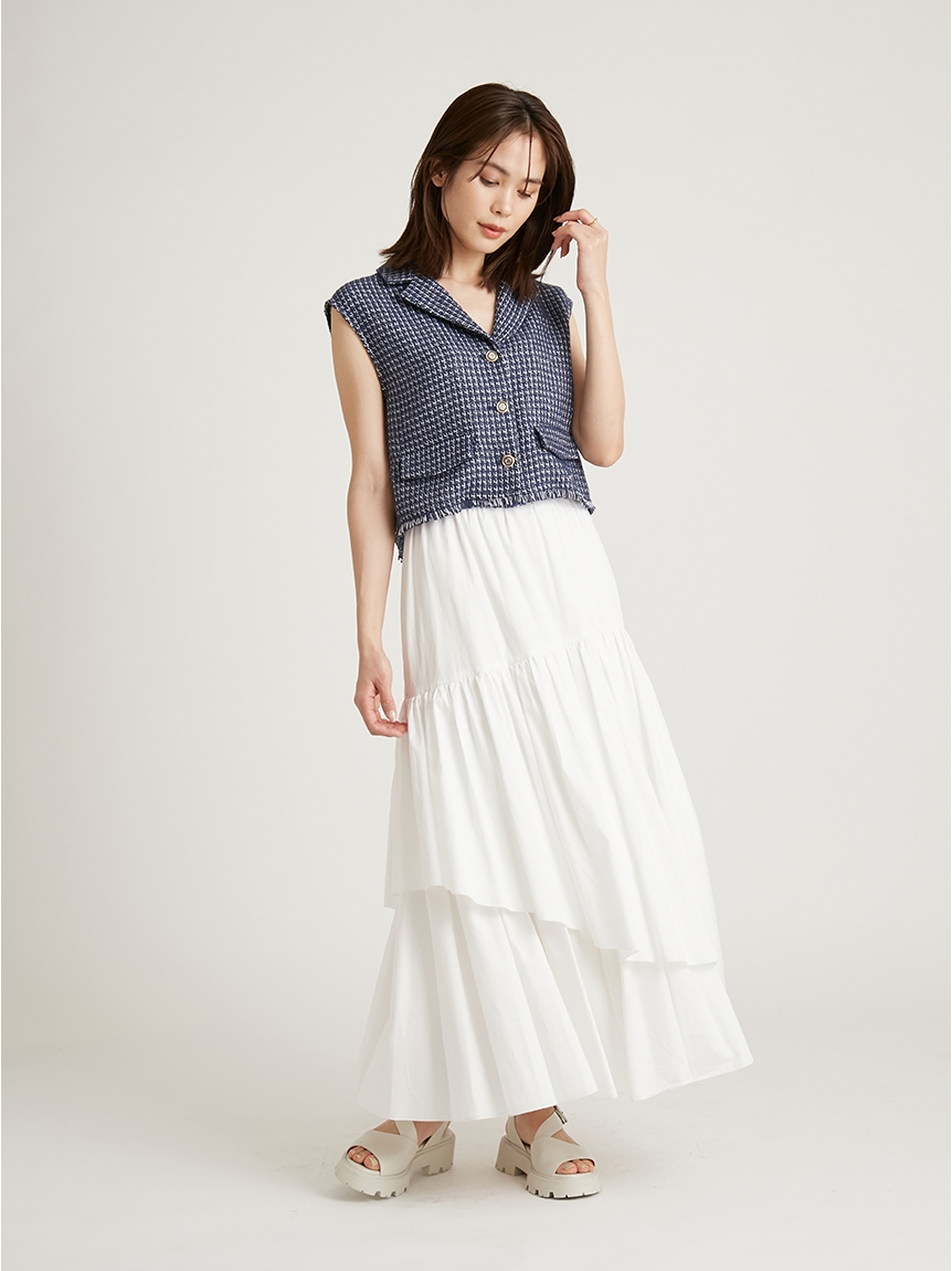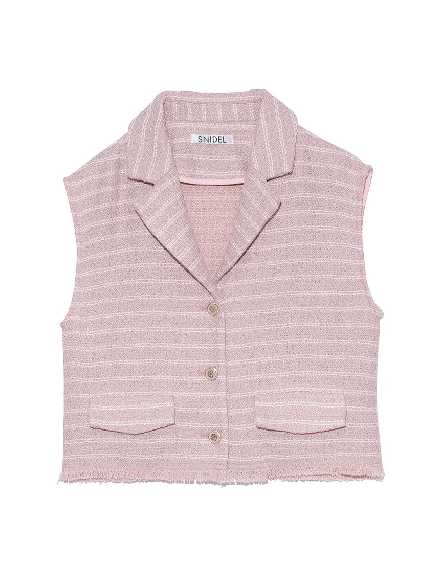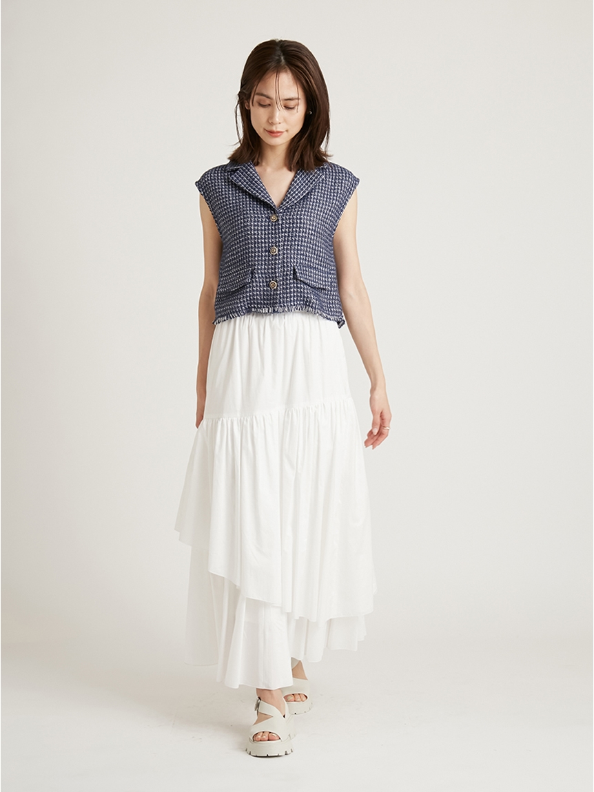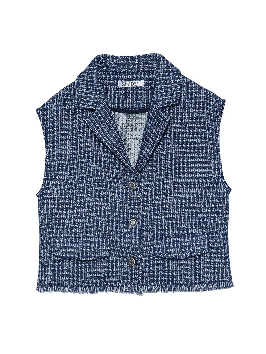 フロントボタンやフラップなど、ヴィンテージムード溢れるディテールでトレンド感たっぷりに仕上げたツイードベストトップス。すっきりとしたコンパクトなシルエットが女性らしさを感じさせる秘訣。デニムやハイウエストパンツと相性が良く、同素材を用いたスカート(SWFS222103)とセットアップでスタイリングするのもおすすめです。