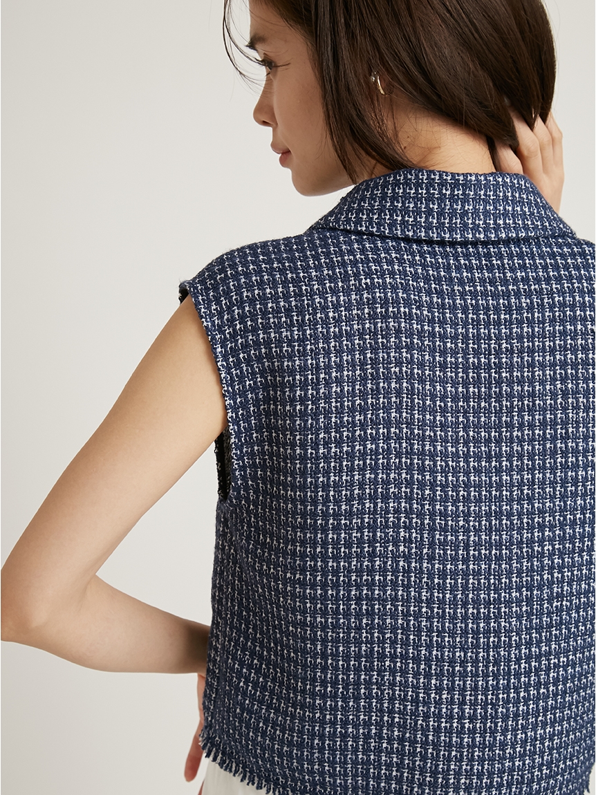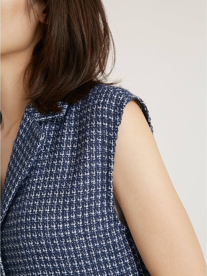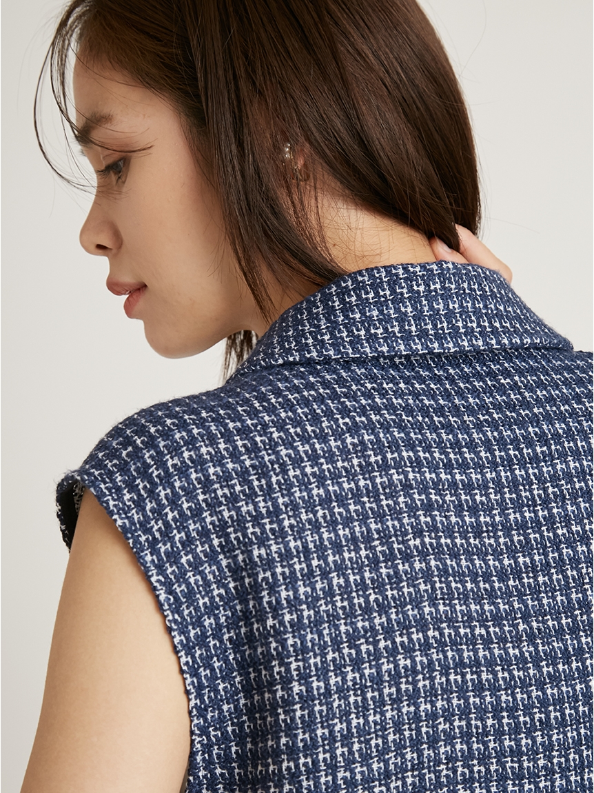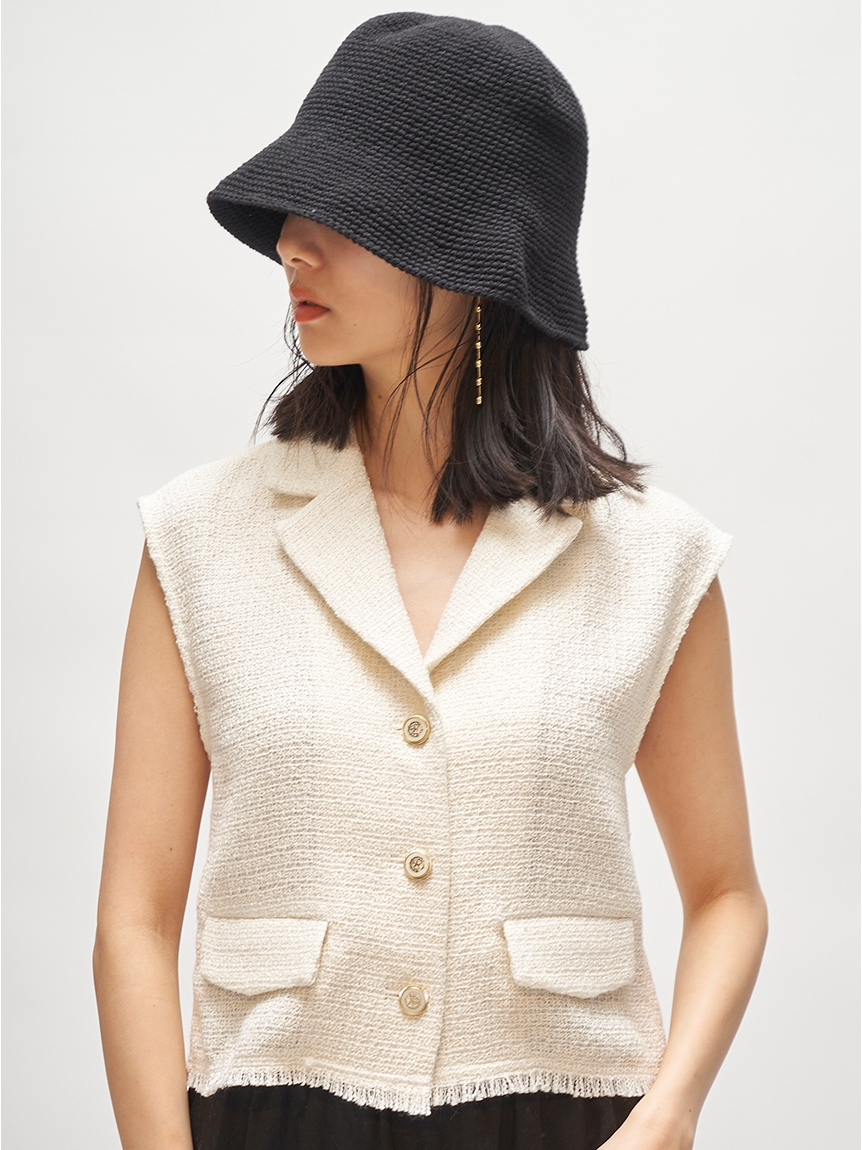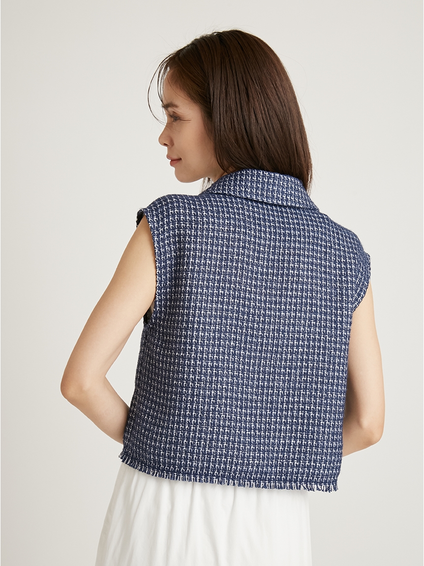 フロントボタンやフラップなど、ヴィンテージムード溢れるディテールでトレンド感たっぷりに仕上げたツイードベストトップス。すっきりとしたコンパクトなシルエットが女性らしさを感じさせる秘訣。デニムやハイウエストパンツと相性が良く、同素材を用いたスカート(SWFS222103)とセットアップでスタイリングするのもおすすめです。