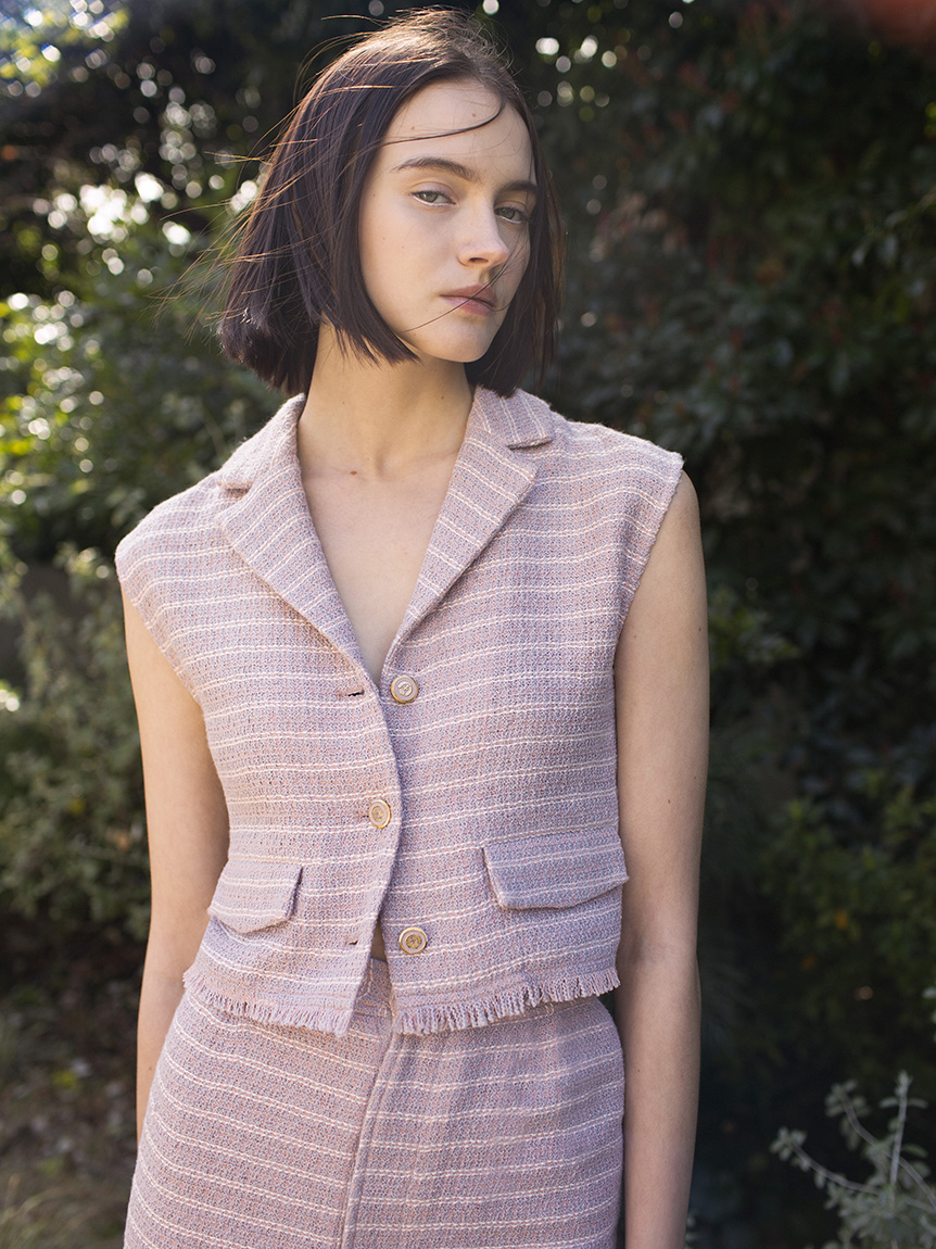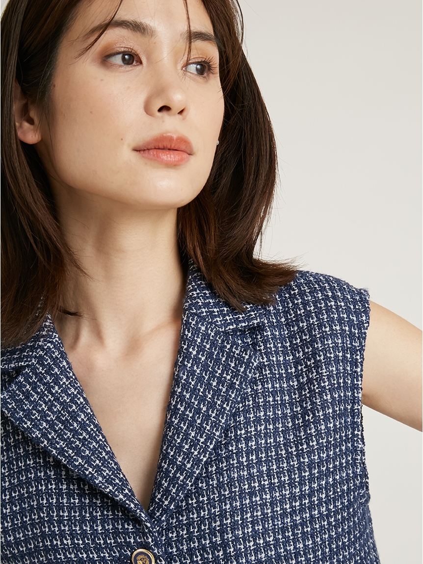 夏でもさらりと着こなせるライトなツイード素材を使用。定番のアイボリー、華やかなピンク、そして上品なネイビーの3色展開です。