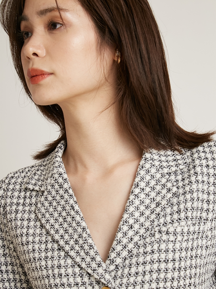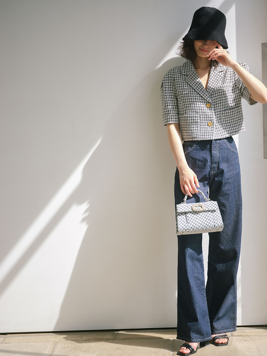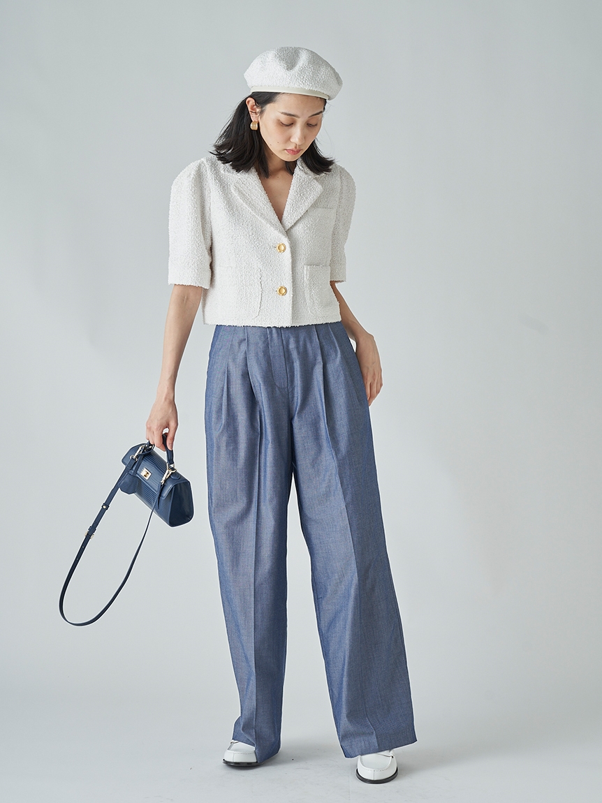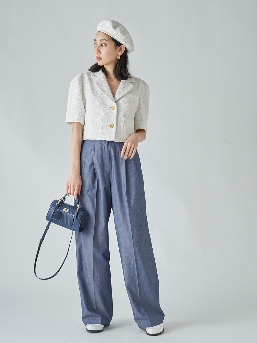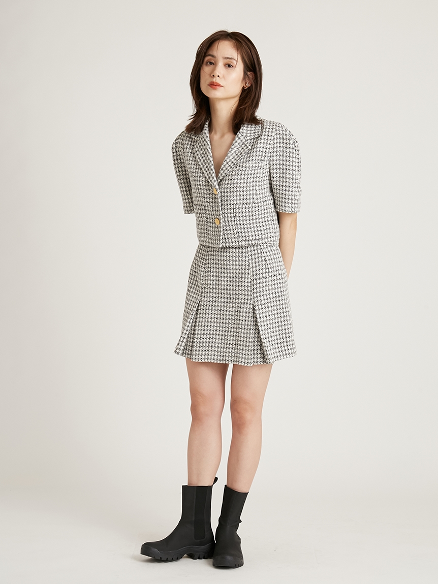 表面感のあるツイード素材を用いたホワイト、ライトな布帛のベージュ、千鳥柄ツイードを使用したミックスの豊富なバリエーション展開でお届けします。