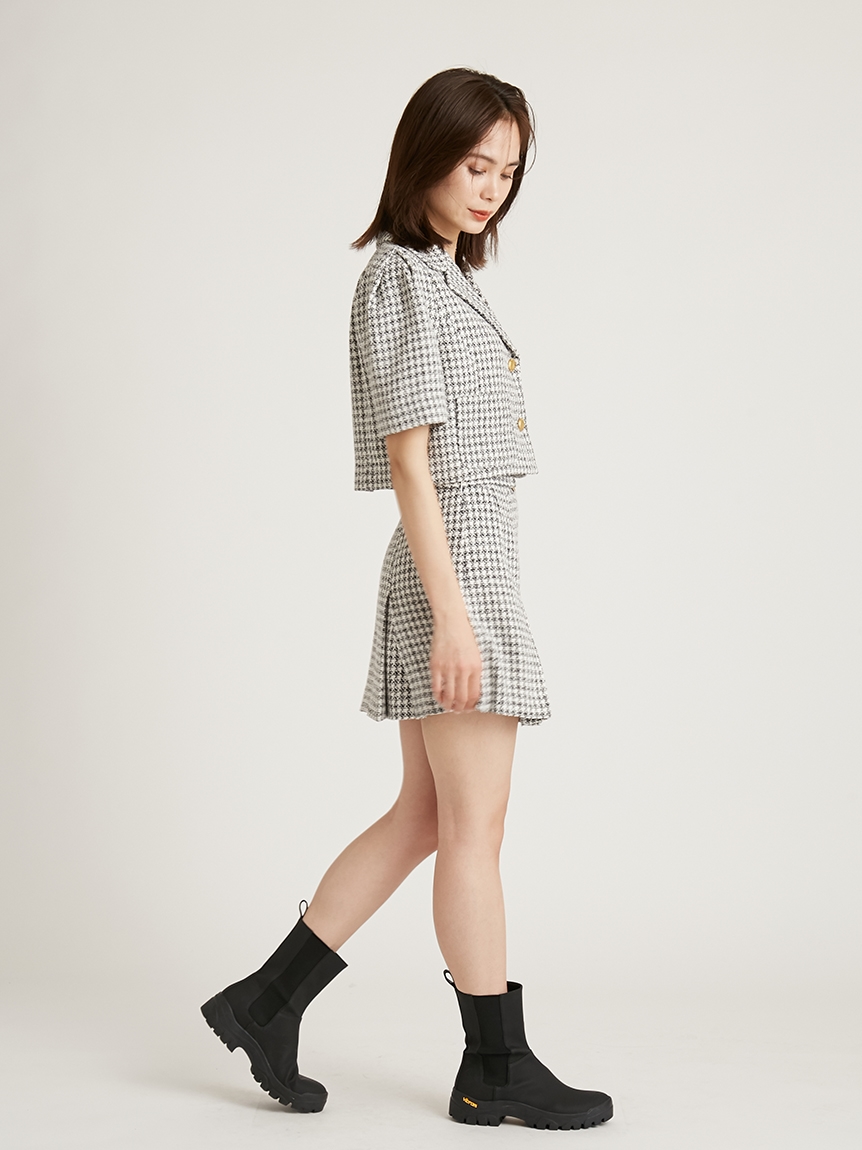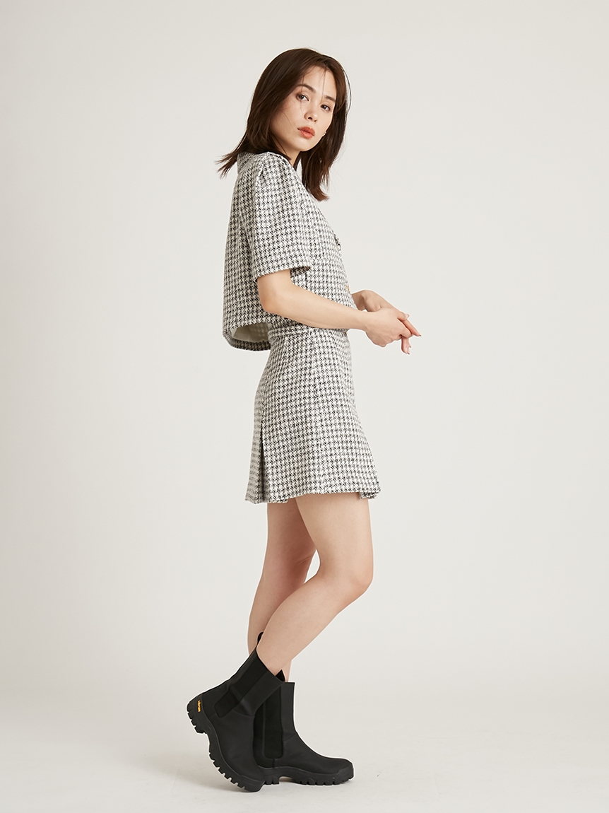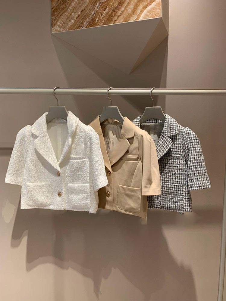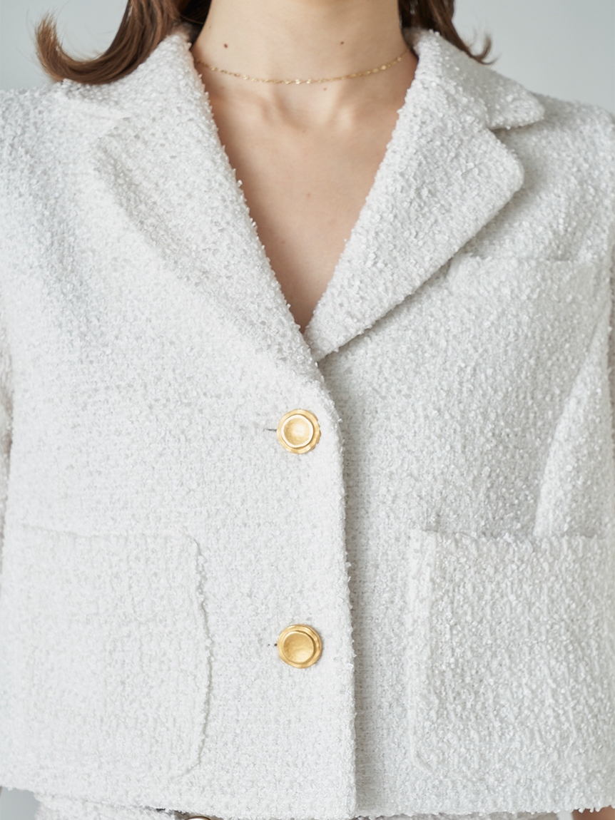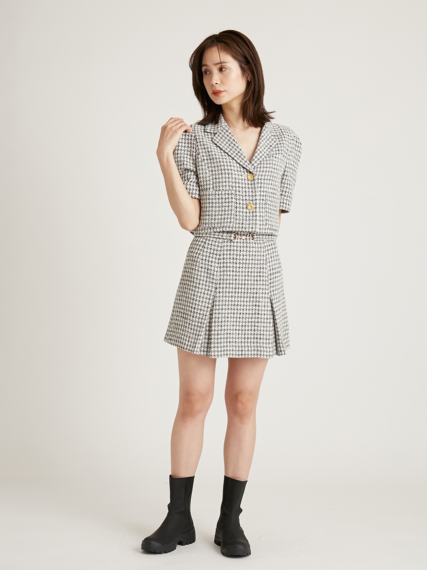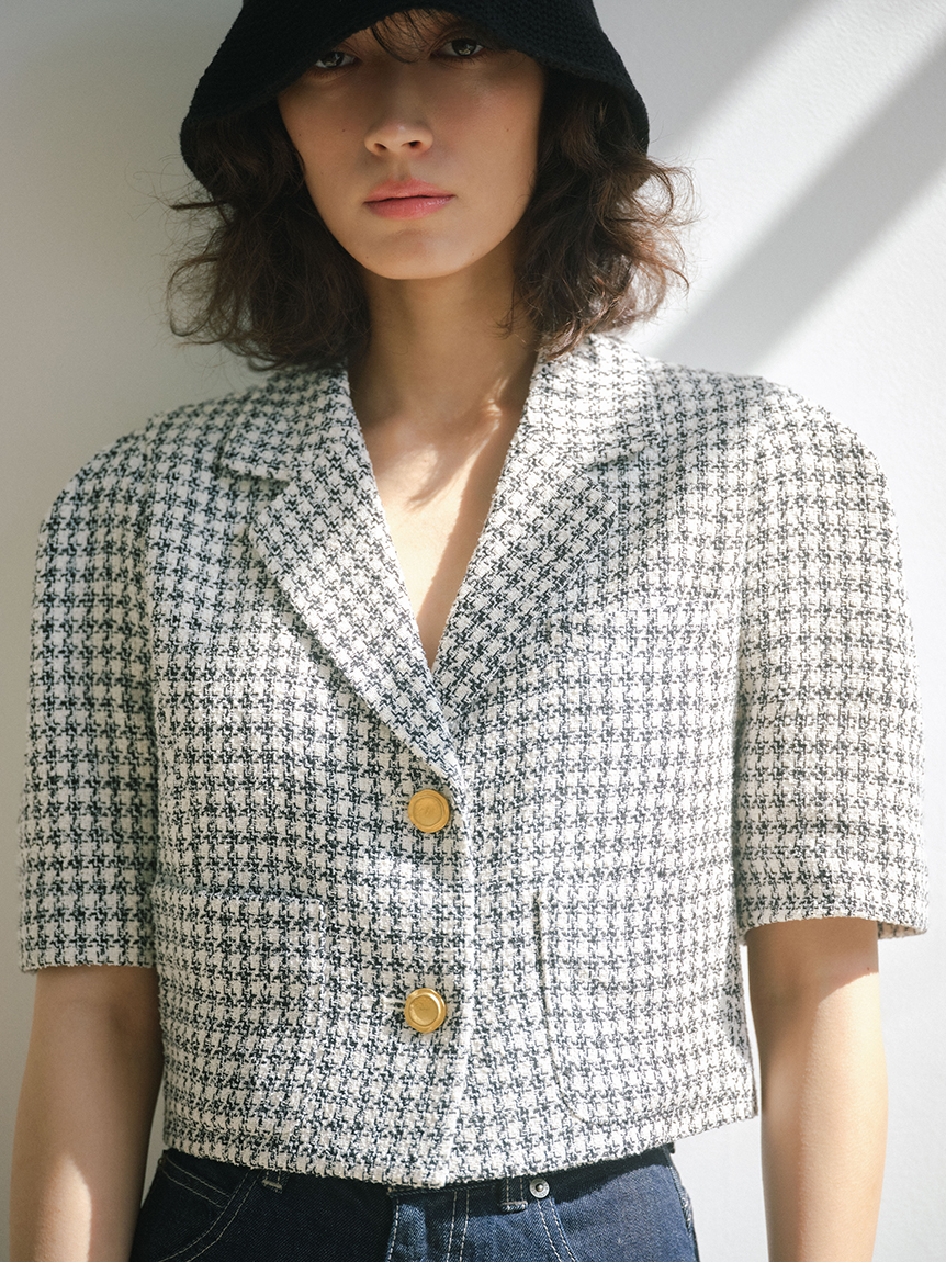 表面感のあるツイード素材を用いたホワイト、ライトな布帛のベージュ、千鳥柄ツイードを使用したミックスの豊富なバリエーション展開でお届けします。
