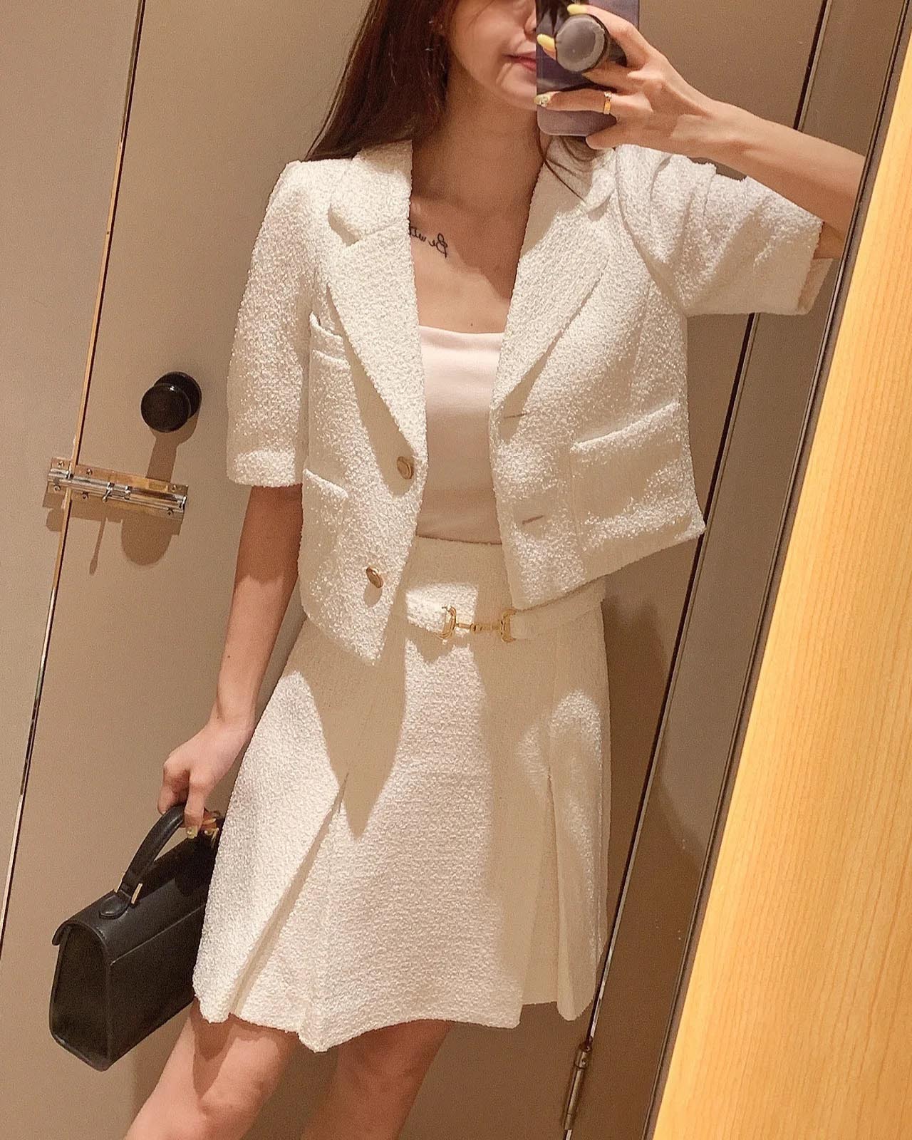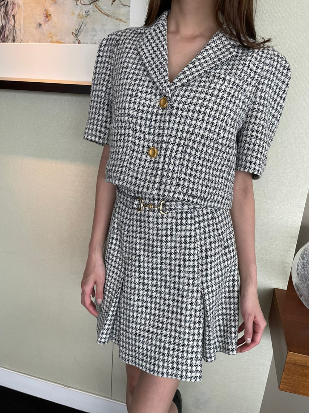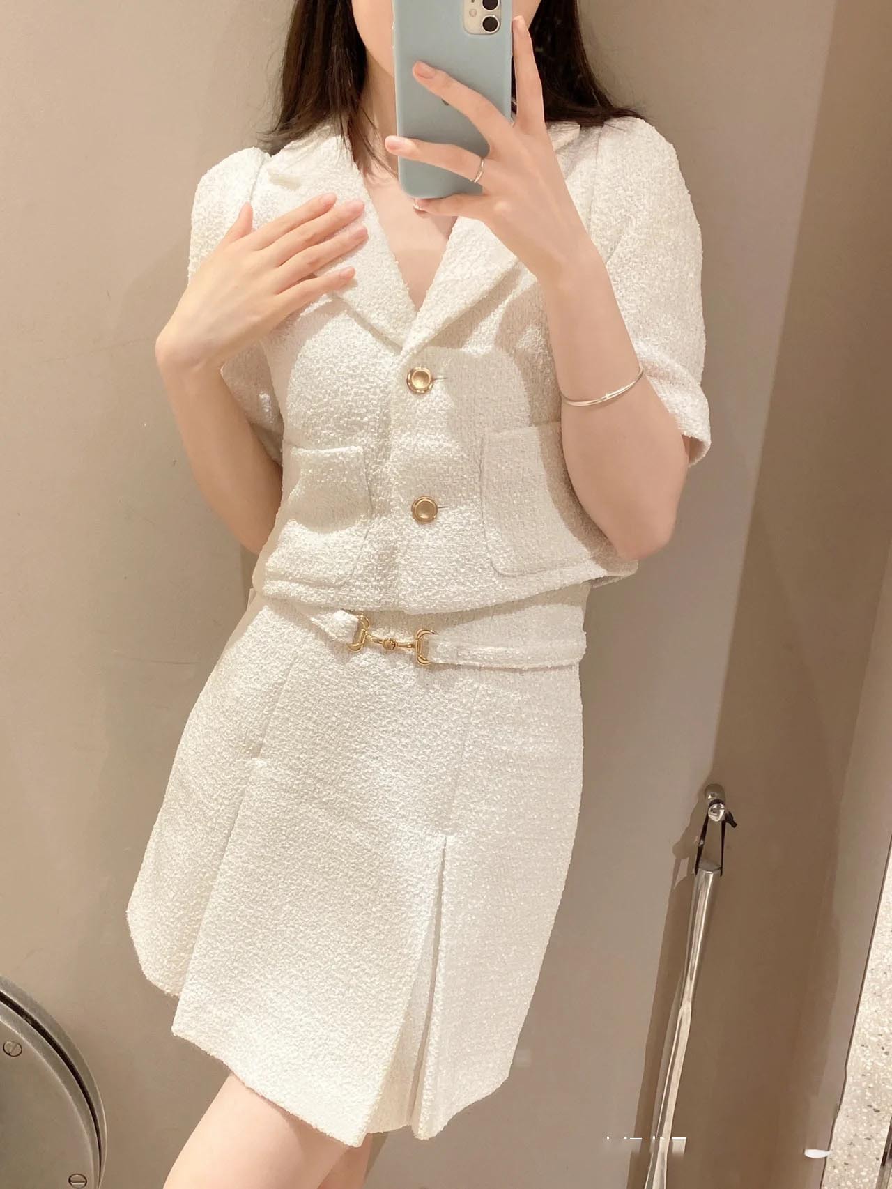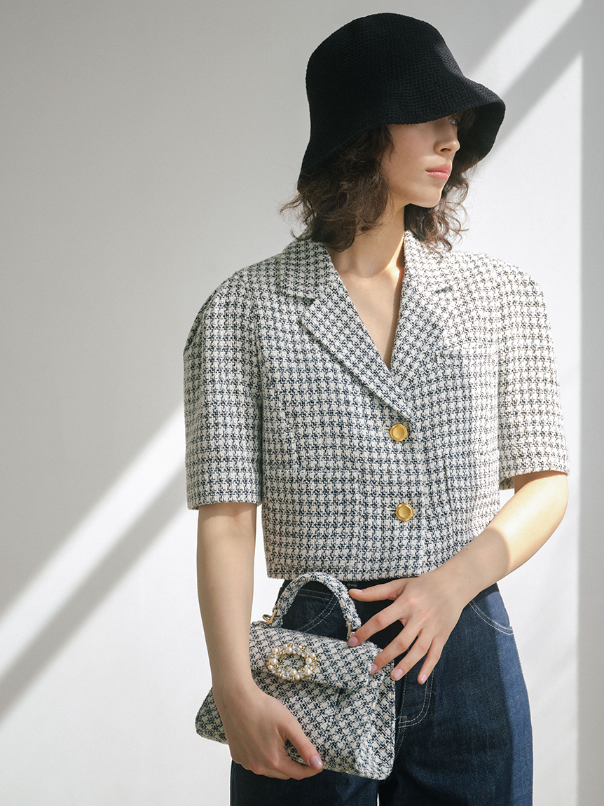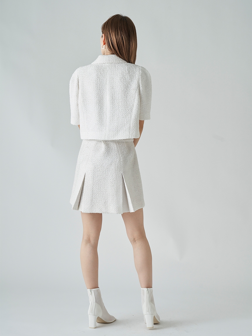 表面感のあるツイード素材を用いたホワイト、ライトな布帛のベージュ、千鳥柄ツイードを使用したミックスの豊富なバリエーション展開でお届けします。