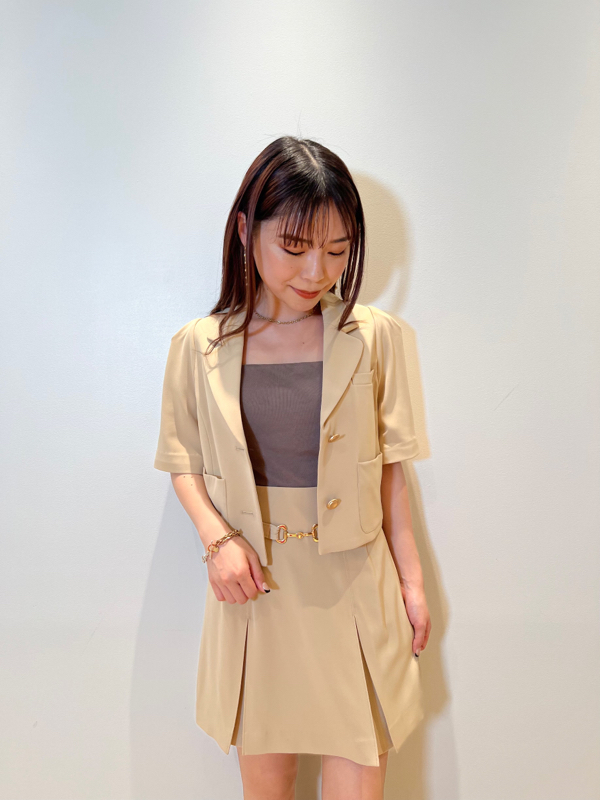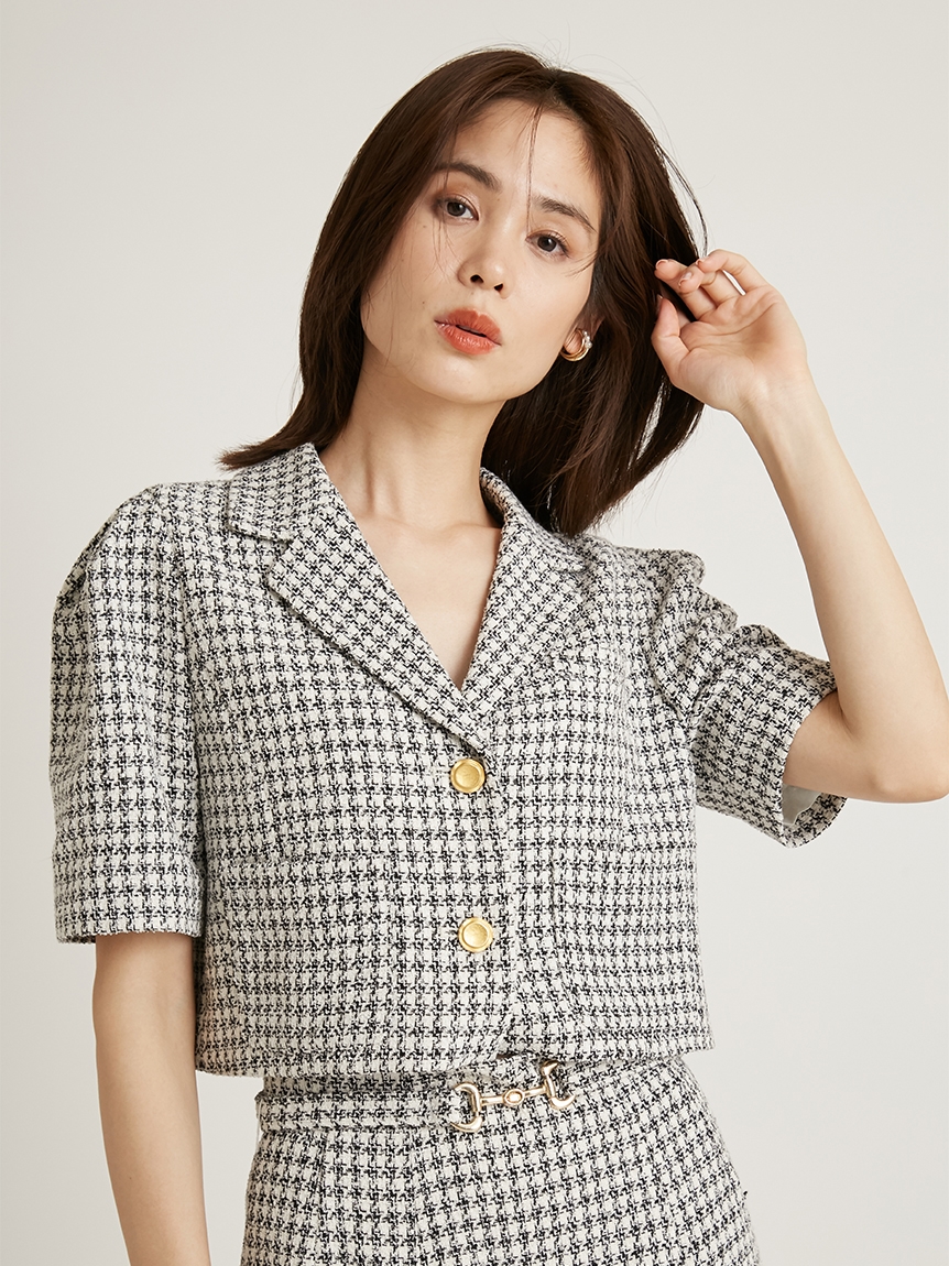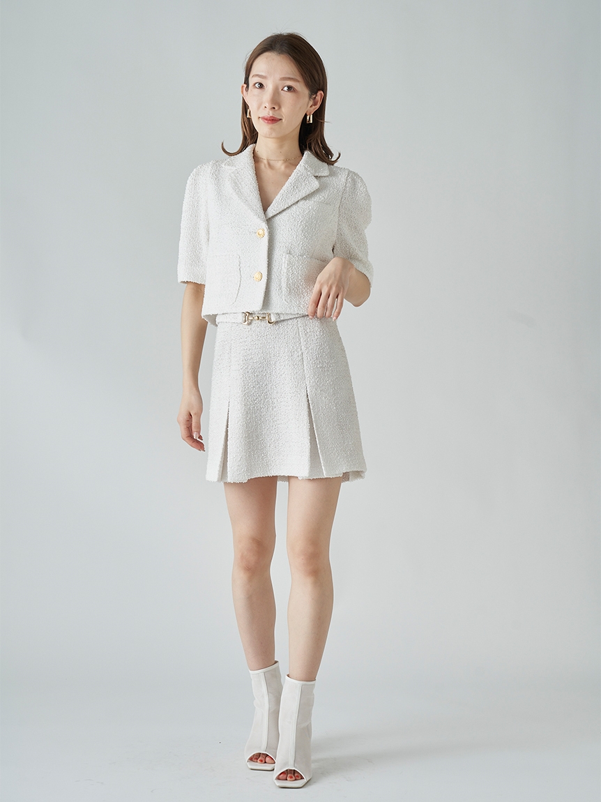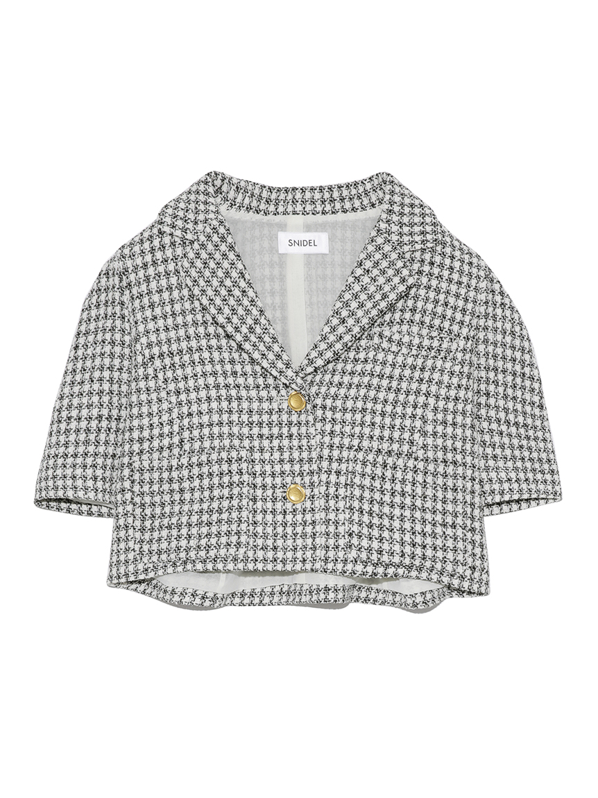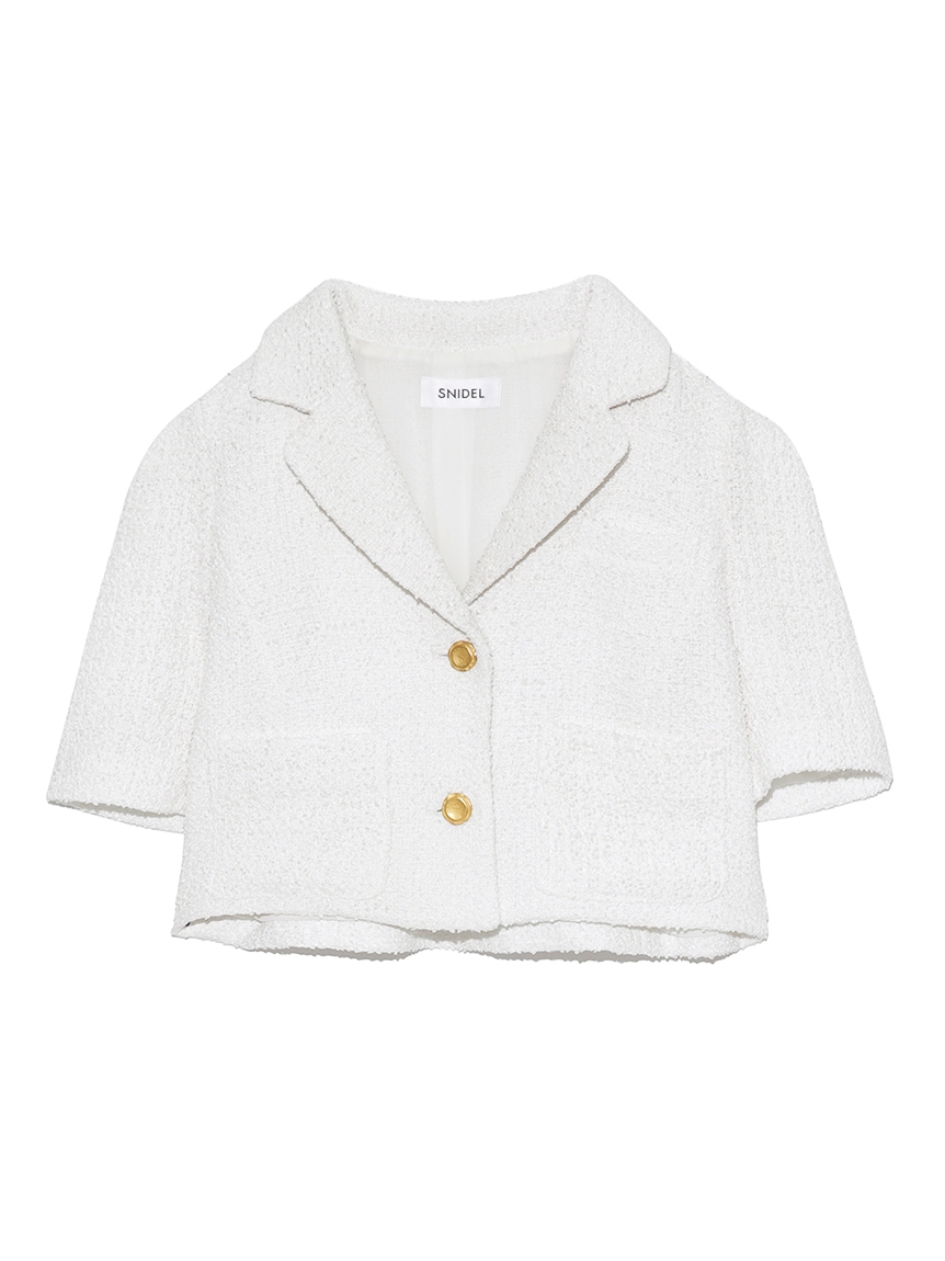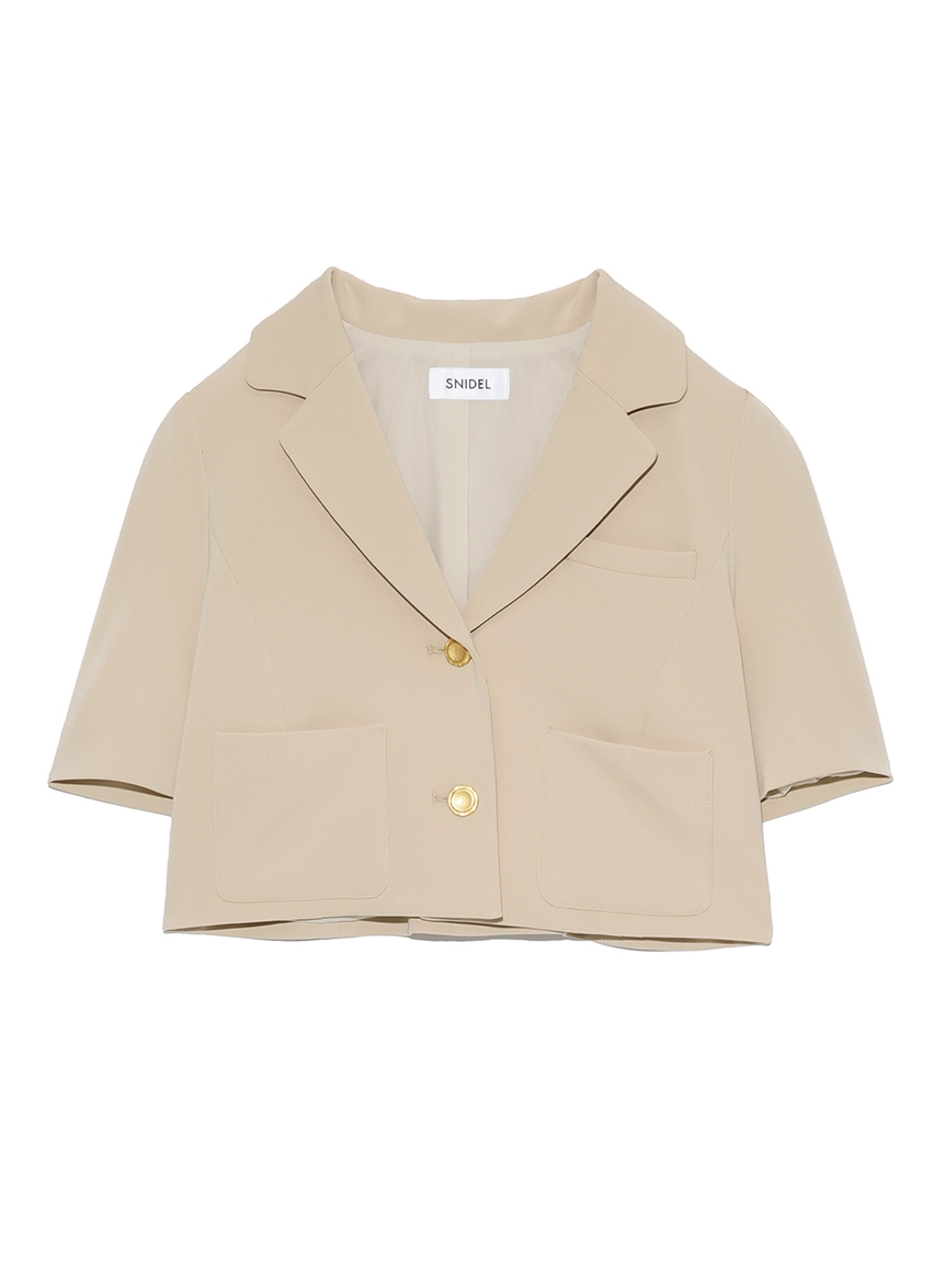 プラスワンでトレンド感がぐっと高まる、今季注目のハーフスリーブジャケット。タックを効かせ立体感を与えたスリーブ&コンパクトな身頃で女性らしく仕上げました。マットな光沢を放つフロントのボタンが上品なアクセントに。レングスをジャストに仕立てているので様々なボトムと相性が良く、同素材のスカート(SWFS222100)とセットアップでスタイリングするのもおすすめです。