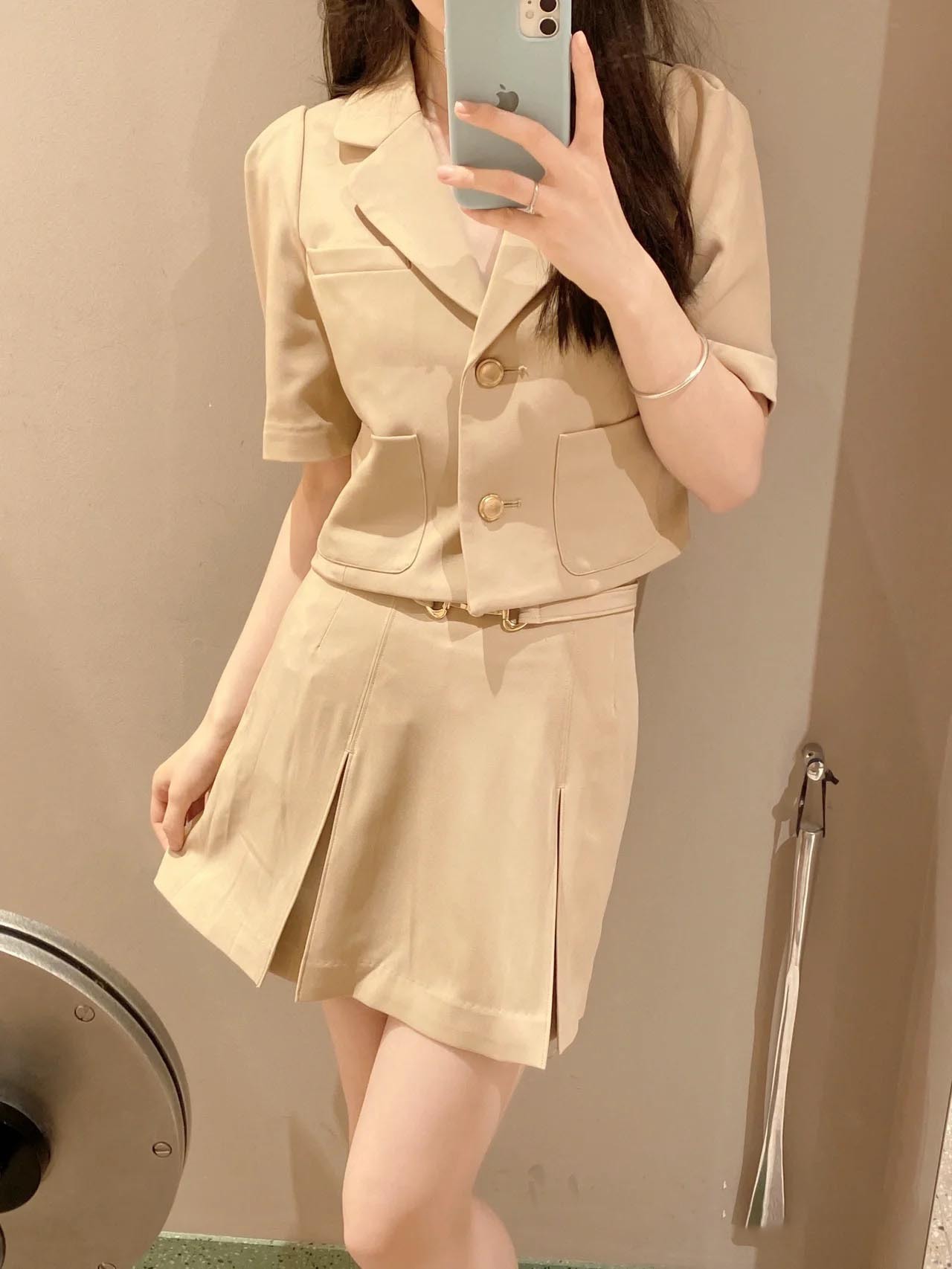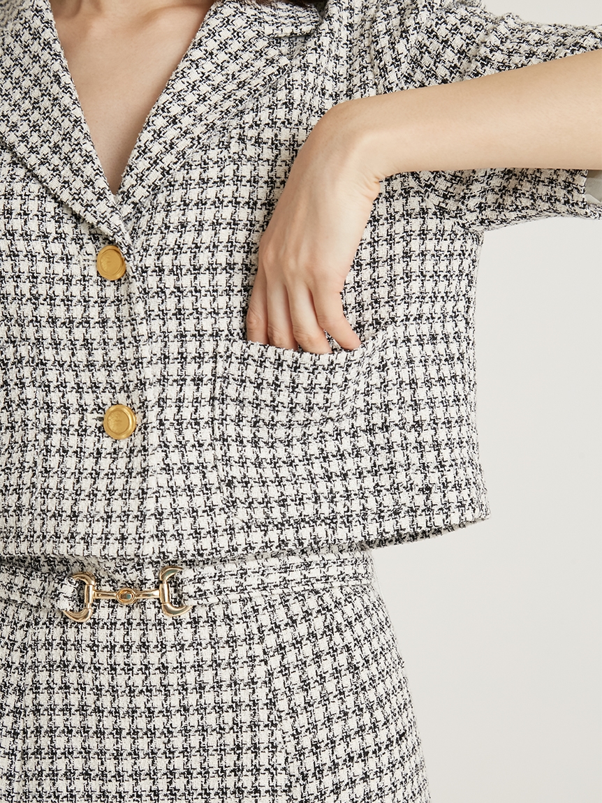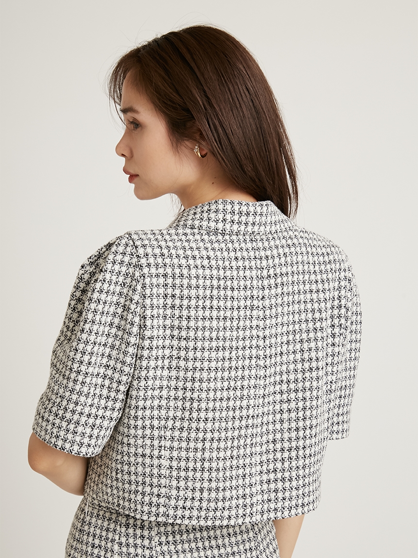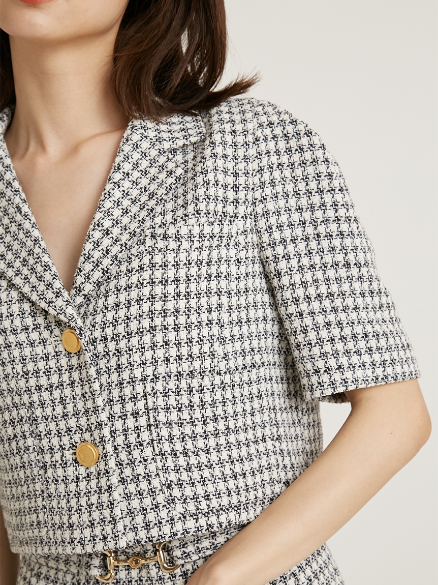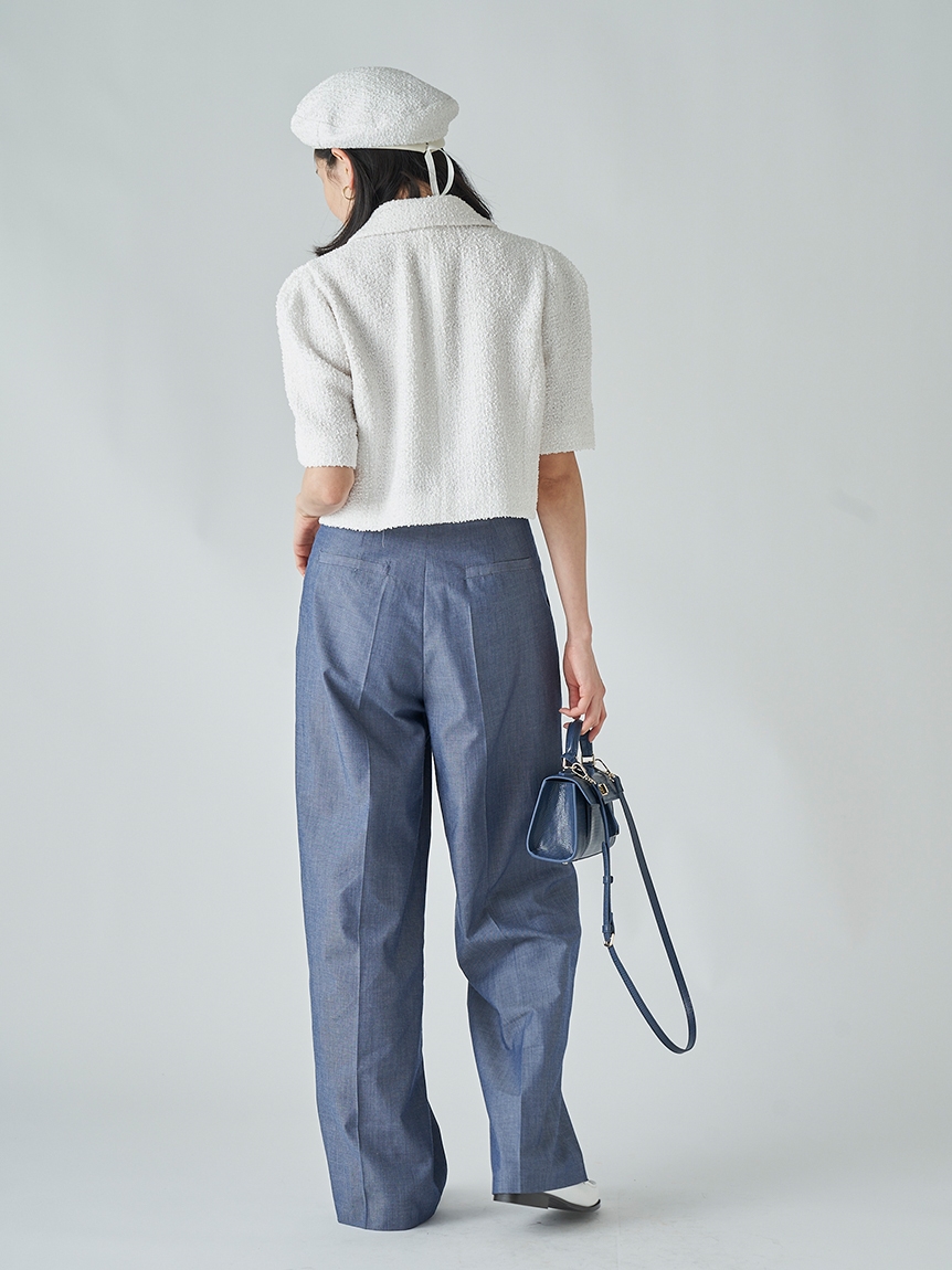 プラスワンでトレンド感がぐっと高まる、今季注目のハーフスリーブジャケット。タックを効かせ立体感を与えたスリーブ&コンパクトな身頃で女性らしく仕上げました。マットな光沢を放つフロントのボタンが上品なアクセントに。レングスをジャストに仕立てているので様々なボトムと相性が良く、同素材のスカート(SWFS222100)とセットアップでスタイリングするのもおすすめです。