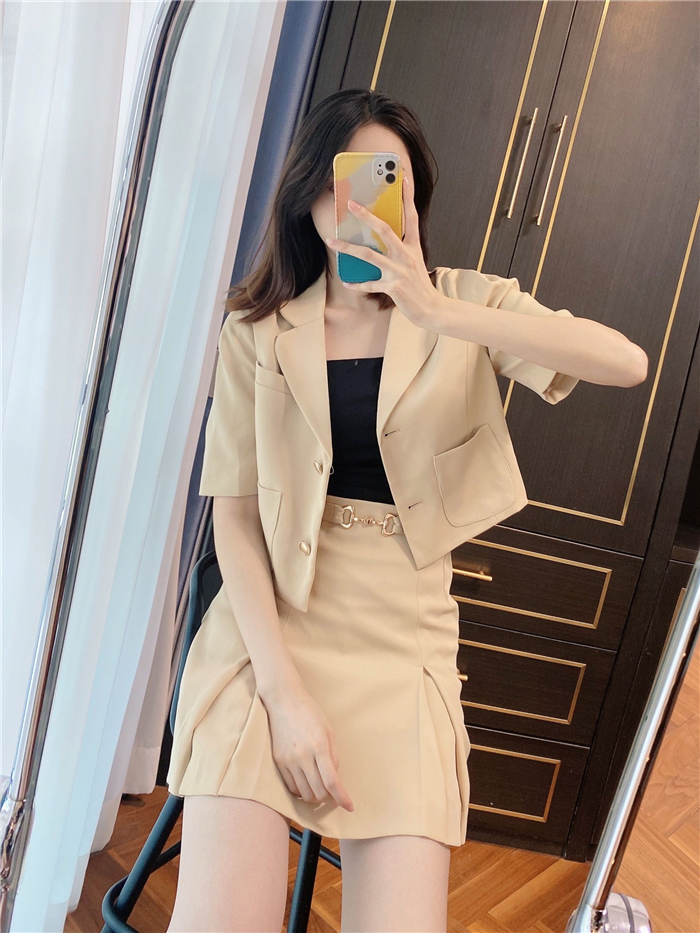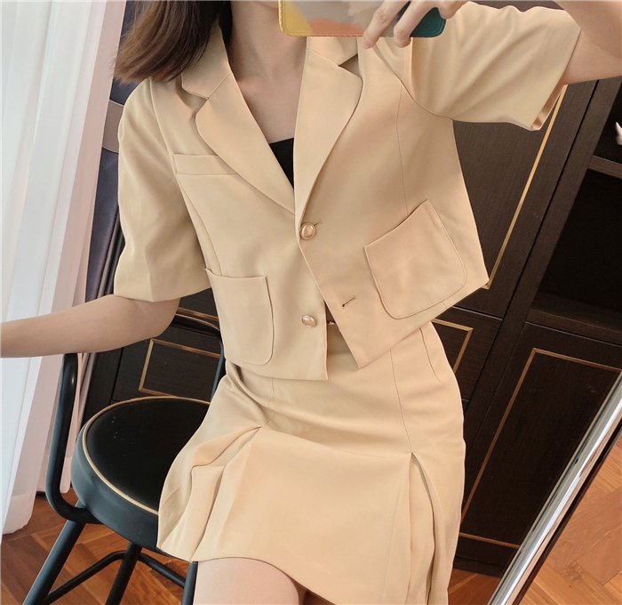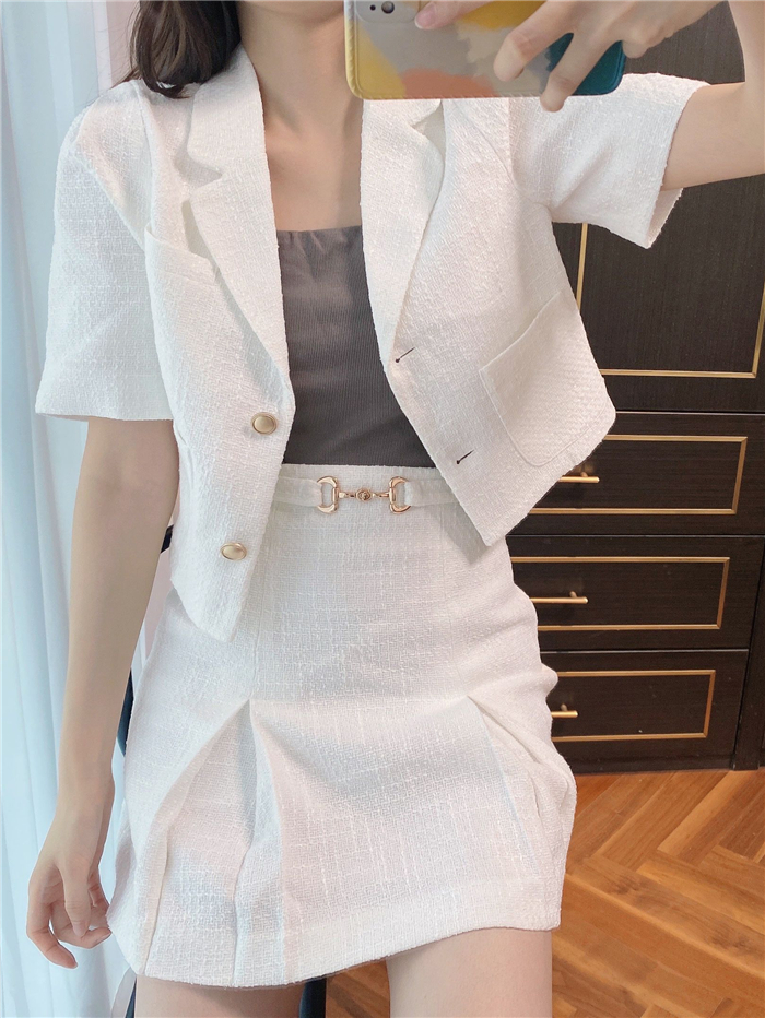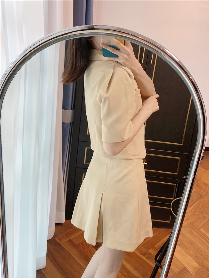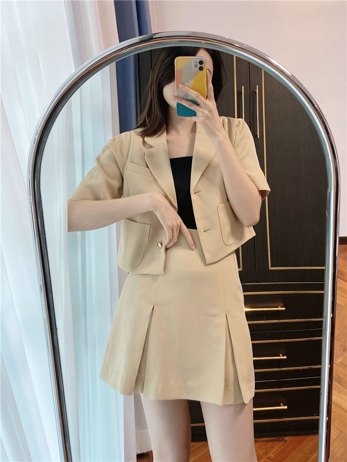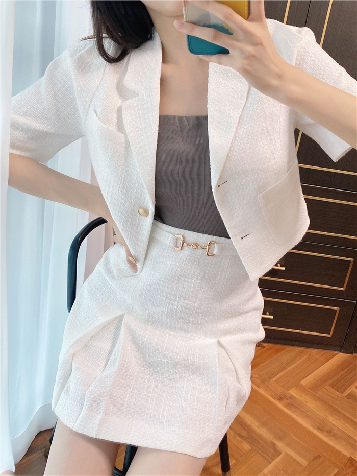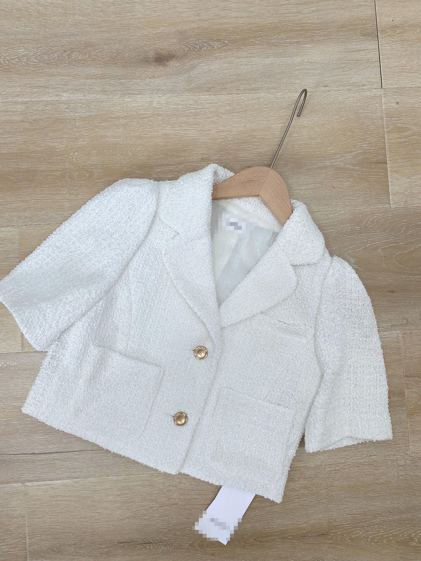 プラスワンでトレンド感がぐっと高まる、今季注目のハーフスリーブジャケット。タックを効かせ立体感を与えたスリーブ&コンパクトな身頃で女性らしく仕上げました。マットな光沢を放つフロントのボタンが上品なアクセントに。レングスをジャストに仕立てているので様々なボトムと相性が良く、同素材のスカート(SWFS222100)とセットアップでスタイリングするのもおすすめです。