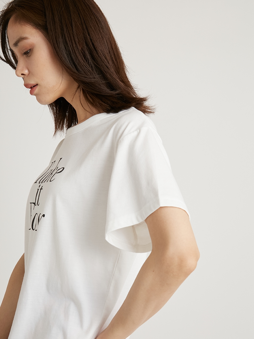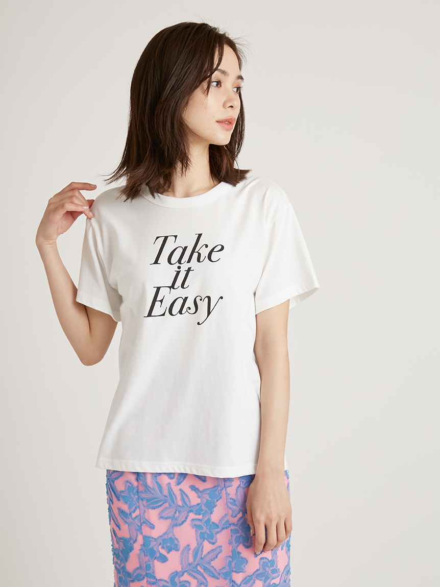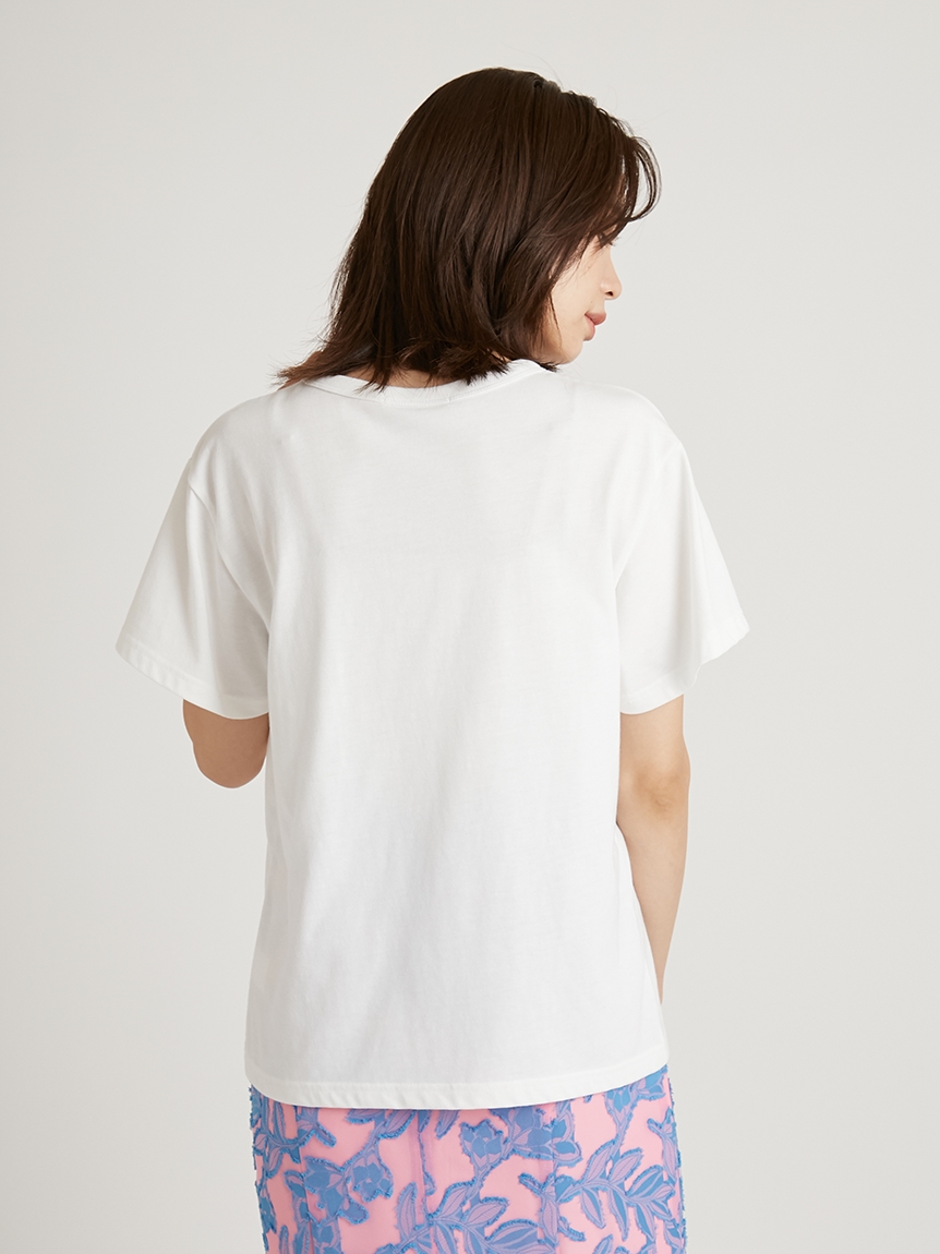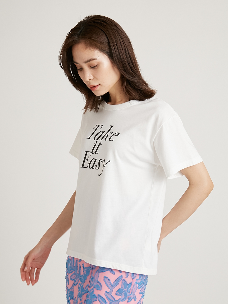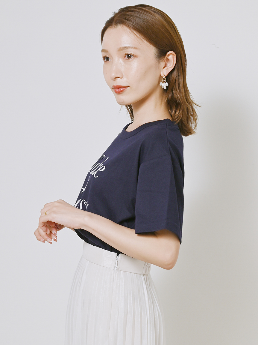 女性らしい書体で描かれた大きめのロゴプリントが印象的な定番Tシャツ。ドロップショルダーながらゆったりし過ぎず、タイト過ぎない絶妙なシルエットにこだわった1着です。裾はインでもアウトでもバランス良く決まるので様々なボトムと合わせやすく、幅広いコーディネートに活躍してくれます。