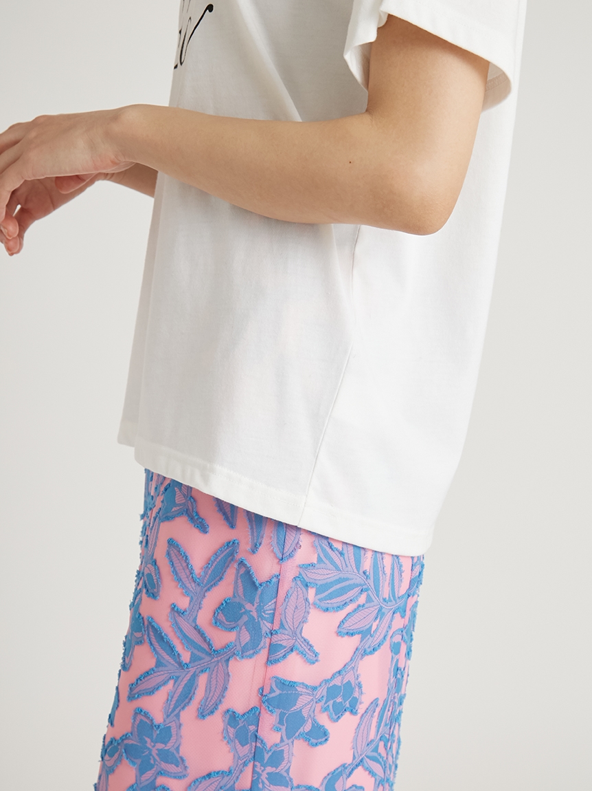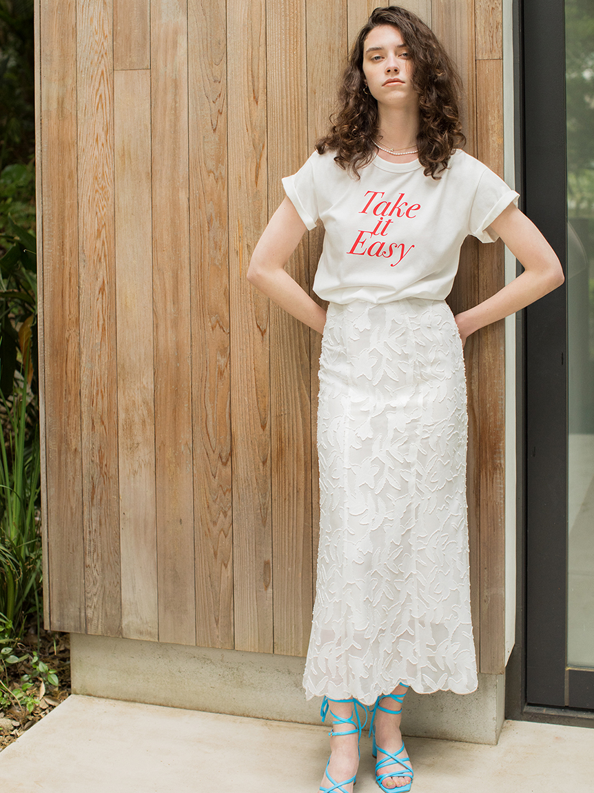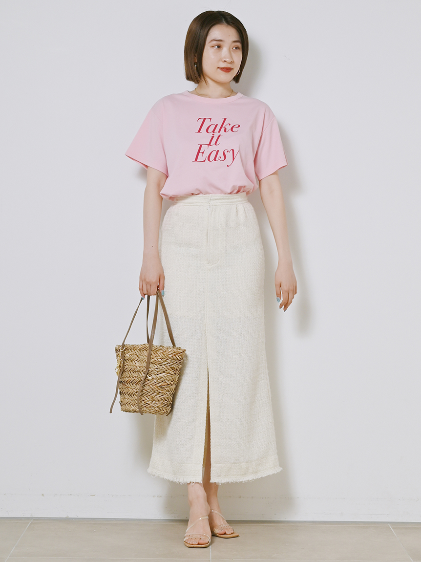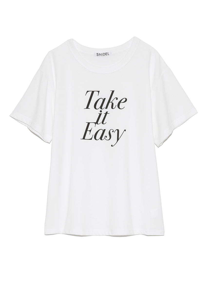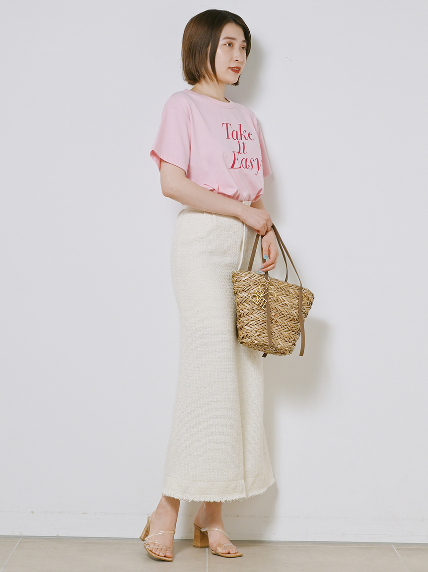 女性らしい書体で描かれた大きめのロゴプリントが印象的な定番Tシャツ。ドロップショルダーながらゆったりし過ぎず、タイト過ぎない絶妙なシルエットにこだわった1着です。裾はインでもアウトでもバランス良く決まるので様々なボトムと合わせやすく、幅広いコーディネートに活躍してくれます。