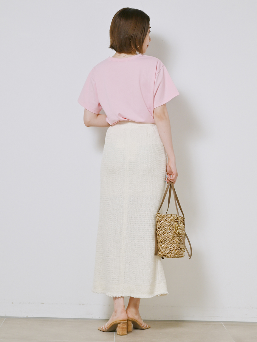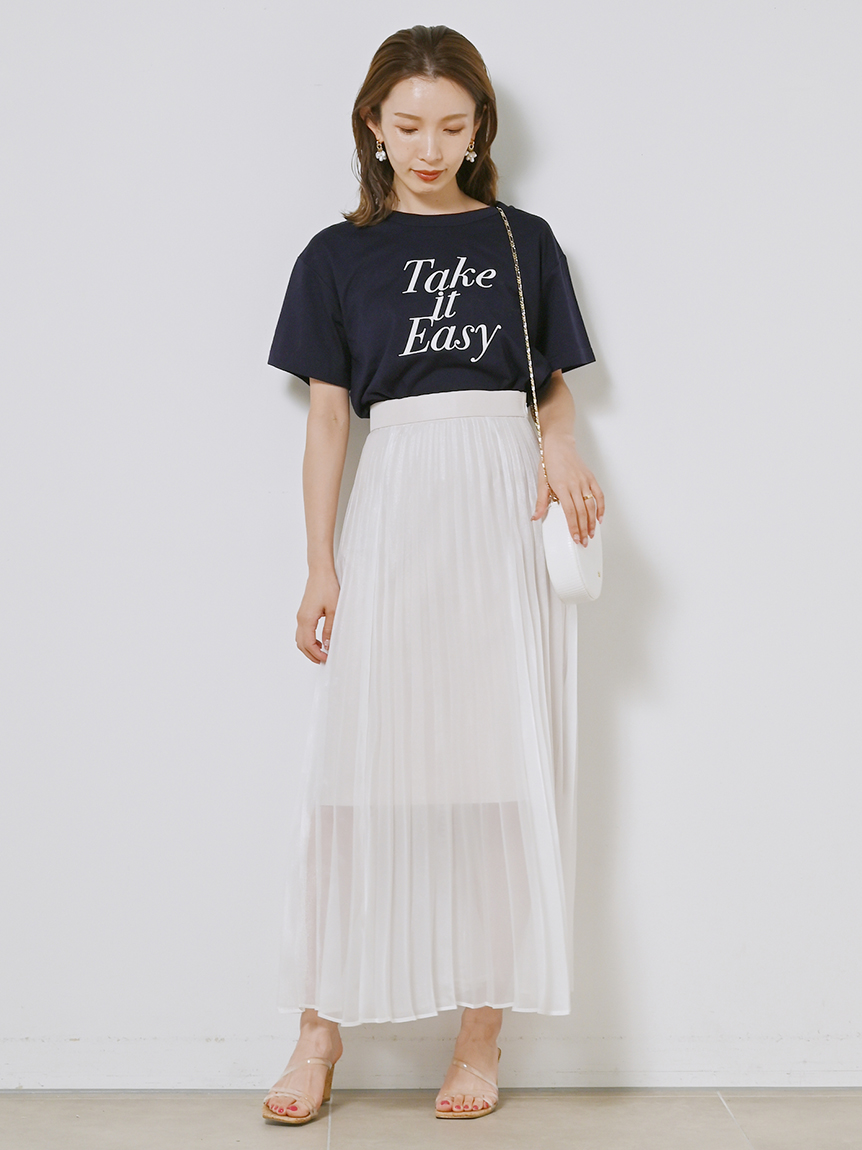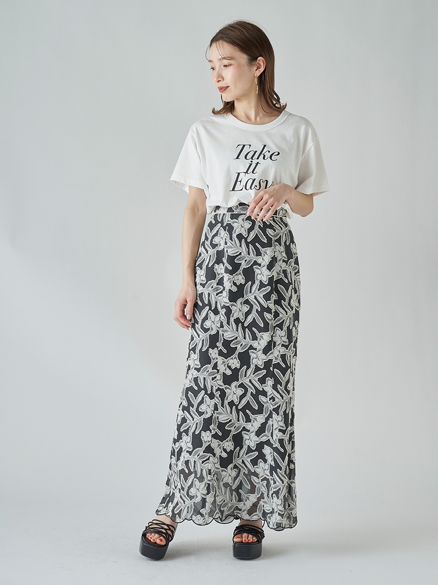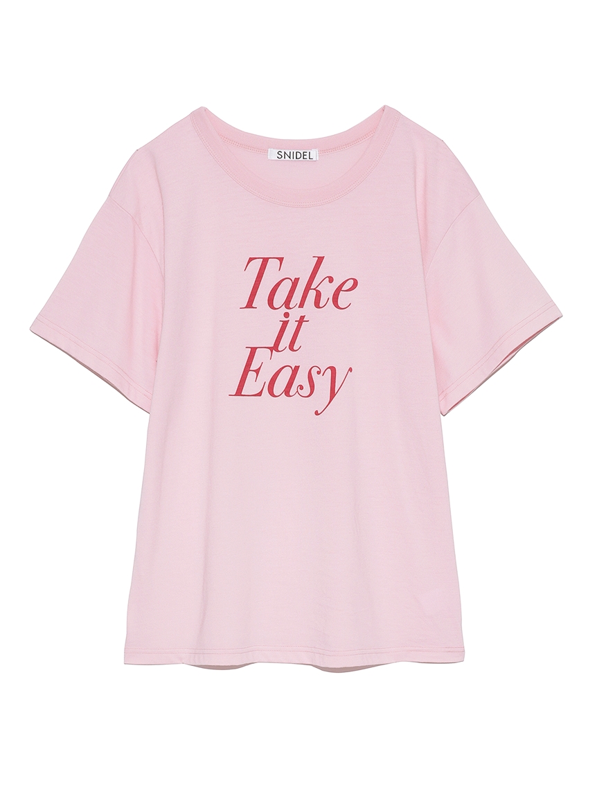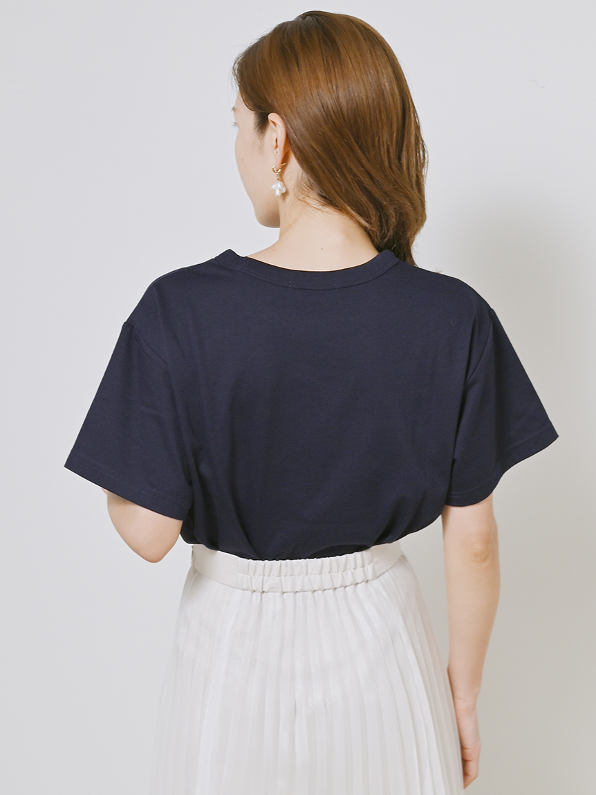 女性らしい書体で描かれた大きめのロゴプリントが印象的な定番Tシャツ。ドロップショルダーながらゆったりし過ぎず、タイト過ぎない絶妙なシルエットにこだわった1着です。裾はインでもアウトでもバランス良く決まるので様々なボトムと合わせやすく、幅広いコーディネートに活躍してくれます。