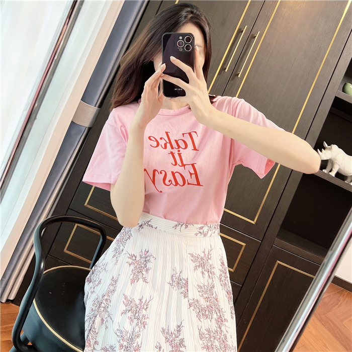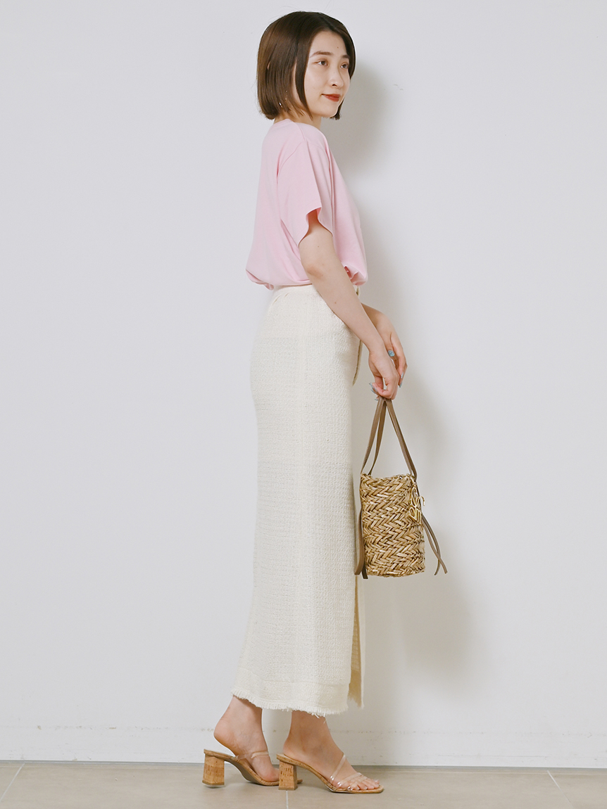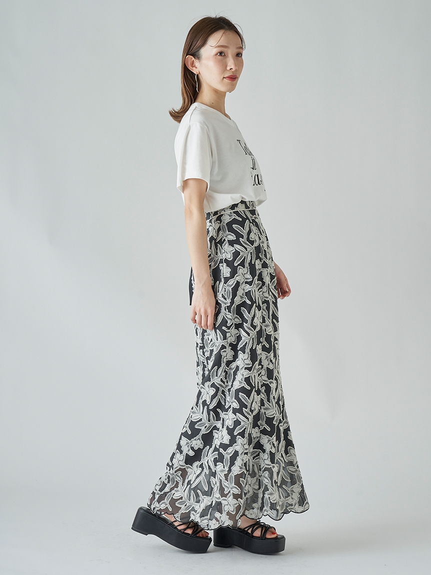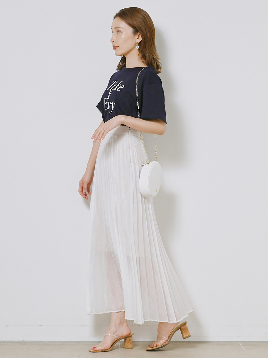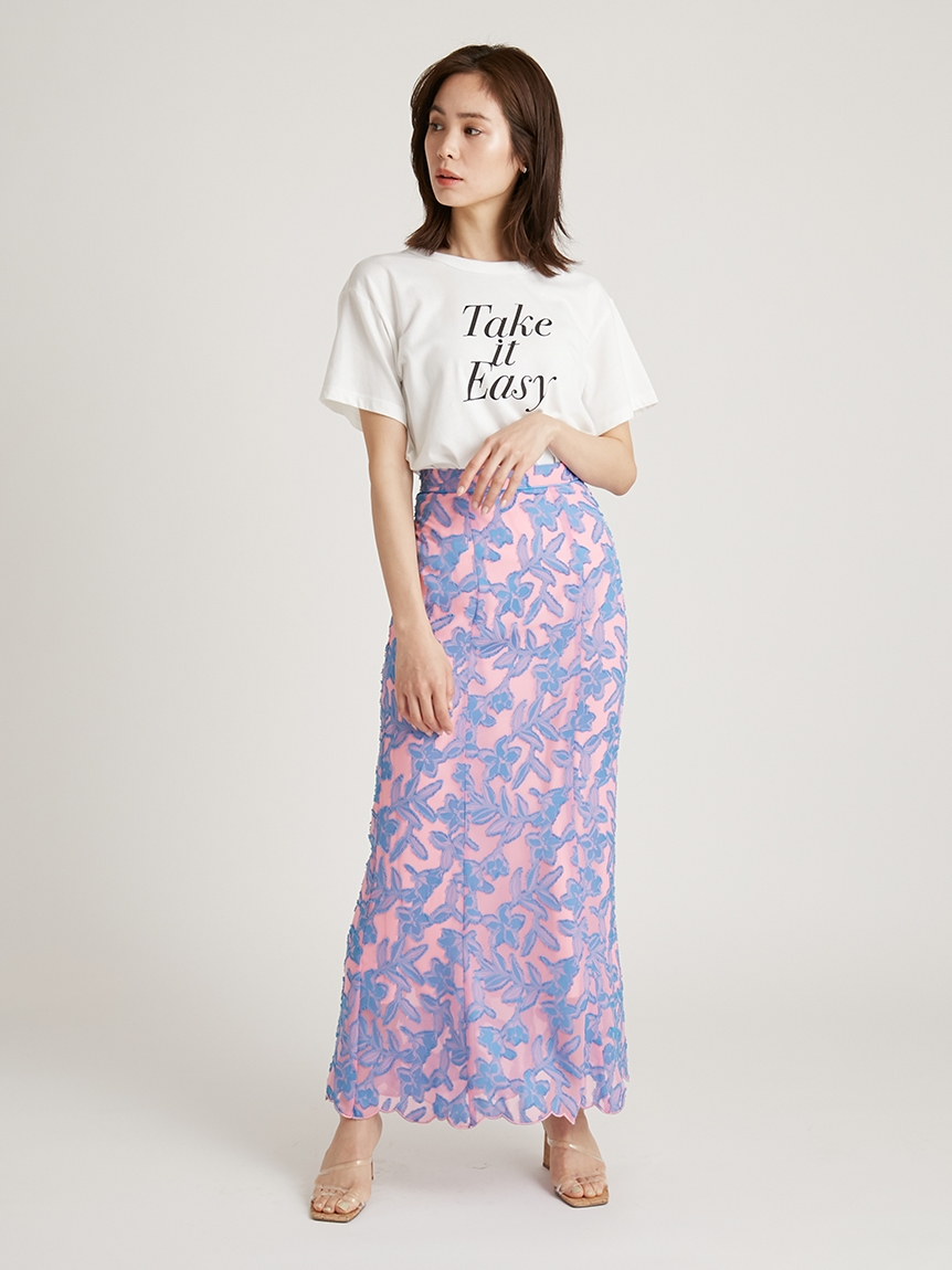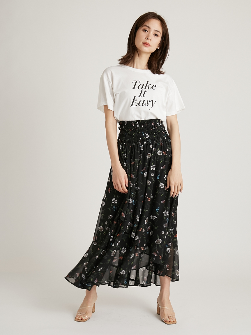 女性らしい書体で描かれた大きめのロゴプリントが印象的な定番Tシャツ。ドロップショルダーながらゆったりし過ぎず、タイト過ぎない絶妙なシルエットにこだわった1着です。裾はインでもアウトでもバランス良く決まるので様々なボトムと合わせやすく、幅広いコーディネートに活躍してくれます。