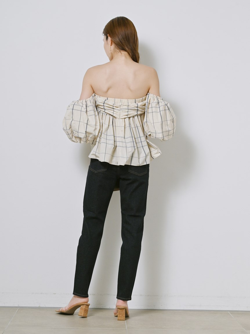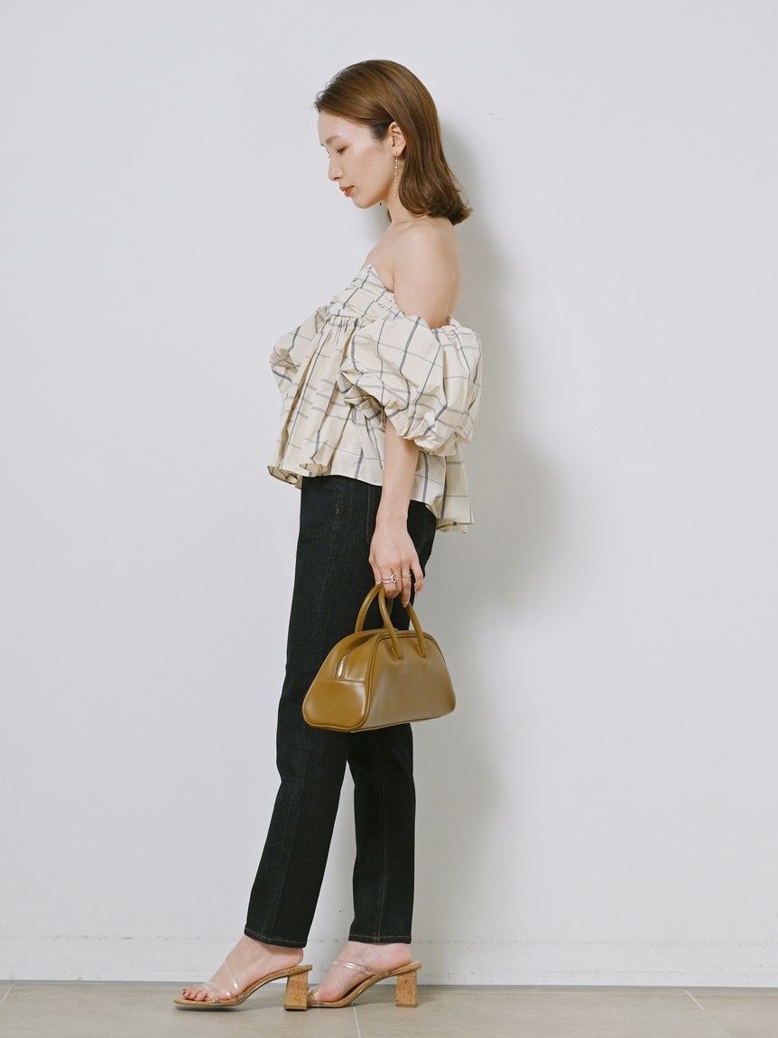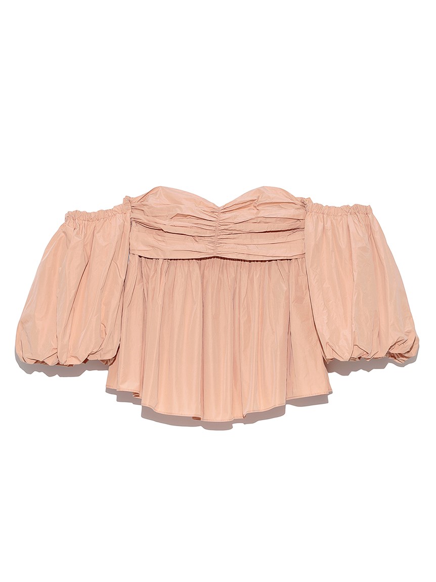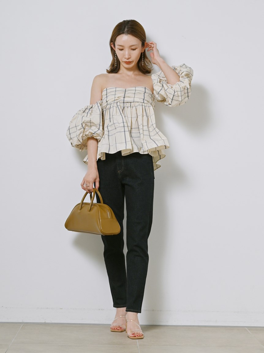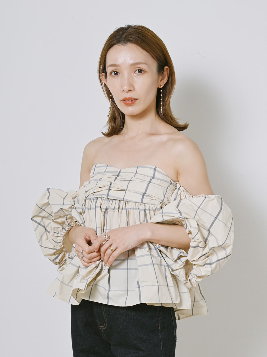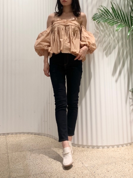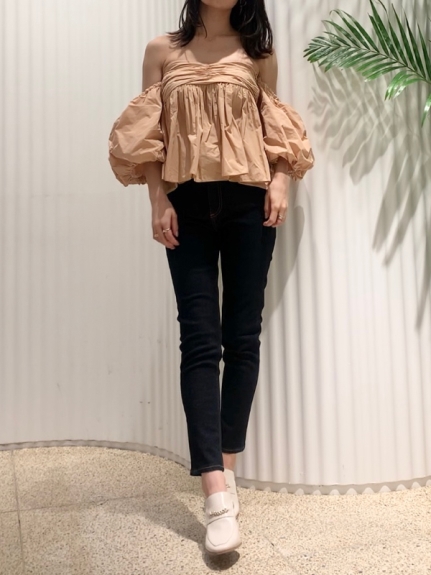 今年らしいヘルシーな肌見せで、女性らしさを存分にアピールできるオフショルブラウス。ふんわりとしたボリュームスリーブは肩に掛けたり取り外したりと自由にアレンジ可能。身頃部分にはたっぷりとギャザーを寄せ、分量感のあるフレアシルエットに仕上げています。ボトムはすっきりとしたパンツを合わせてメリハリのあるスタイリングがオススメ。
