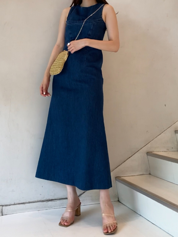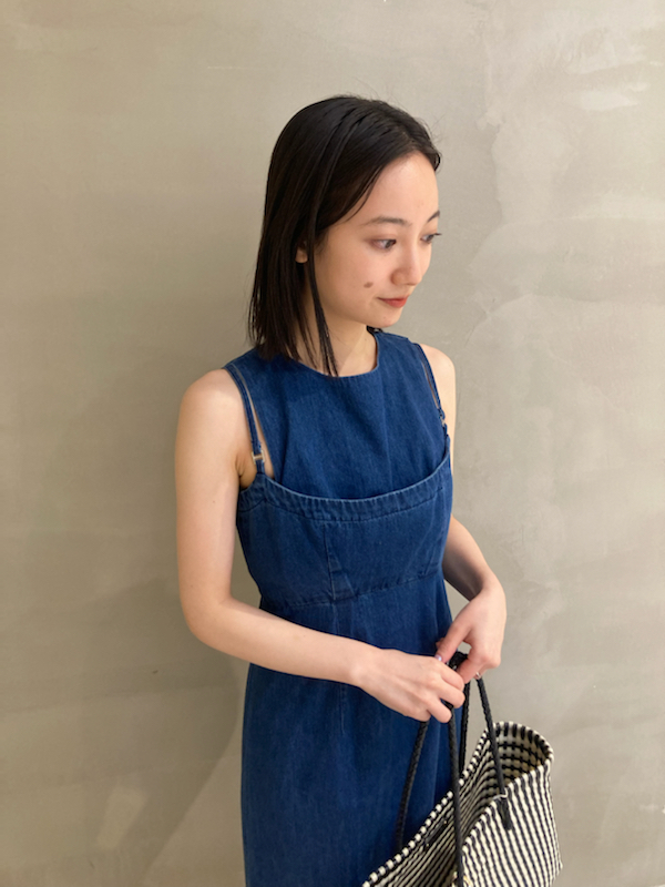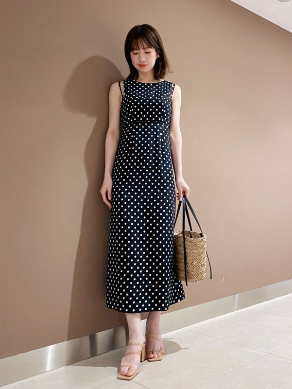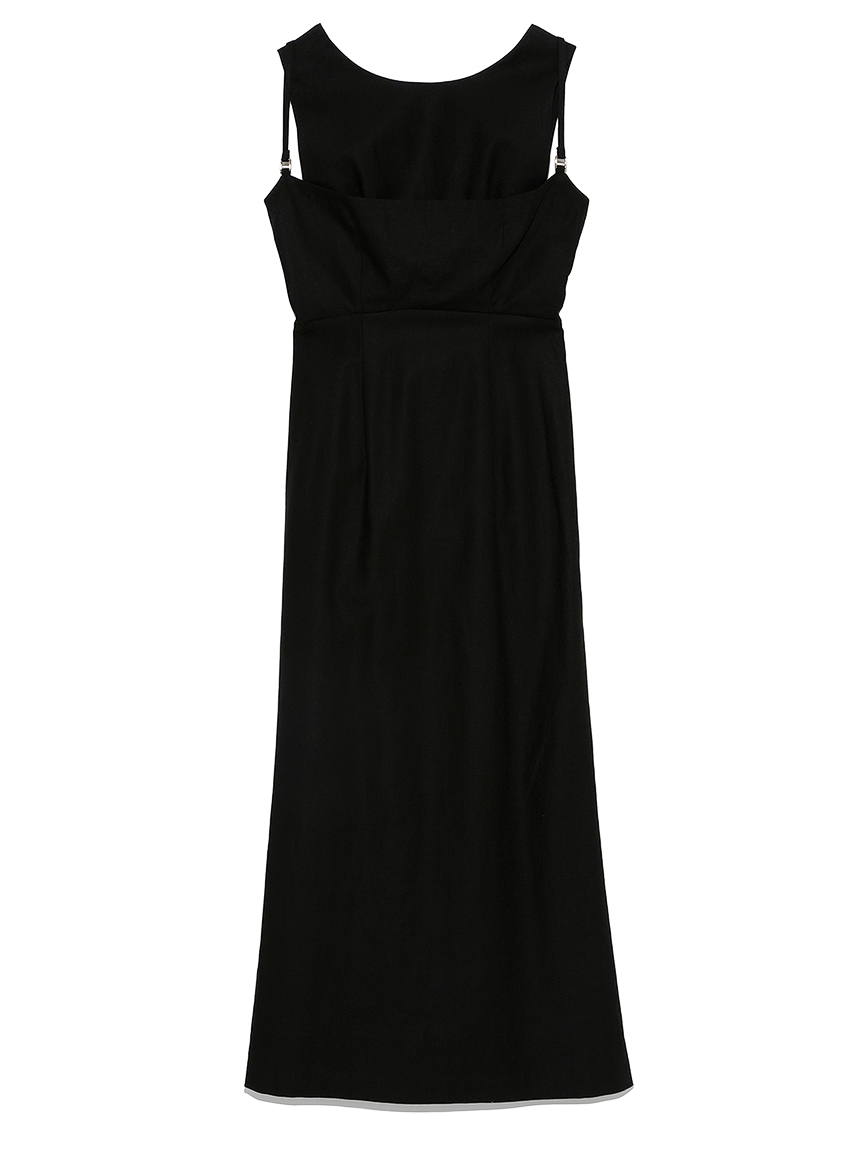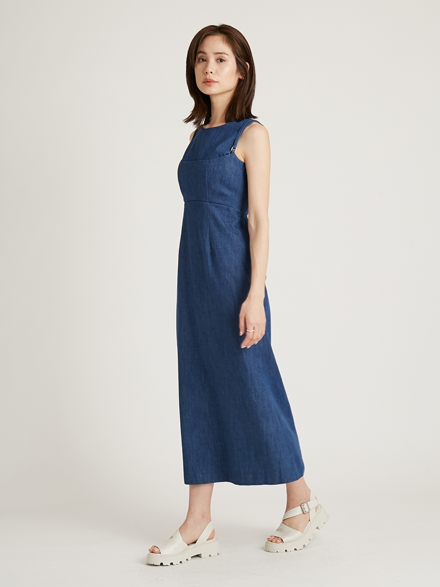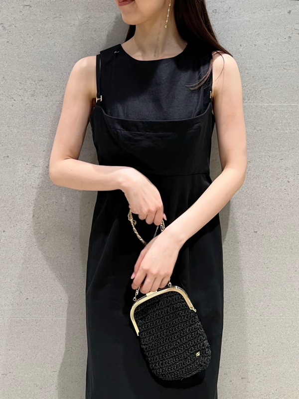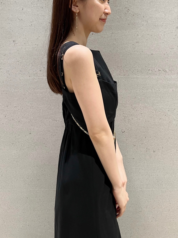 身頃部分のレイヤード風デザインがポイントになった、1枚でもお洒落度の高い着こなしを叶えるワンピース。ハイウエストの切り替えから裾に向かってゆるやかに広がるややマーメイドなラインが品の良さを感じさせる秘訣。バックネックにはビット付きのストラップをあしらい、後ろ姿まで抜かりなく仕上げています。バックウエストにはゴムを効かせているので程よい伸縮性があり、着心地も快適です。