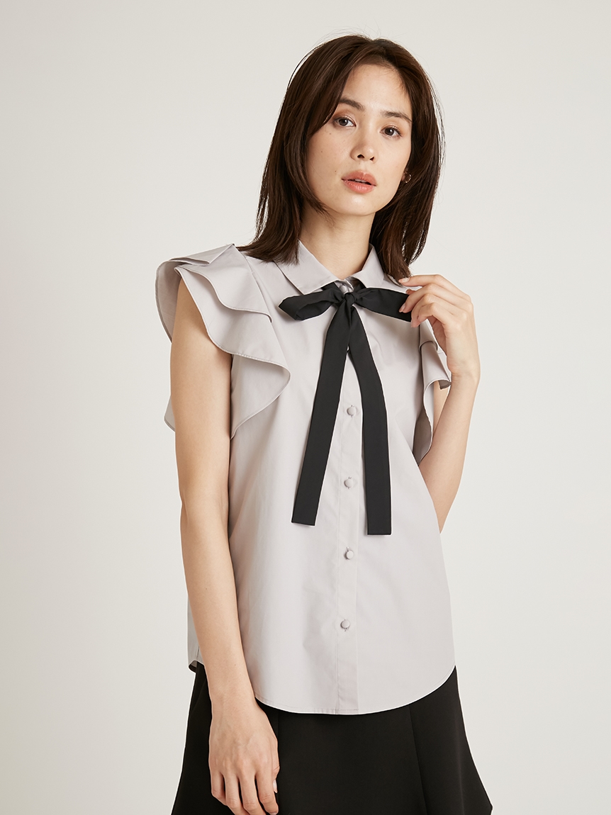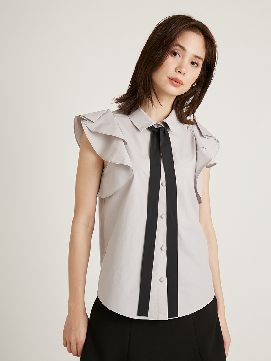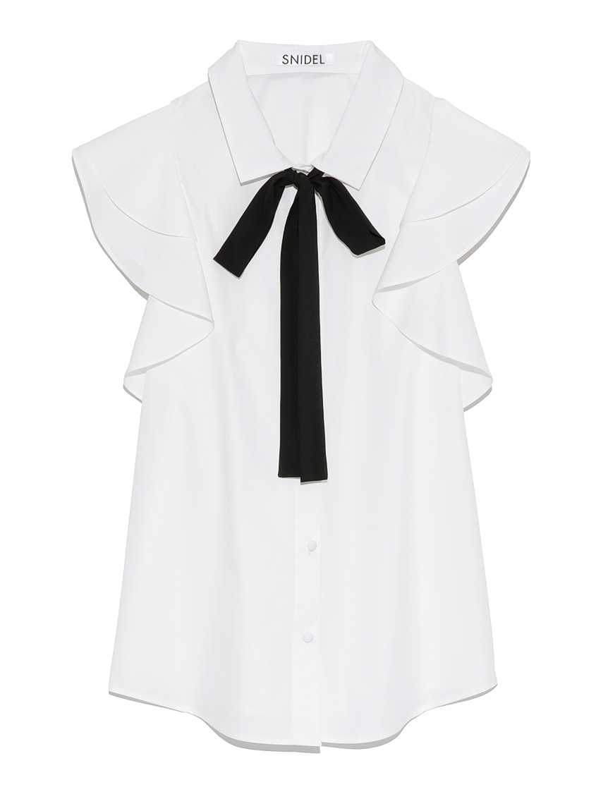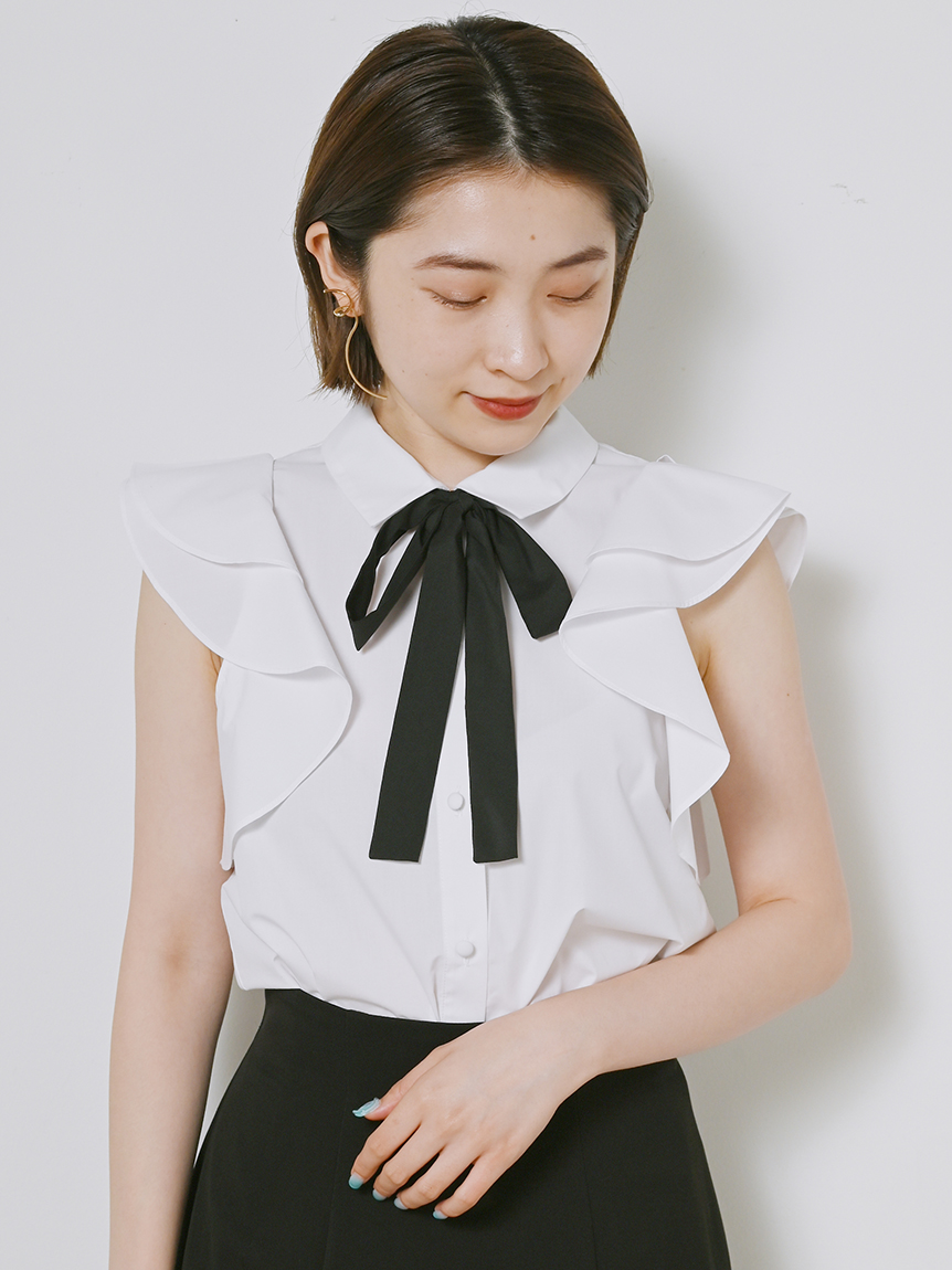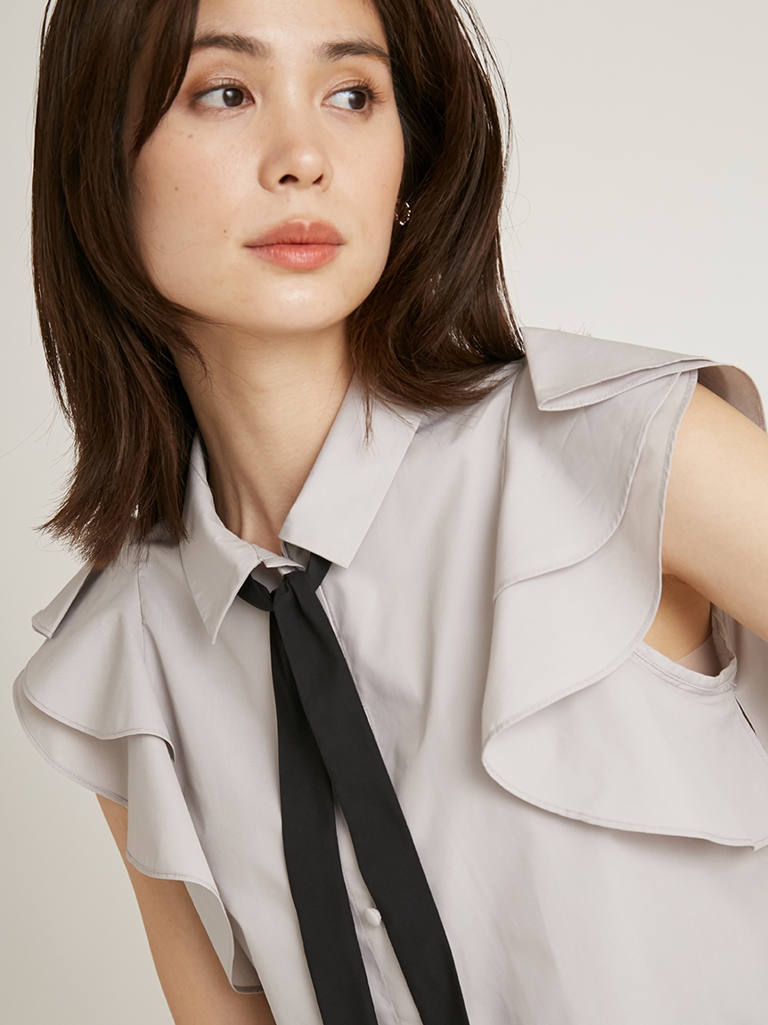 構築的なフリルやボウタイリボンがポイントになった、レディライクなノースリブラウス。パリッとしたきれいめのシャツ地を用いることで、モードなルックスに仕上げました。身頃部分はすっきりとシンプルにまとめることで、エレガントなボリュームフリルがより際立った印象に。ボトムにインしてもアウトでもバランス良く決まるので、合わせるボトムを選ばず幅広く活躍してくれます。