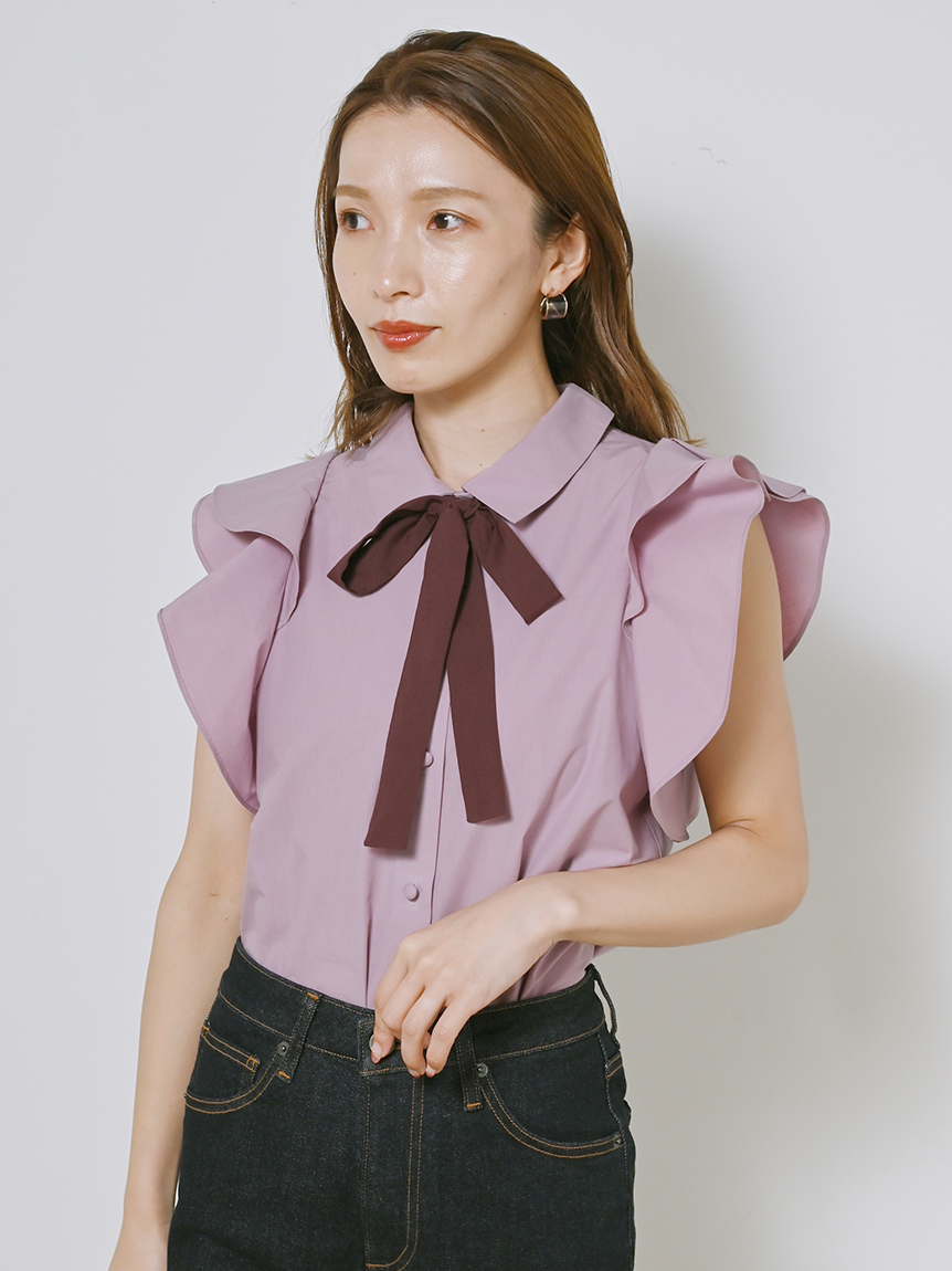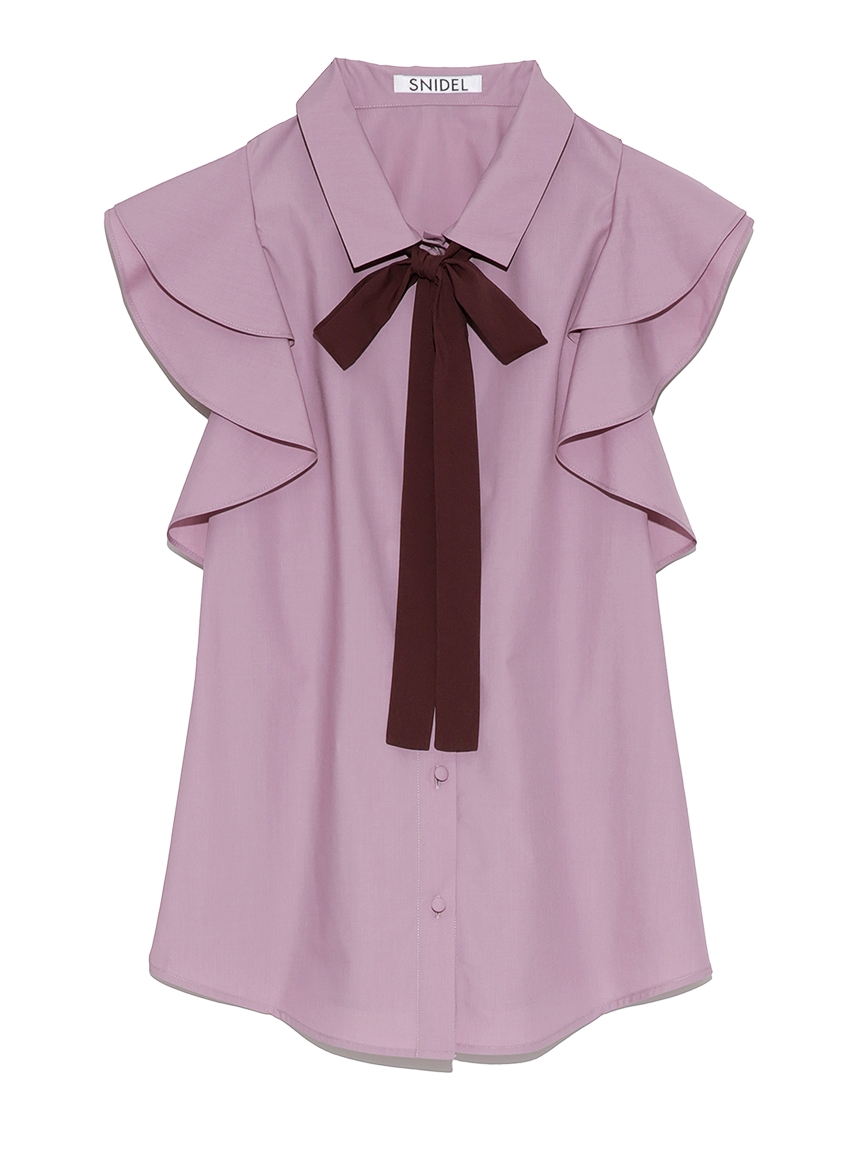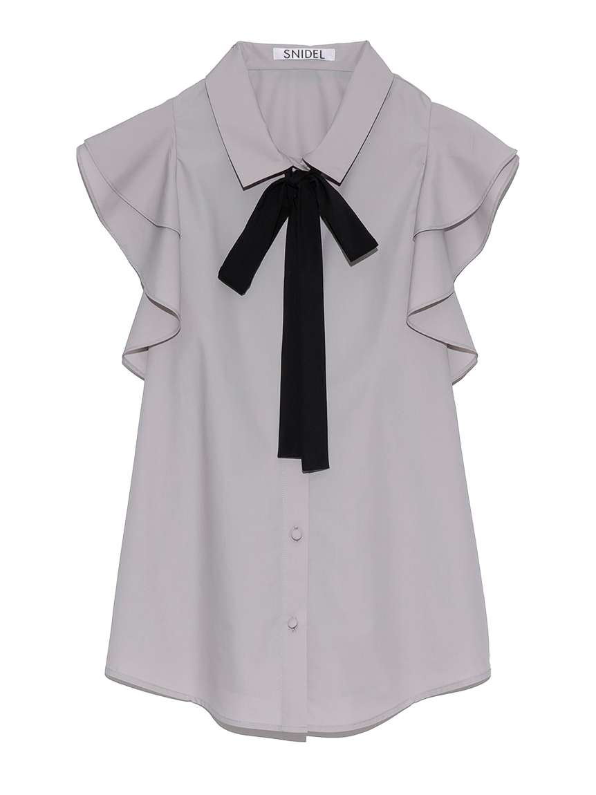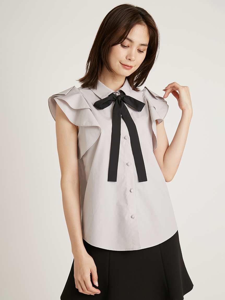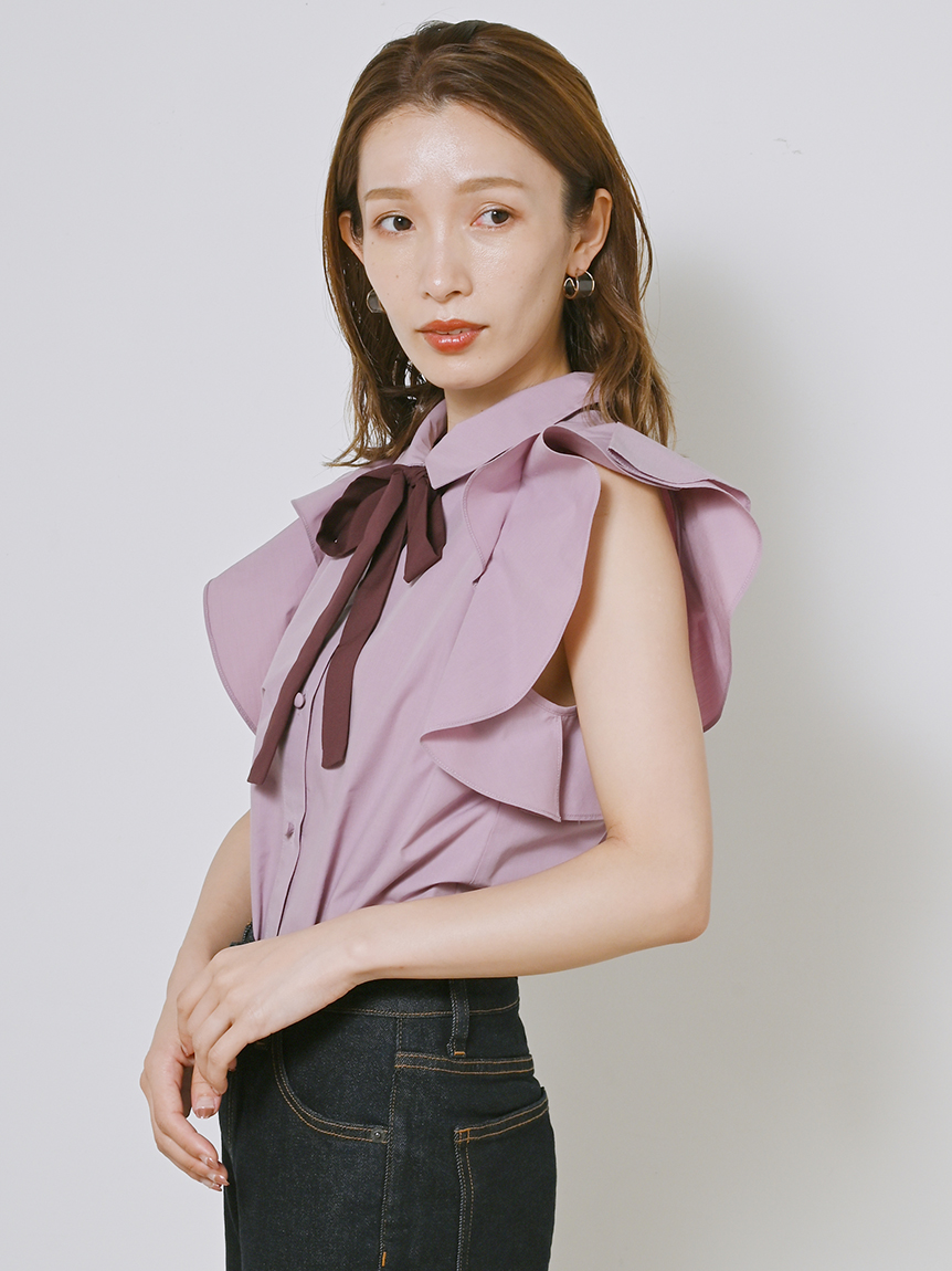 構築的なフリルやボウタイリボンがポイントになった、レディライクなノースリブラウス。パリッとしたきれいめのシャツ地を用いることで、モードなルックスに仕上げました。身頃部分はすっきりとシンプルにまとめることで、エレガントなボリュームフリルがより際立った印象に。ボトムにインしてもアウトでもバランス良く決まるので、合わせるボトムを選ばず幅広く活躍してくれます。