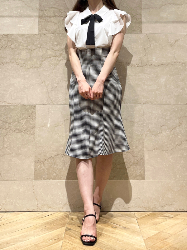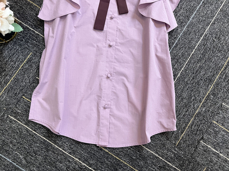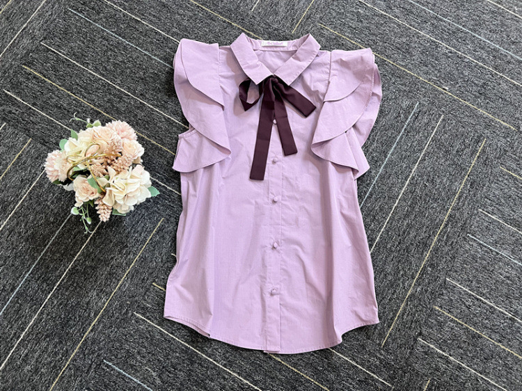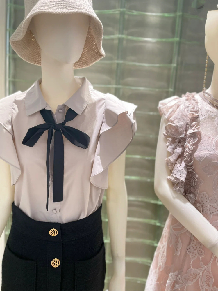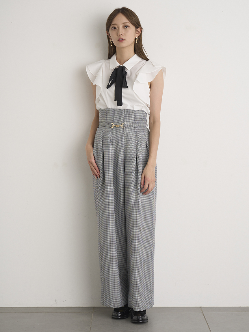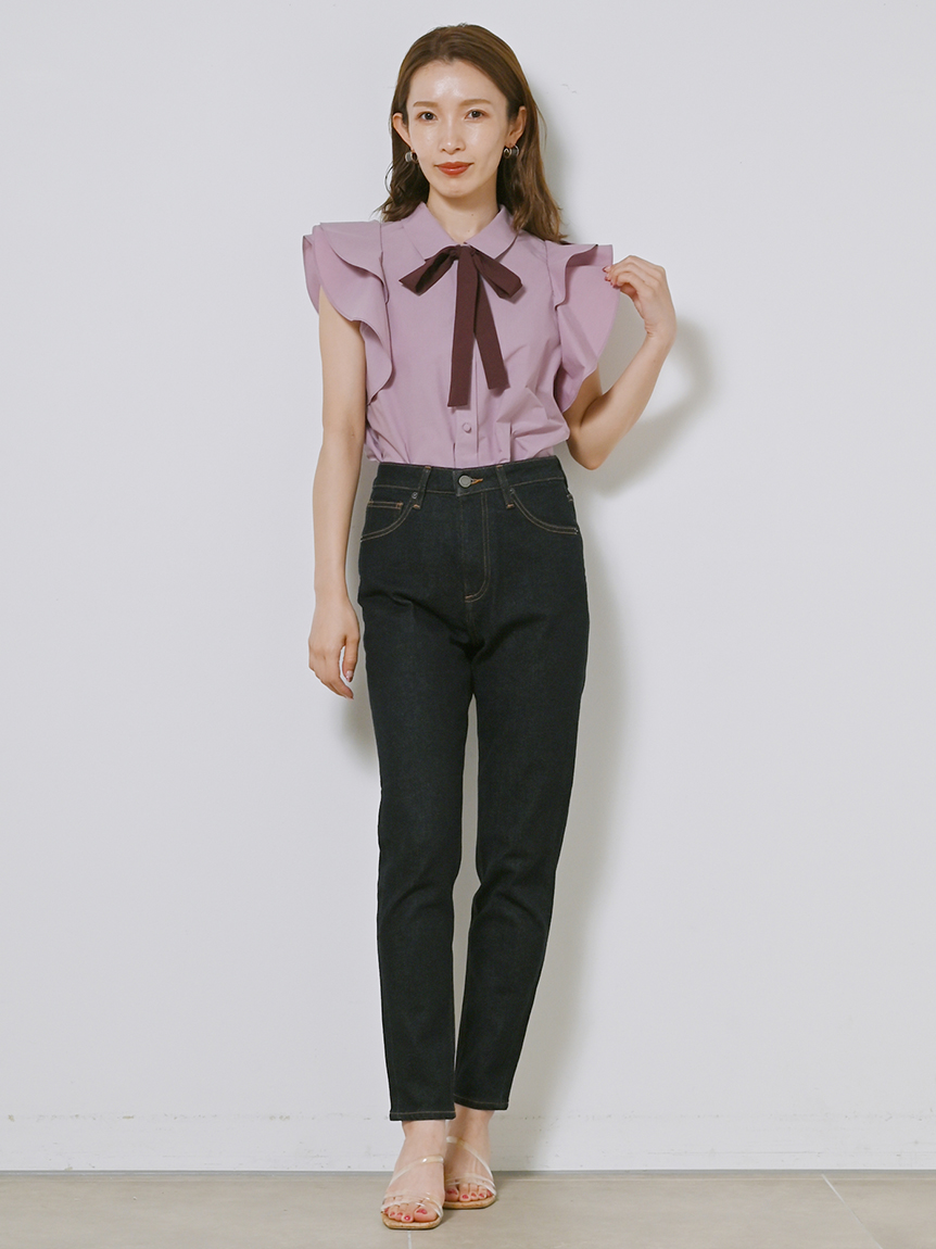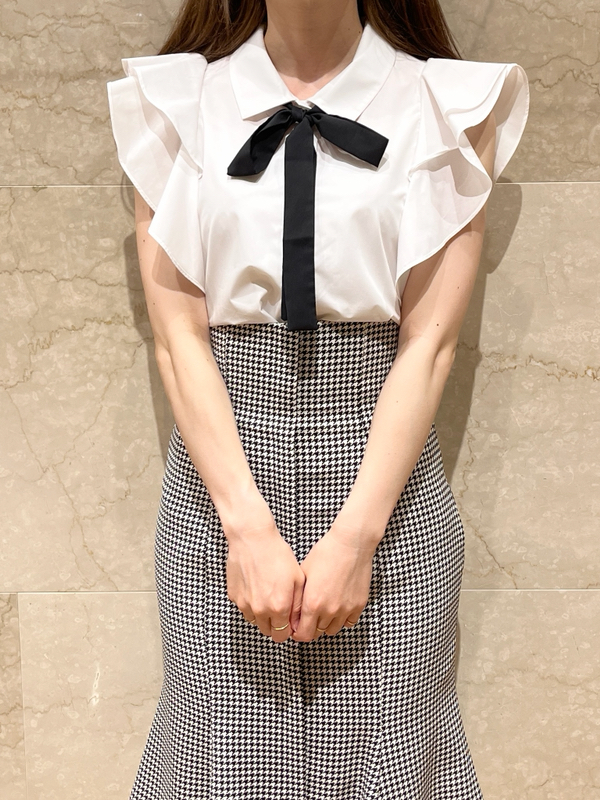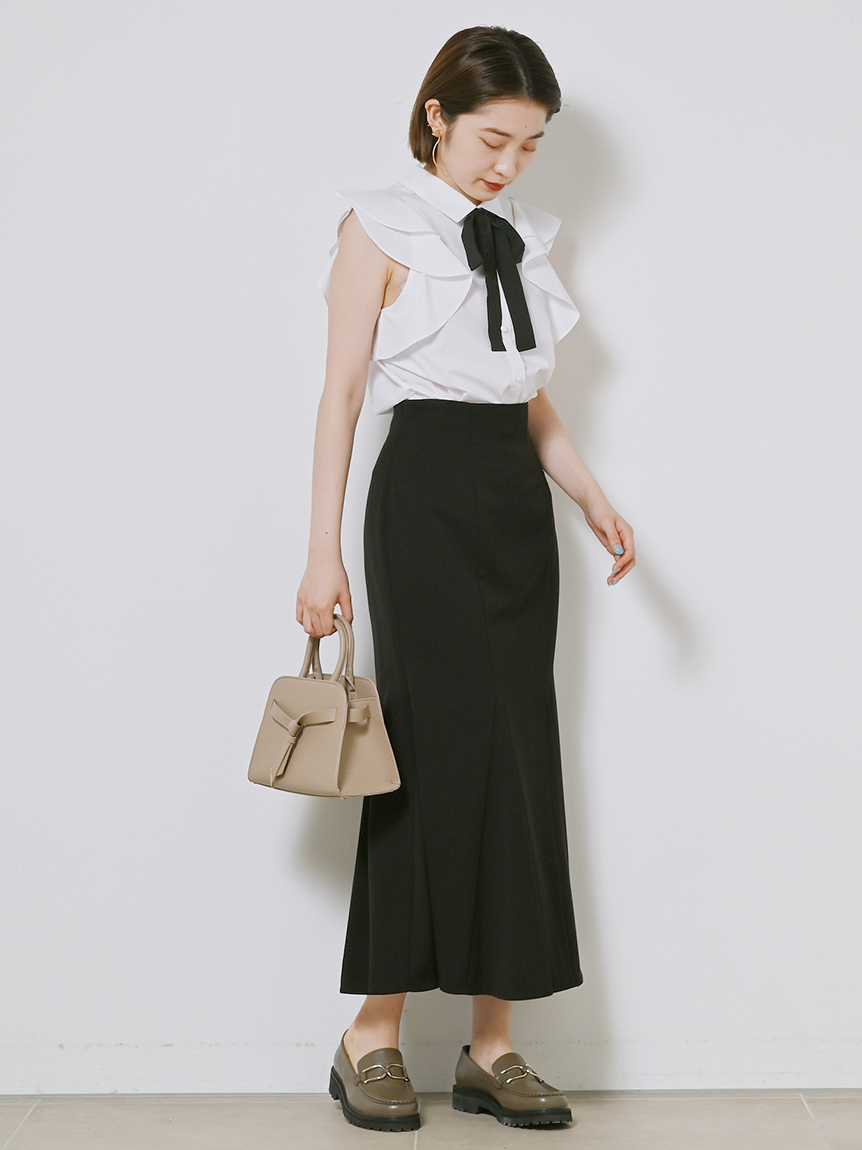 構築的なフリルやボウタイリボンがポイントになった、レディライクなノースリブラウス。パリッとしたきれいめのシャツ地を用いることで、モードなルックスに仕上げました。身頃部分はすっきりとシンプルにまとめることで、エレガントなボリュームフリルがより際立った印象に。ボトムにインしてもアウトでもバランス良く決まるので、合わせるボトムを選ばず幅広く活躍してくれます。