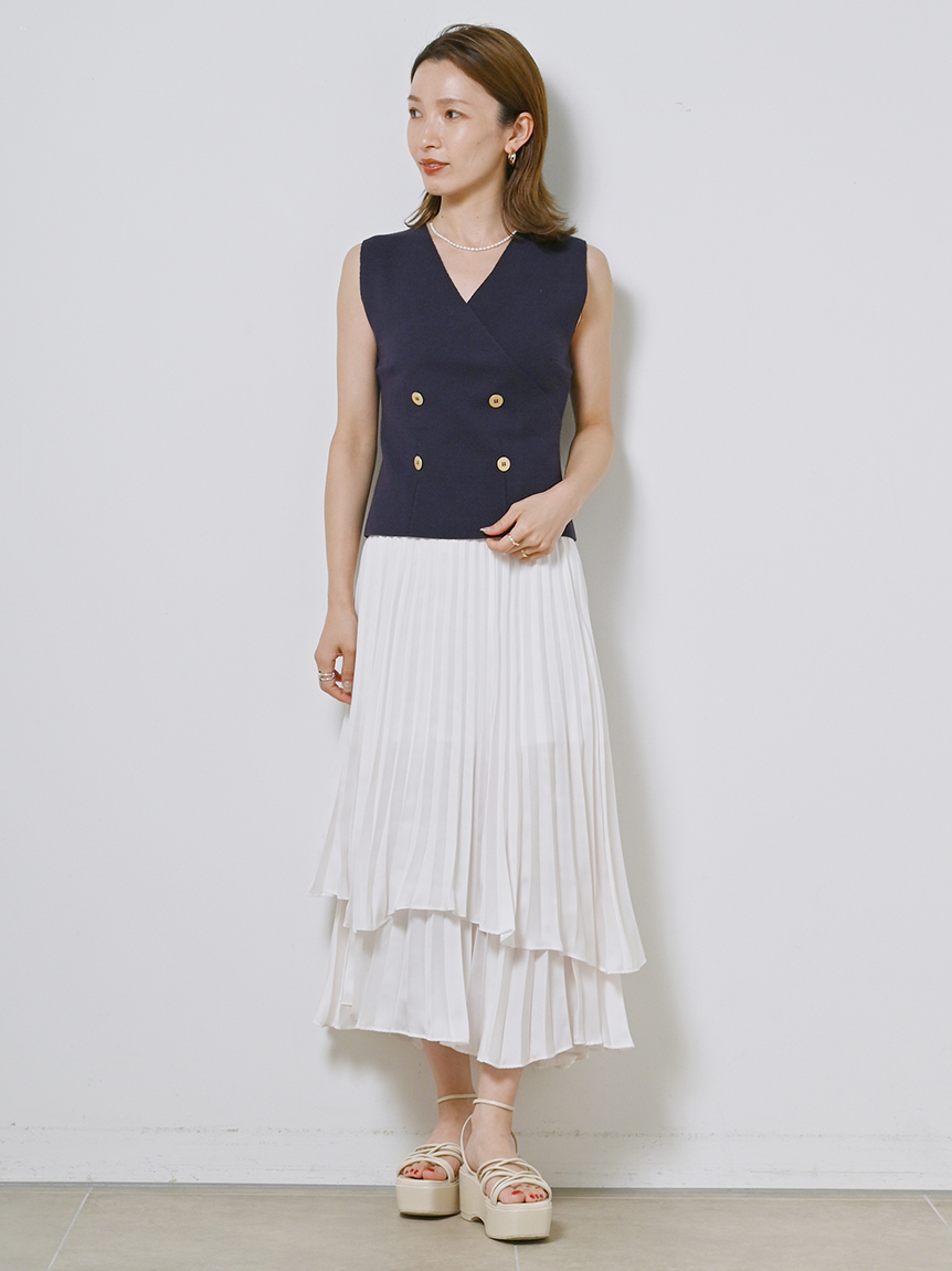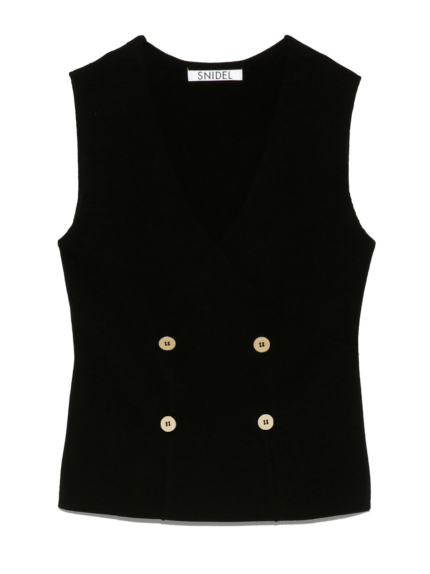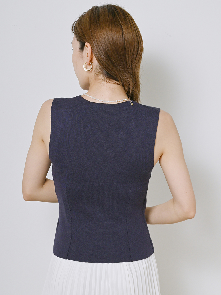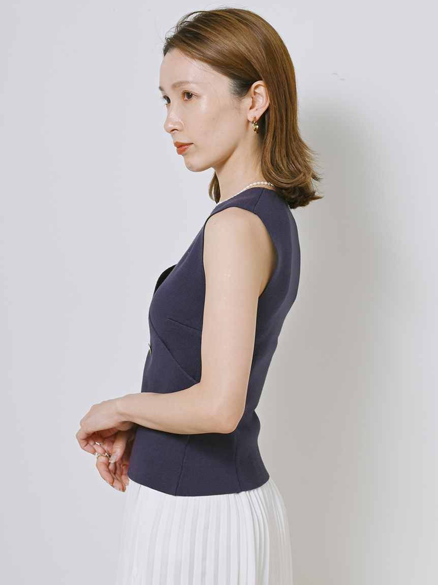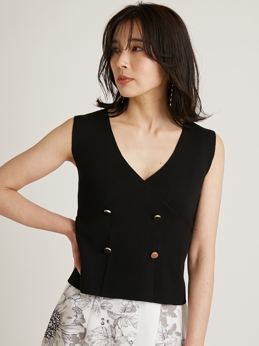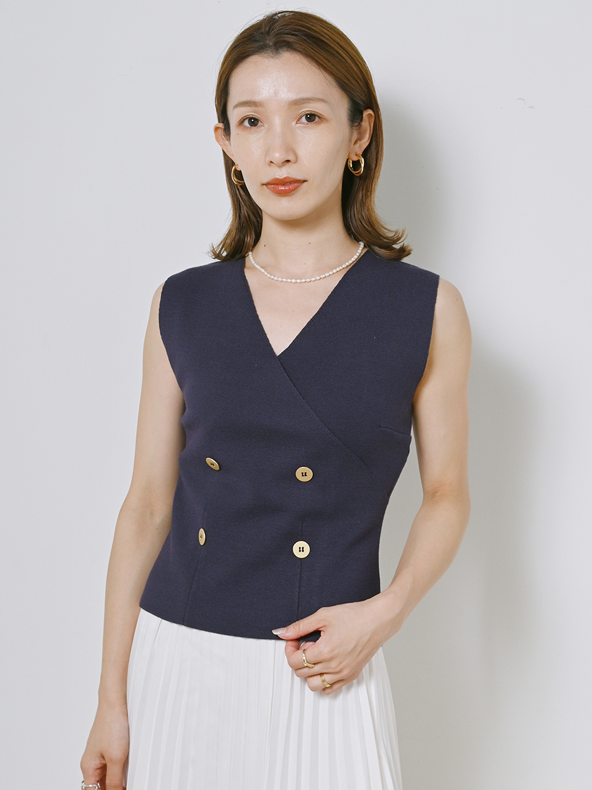 ミラノリブならではの上品な風合いがクラス感を高めるニットベスト。フロントに並べた金ボタンが、シンプルな中にアクセントを添えています。深めに開いたVネックでヘルシーな肌見せができ、女性らしさは一気に加速。体にすっきりと沿うコンパクトなシルエットなので合わせるボトムを選ばず、春夏らしいボリュームスカートともバランス良く決まります。