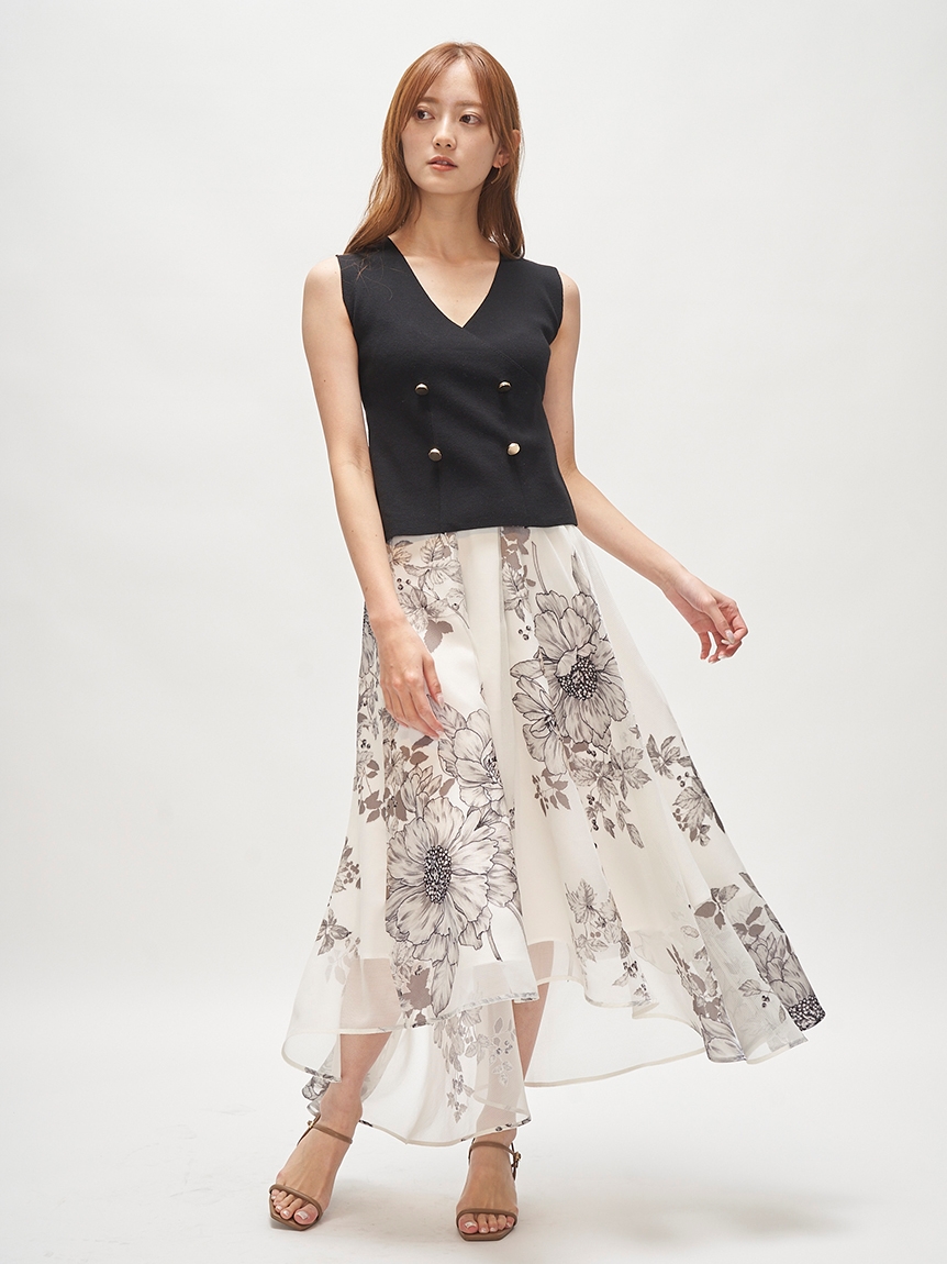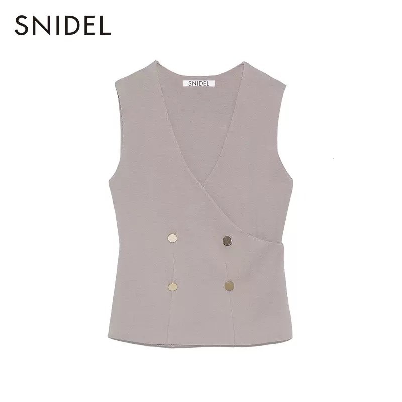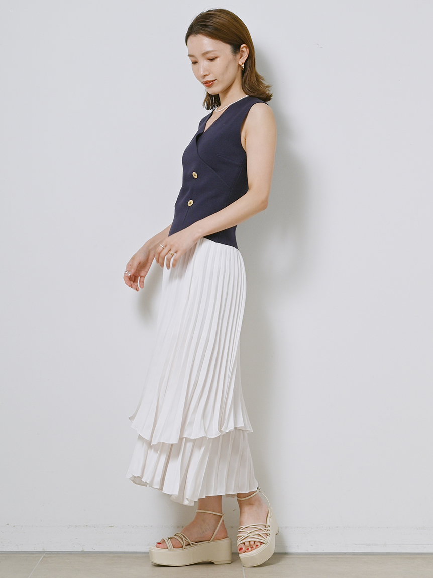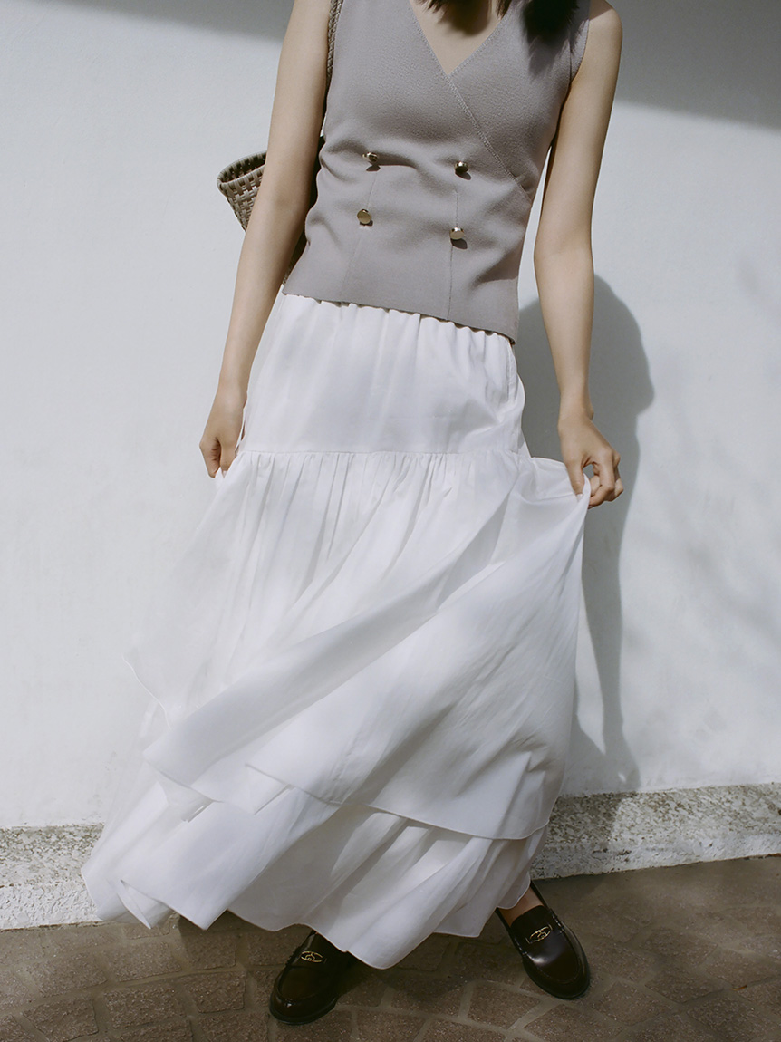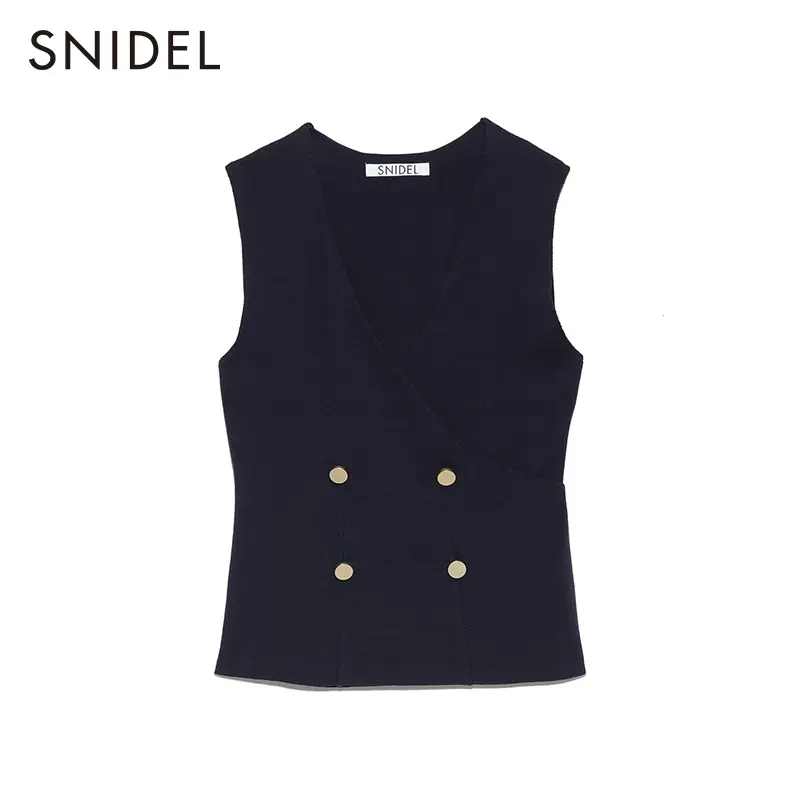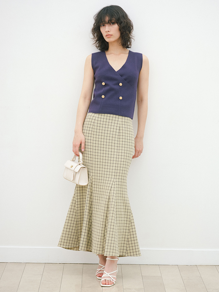 ミラノリブならではの上品な風合いがクラス感を高めるニットベスト。フロントに並べた金ボタンが、シンプルな中にアクセントを添えています。深めに開いたVネックでヘルシーな肌見せができ、女性らしさは一気に加速。体にすっきりと沿うコンパクトなシルエットなので合わせるボトムを選ばず、春夏らしいボリュームスカートともバランス良く決まります。