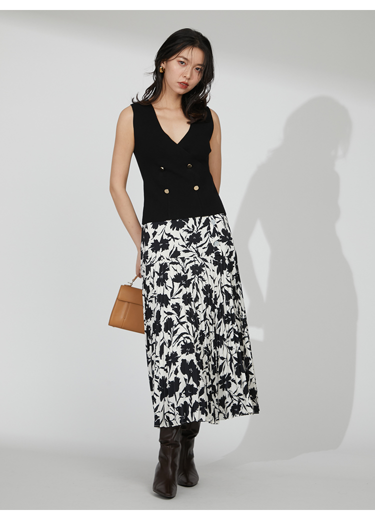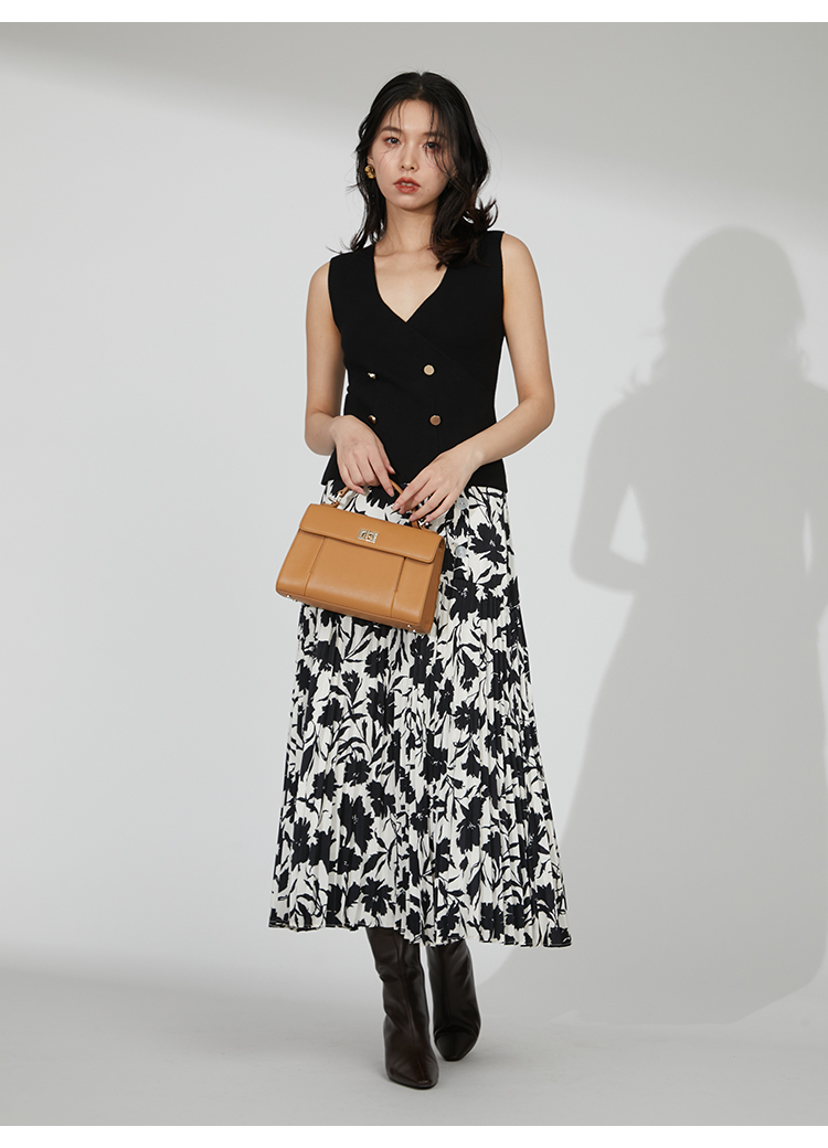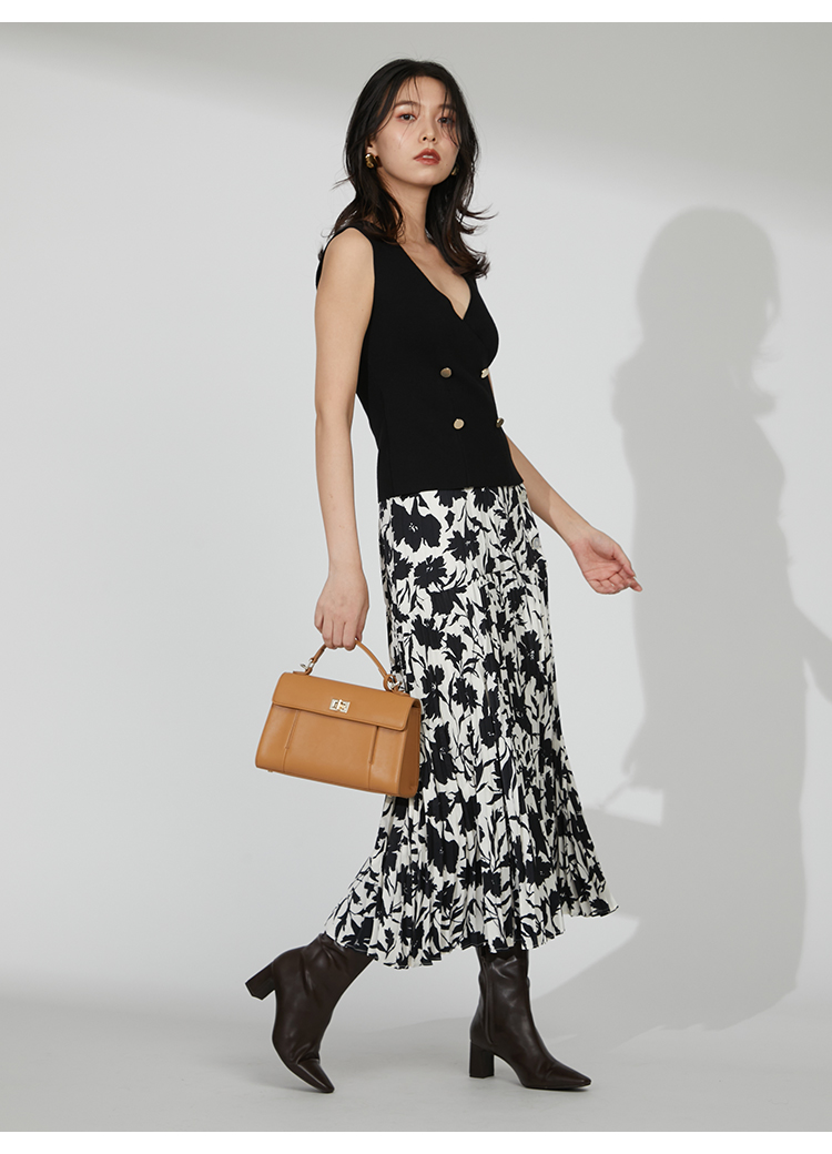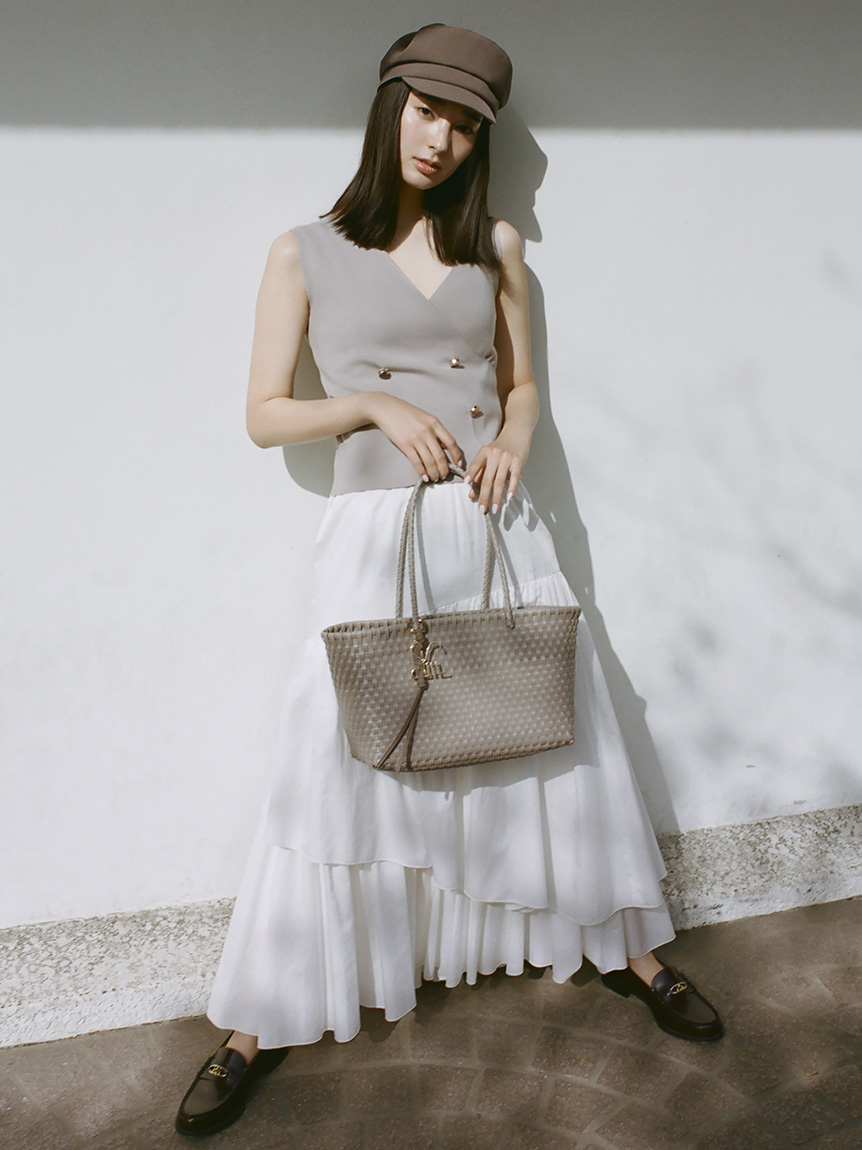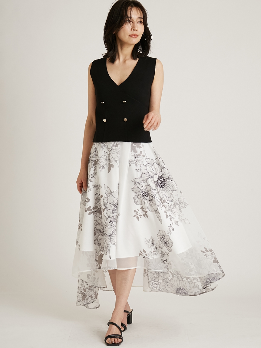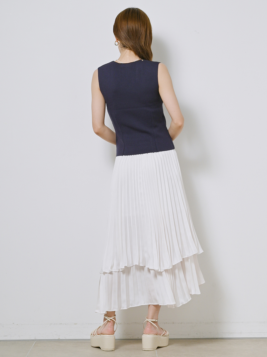 ミラノリブならではの上品な風合いがクラス感を高めるニットベスト。フロントに並べた金ボタンが、シンプルな中にアクセントを添えています。深めに開いたVネックでヘルシーな肌見せができ、女性らしさは一気に加速。体にすっきりと沿うコンパクトなシルエットなので合わせるボトムを選ばず、春夏らしいボリュームスカートともバランス良く決まります。