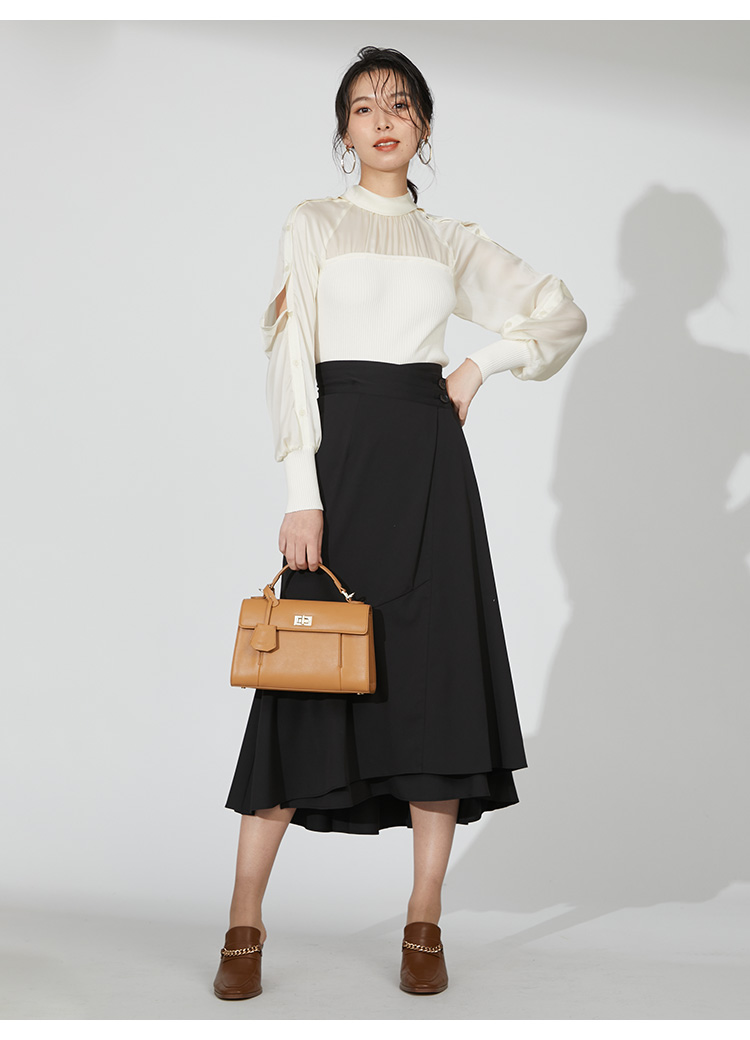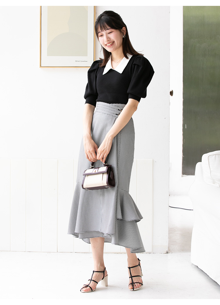 毎回人気を集める定番のマーメイドスカートにウエストデザインをプラスしモードにアップデート。ステッチのアクセントやマチで立体感を出したフロント、アシンメトリーなヘムラインなど、細部までこだわりを感じさせる1着です。ニットやカットソー、ブラウスまで様々なトップスと合わせやすいのも嬉しい。ウエストにインしてすっきりとまとめればスタイルアップ効果も絶大です。