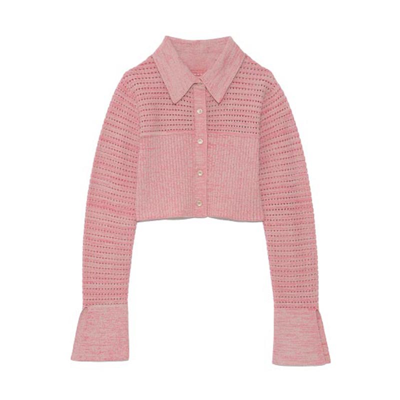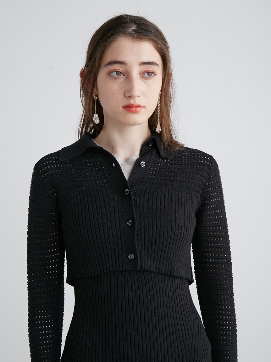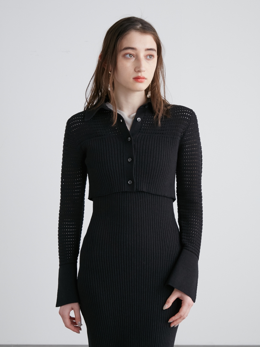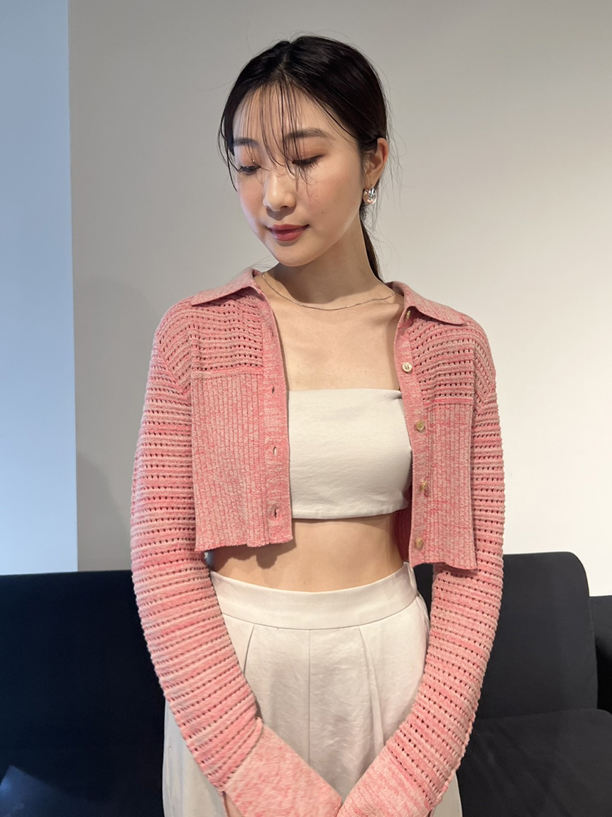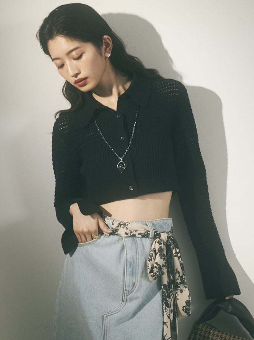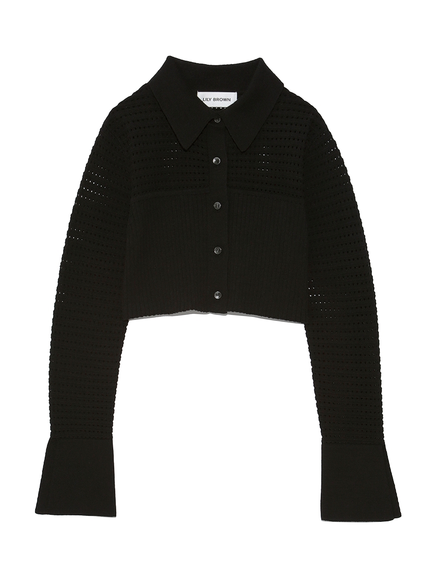 ポロニットカーデイガンをショート丈に仕立てトレンドライクに仕上げました。バスト上とスリーブの編み地は透かし柄にし表情にアクセントをプラスしています。カフスは総針でスリットを入れ、今年らしい抜け感を演出。コンパクトなシルエットなので様々なボトムと合わせやすく、同シリーズのワンピース(LWNO224003)とセットで合わせるコーディネートもおすすめです。